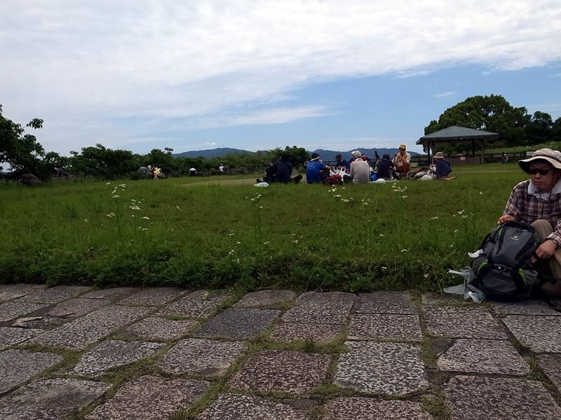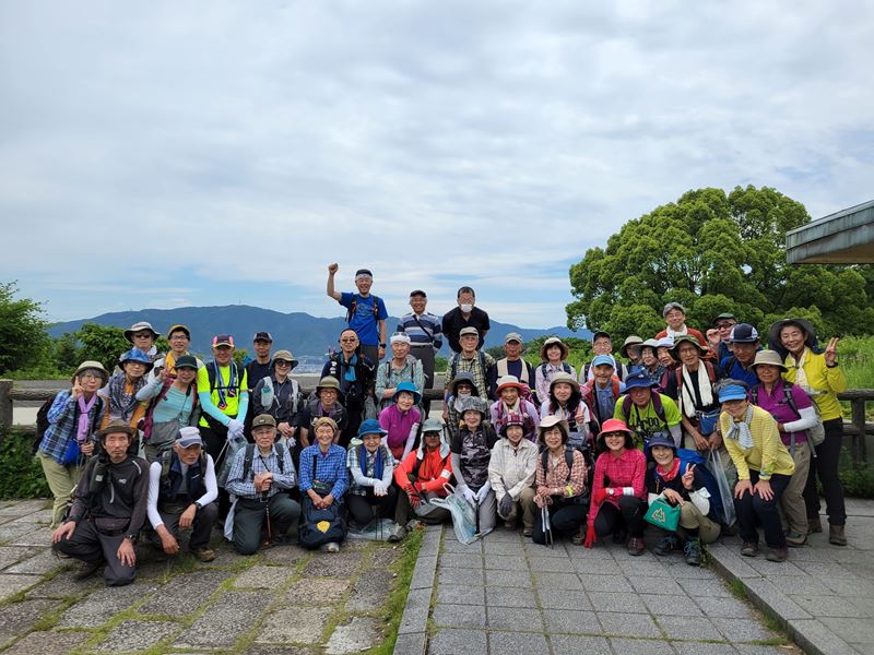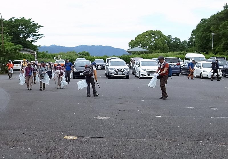 将軍塚の公園で昼食 山を背景に集合写真を撮る、公園の駐車場もゴミが多い。