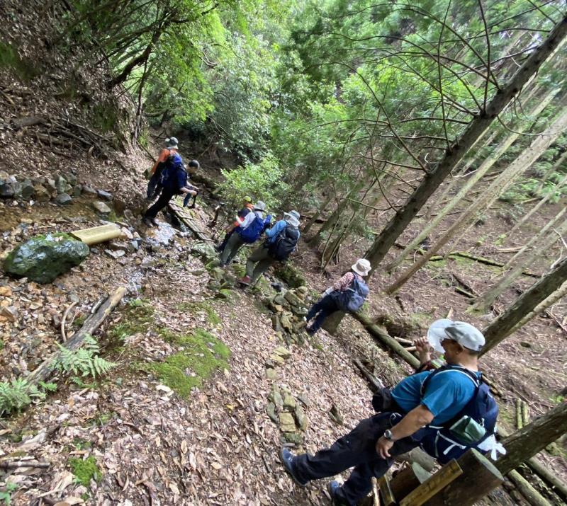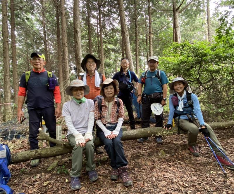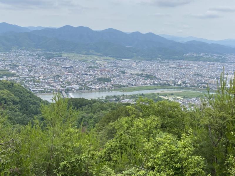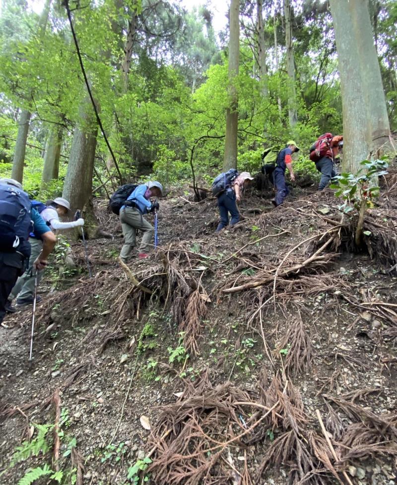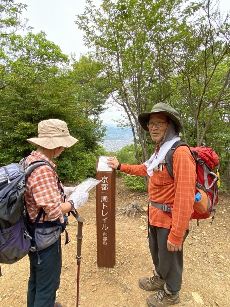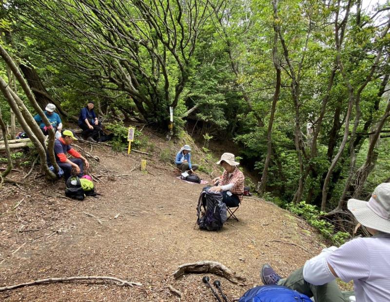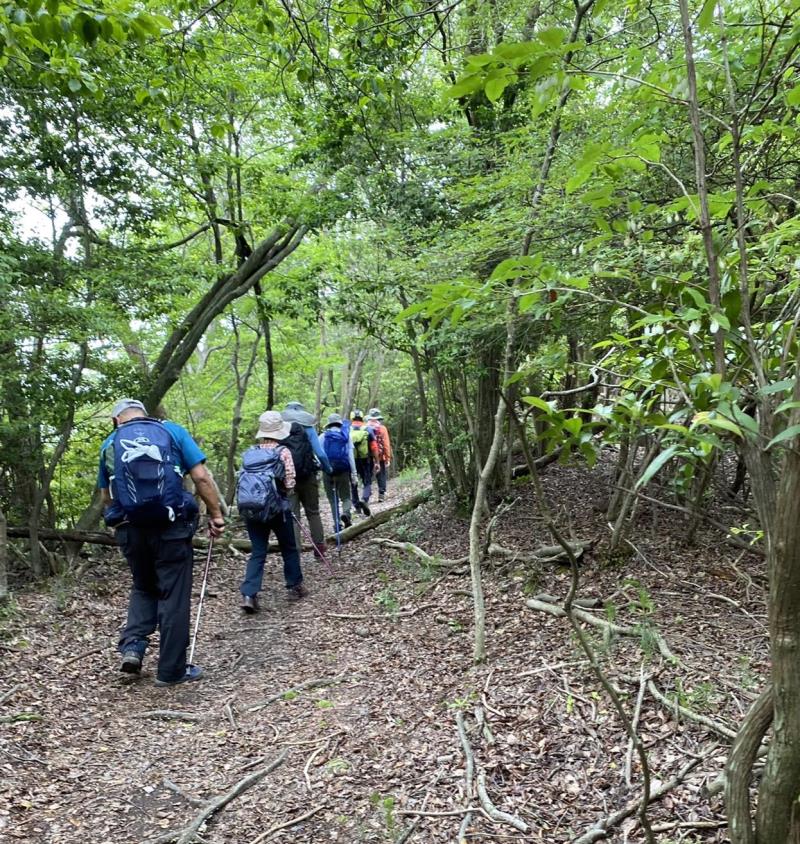 (例会№9633) 6月10日(土)山上ヶ峰例会。9:15 JR保津峡駅からスタート。スタート早々トラブル。通行止めでトロッコ保津峡駅へ通行できない。トロッコ利用者なら歩ける。登山者、ハイカーは通行させたらいけないと、市から言われていると。どうにか交渉、理解ある警備員さんに助けられ、トロッコ利用者として通行止め区間を通過できました。ロータリー、山上ヶ峰、新烏ヶ岳、烏ヶ岳、嵐山、松尾山を経由、苔寺ゲートへ。15:15、6時間。あっという間でしたが結構足と体にこたえる山行でした。松尾山から西芳寺川古墳へは、地元のメンバーが開拓されている新ルートを通っておりてきました。(GPXファイルはありません)
