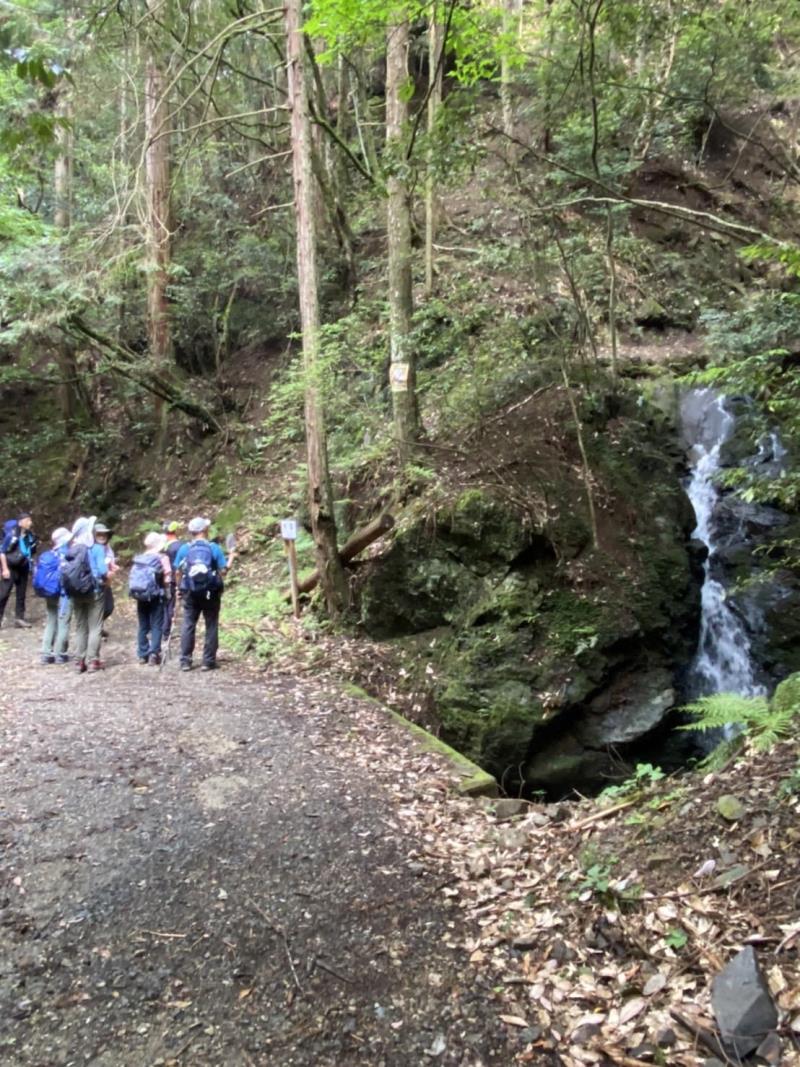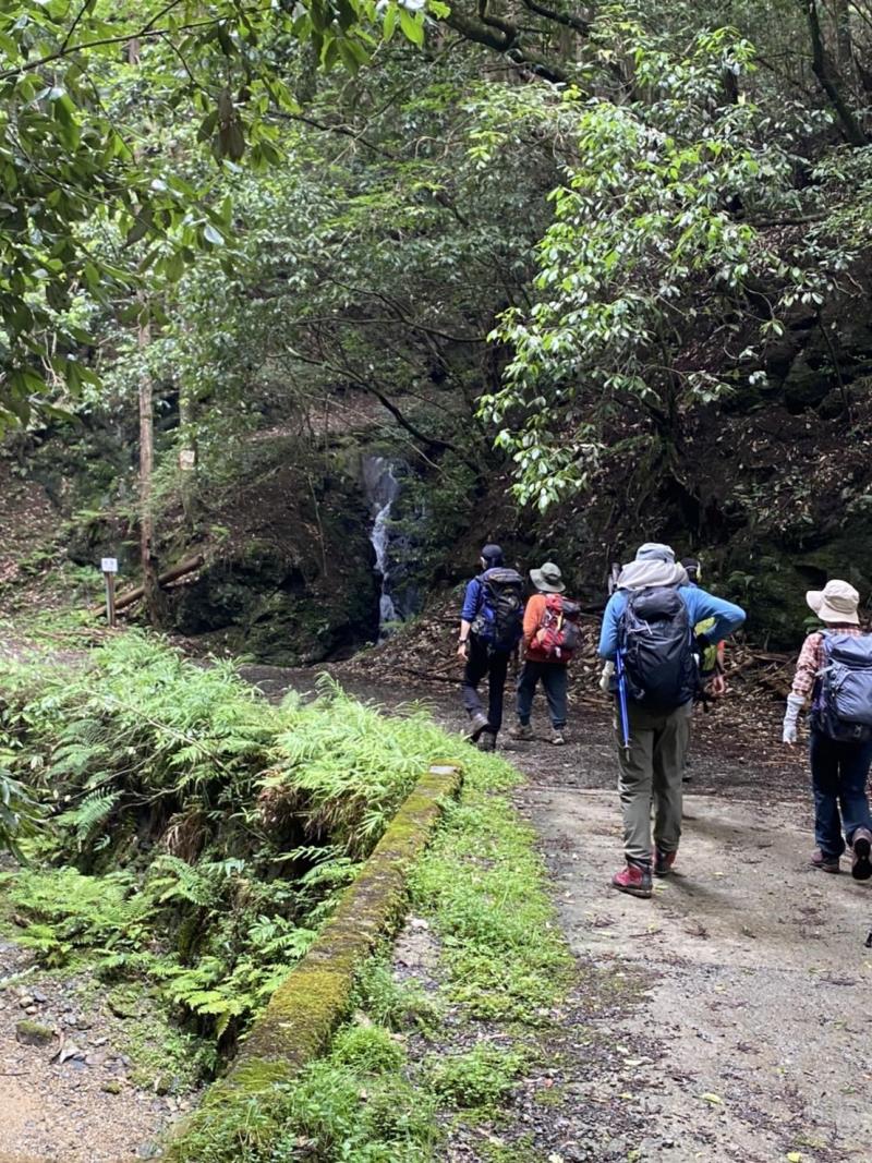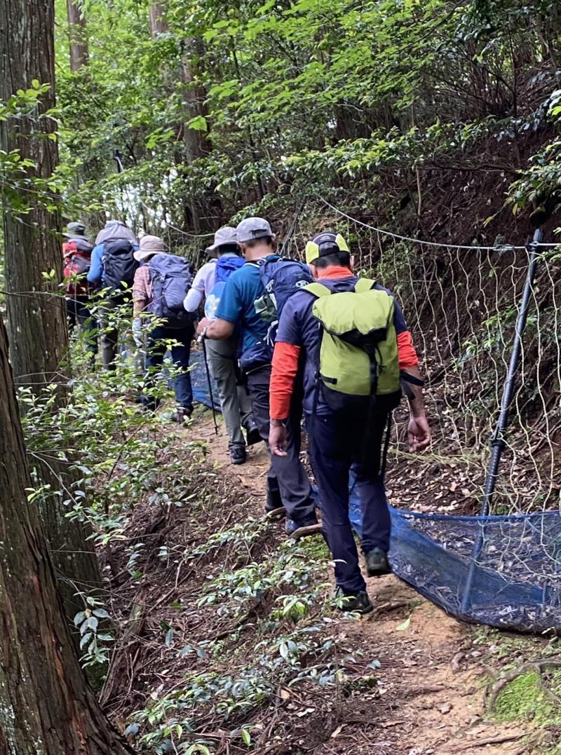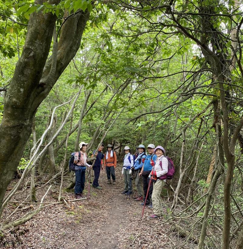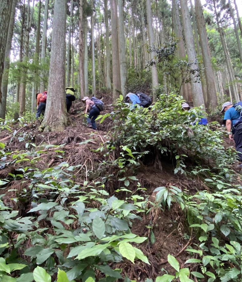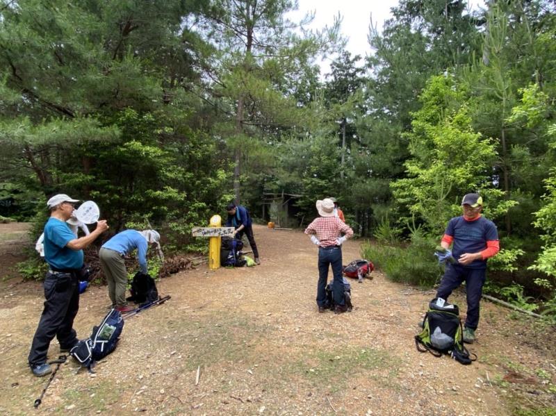(例会№9633) 6月10日(土)山上ヶ峰例会。9:15 JR保津峡駅からスタート。スタート早々トラブル。通行止めでトロッコ保津峡駅へ通行できない。トロッコ利用者なら歩ける。登山者、ハイカーは通行させたらいけないと、市から言われていると。どうにか交渉、理解ある警備員さんに助けられ、トロッコ利用者として通行止め区間を通過できました。ロータリー、山上ヶ峰、新烏ヶ岳、烏ヶ岳、嵐山、松尾山を経由、苔寺ゲートへ。15:15、6時間。あっという間でしたが結構足と体にこたえる山行でした。松尾山から西芳寺川古墳へは、地元のメンバーが開拓されている新ルートを通っておりてきました。(GPXファイルはありません)