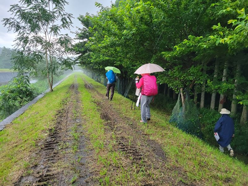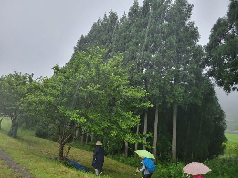 一寸、寂しかったが、その分、皆さんは野の花、木々、野鳥の鳴き声、田園風景そしてビッグシーンは「可愛い、小鹿のバンビ」に遭いました。プラスは午後から2回、「集中豪雨」に遭いゴールでは「ずぶ濡れ」でも「スコール!」でした。(K.Y)