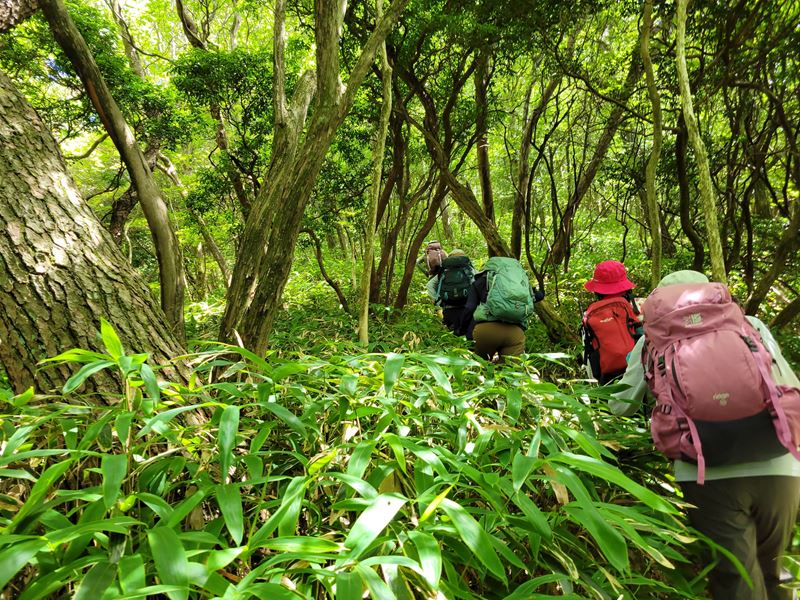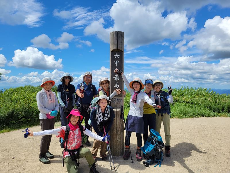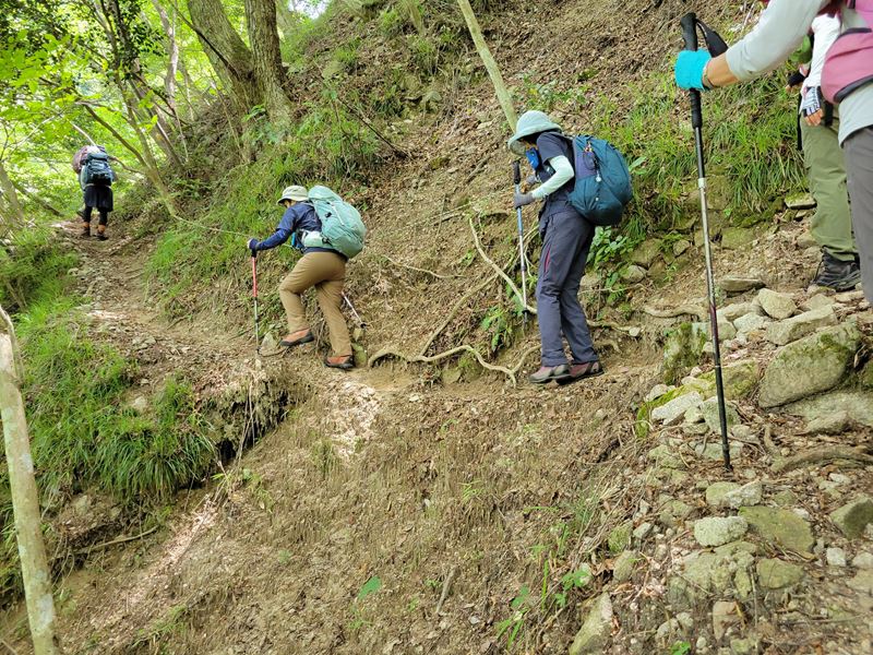 滝壺の近くでオゾンを浴びながらの昼食後 ロープ頼りの急登を経て谷を離れ六甲山頂へ向かいましたが、またしても細尾根の急登で、酷暑のなか一番つらい時間帯となりました。2時前に六甲最高峰に到着、やはり人も少なかったです。