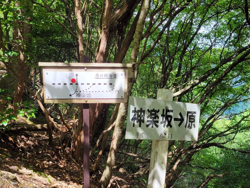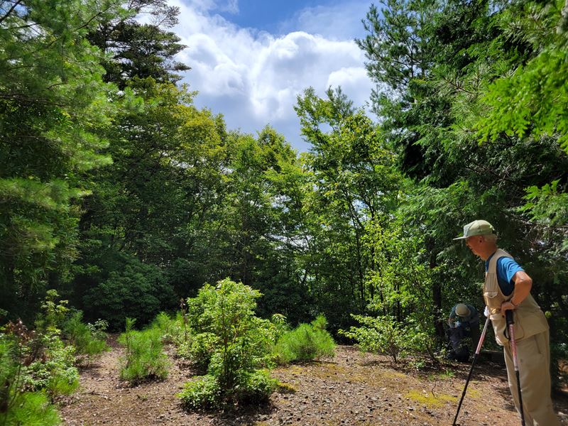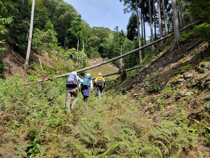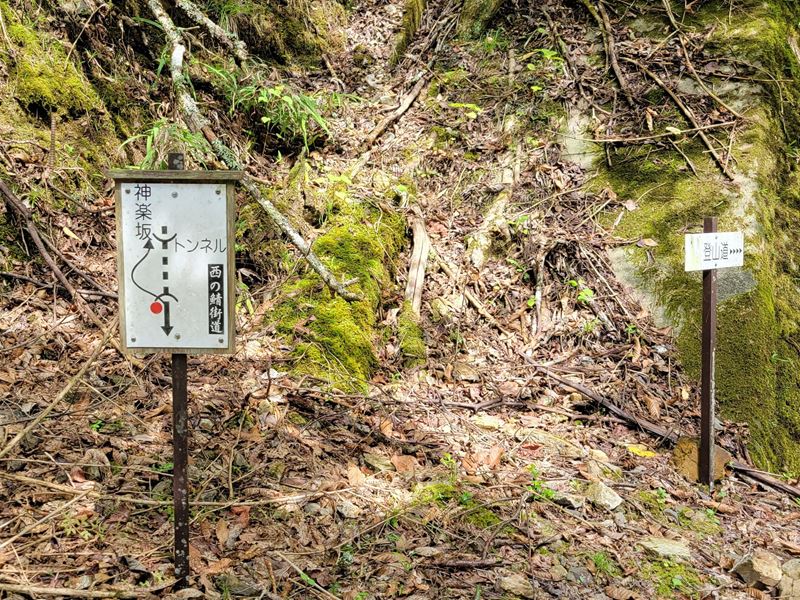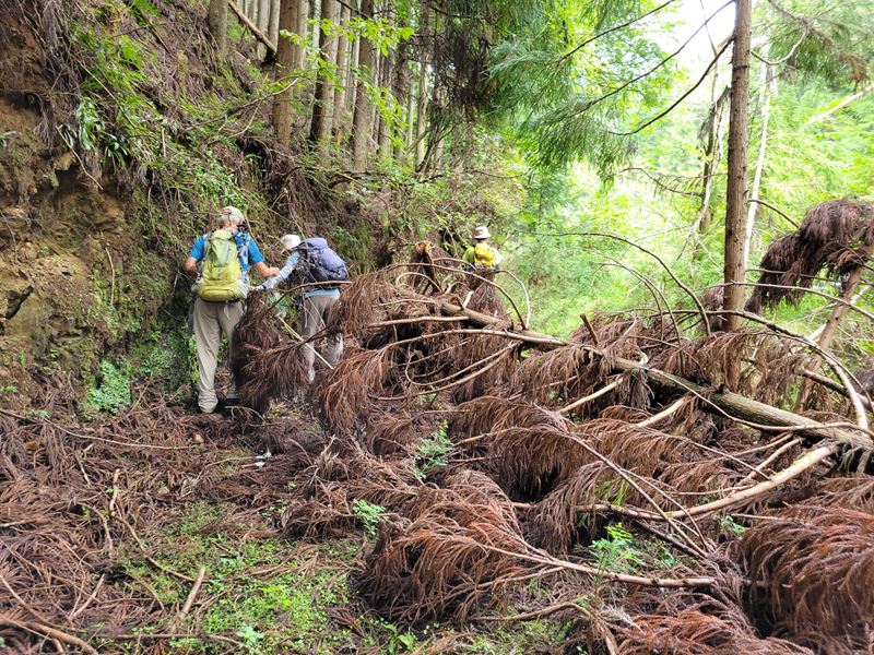 朝から涼しく今日一日、よい「山行日和」が期待できそう。園部で乗り換えJR日吉駅、南丹バスで「下佐々江」へ、ここから「山行」開始。府道を2km先の「神楽坂トンネル」の横に「登山道」の表示、一息ついてスタート。最初は緩い綴れ折り坂道だが、強敵が「クモの巣」、「ブッシュ」、「倒木」で「悪戦苦闘」。ここで気付いた、今の若者はトンネルを通過するほうが「短時間」、「楽」だから「峠の道」を避ける?大型車に挟まれる。我々「好齢者?」は「峠の道」で良いのだ。