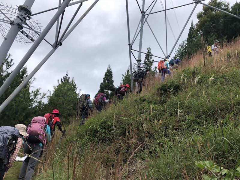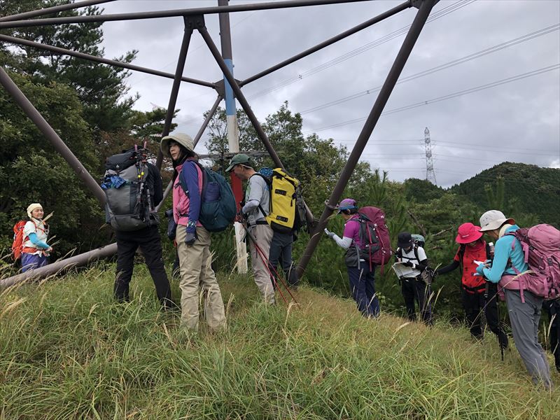 地図を手放すことなく、周りの景色や地形の説明を受けながら歩きます。今回は鉄塔、送電線、巡視路がとても頼りになりました。