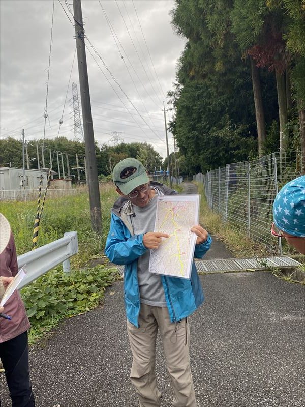 9月3日の机上講習会で各自作成した地図と、今日のために用意した地図を持って集合。机上講習会で作った地図と今日実際に歩いたルートと、どこがどんな風に違っているか後で見てみましょうと、リーダーの言葉。