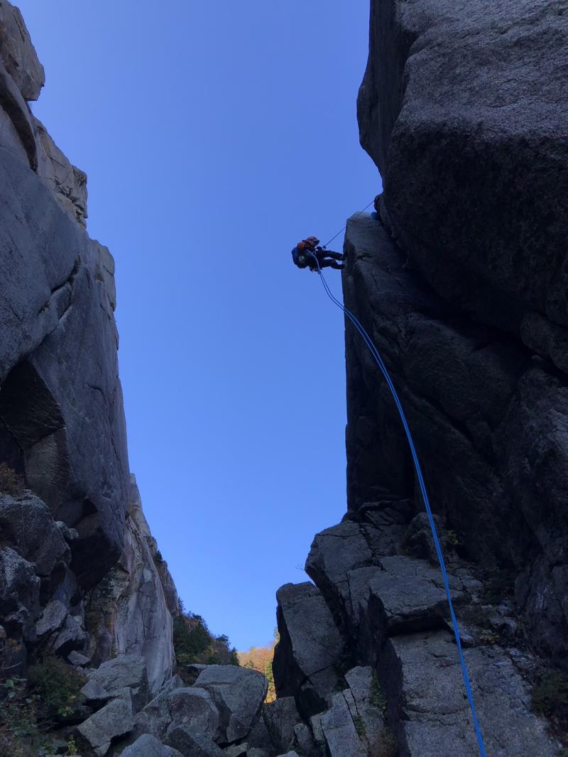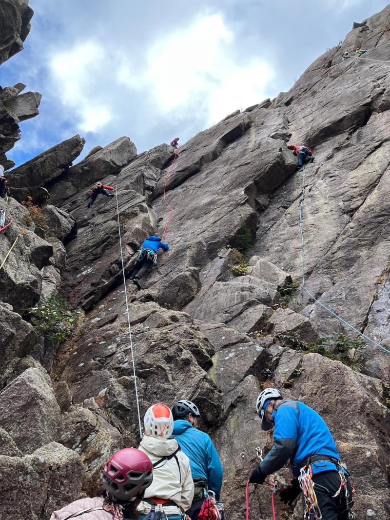 翌日曜日は早朝から前尾根班と中尾根班に分かれて、マルチピッチクライミング開始。前尾根班は、取付けに到着すると先行パーティがすでに3組、約2時間の待った後に4パーティ8名がスタート。風がきつく吹いている中、つるべで登りました。想定以上に、待ち時間が長くなり、ヤグラに着いたのは午後3時。時間切れの為、ヤグラはあきらめ前壁ルンゼを下降しました。藤内小屋で先に到着していた中尾根班と合流し、下山となりました。