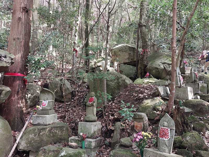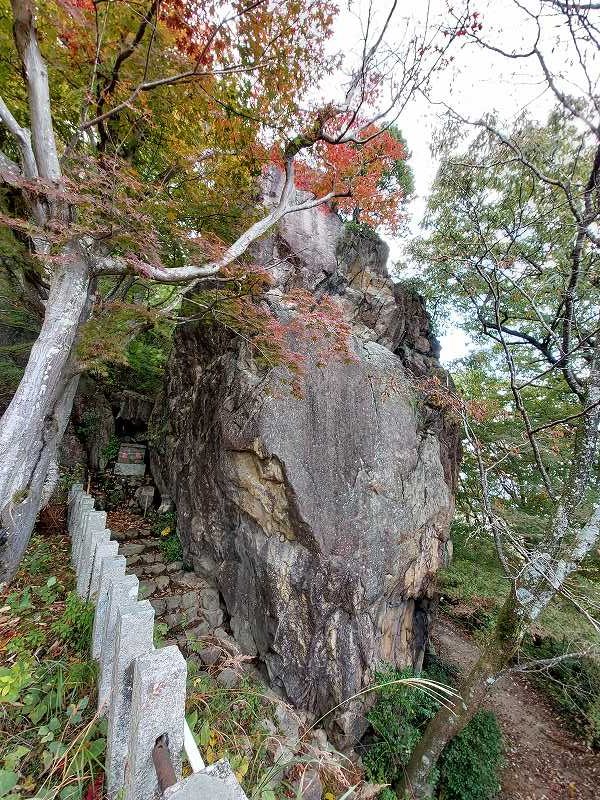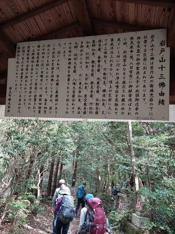 登山口から岩戸山までたくさんの石仏を見ながらきつい階段を登る。登りつめて巨岩が現れると岩戸山だ。聖徳太子が一枚岩に爪で彫ったとされている13体の仏像は年に一回千日会が開かれているとのこと。