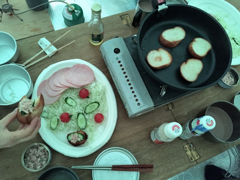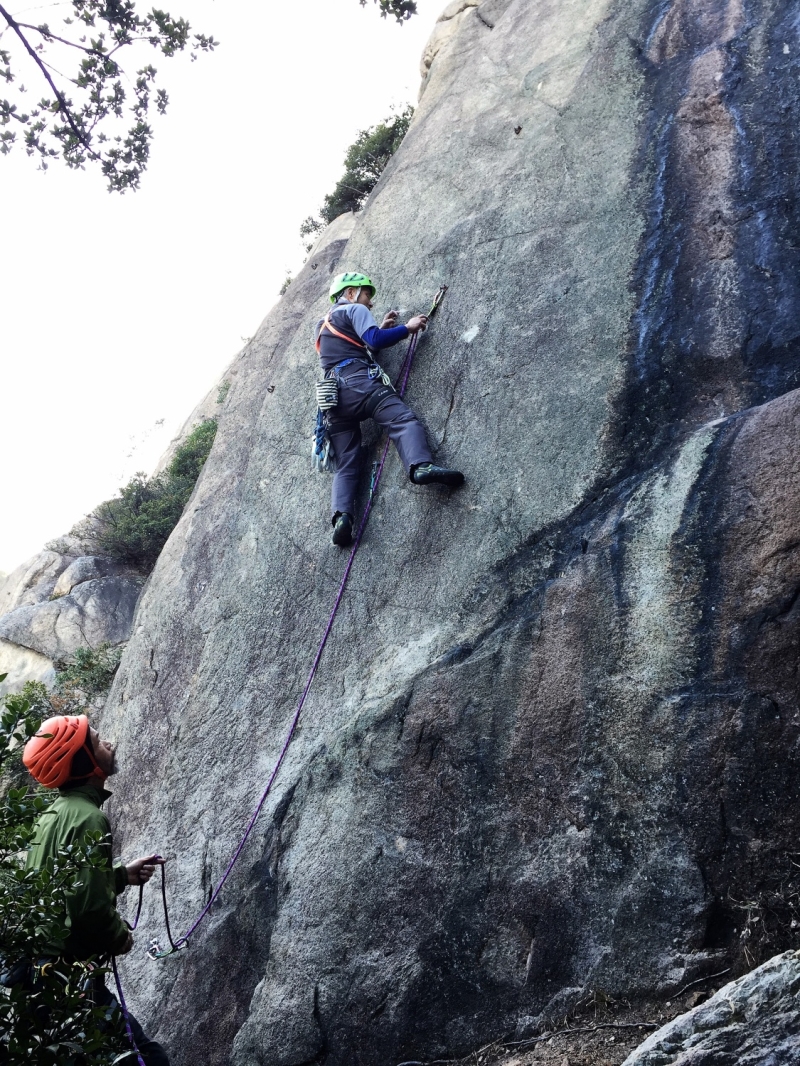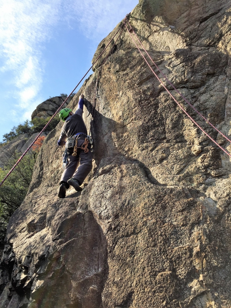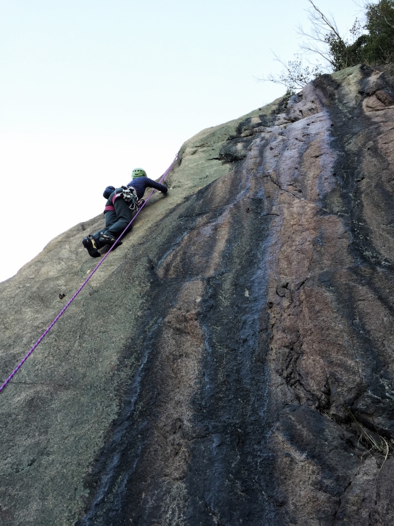 朝食&コーヒーの後、ビギナーズロックで練習。久しぶりに触れる自然の岩に緊張しつつもワクワク、ドキドキ。トップロープやマルチで登る練習をさせてもらう。夕方までしっかり練習した後、夕食は寄せ鍋。お酒やつまみも出ておしゃべりに花が咲く。