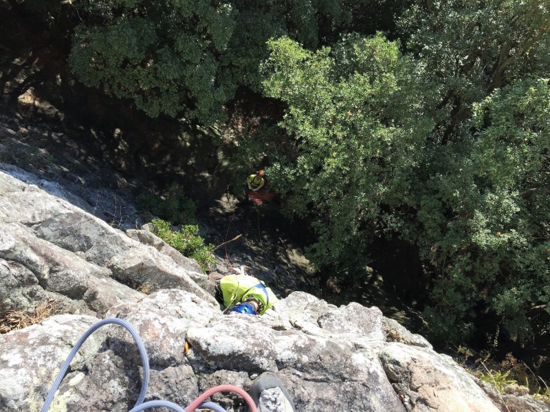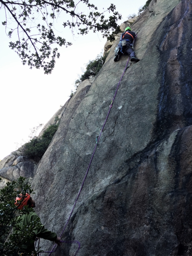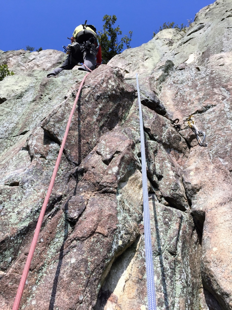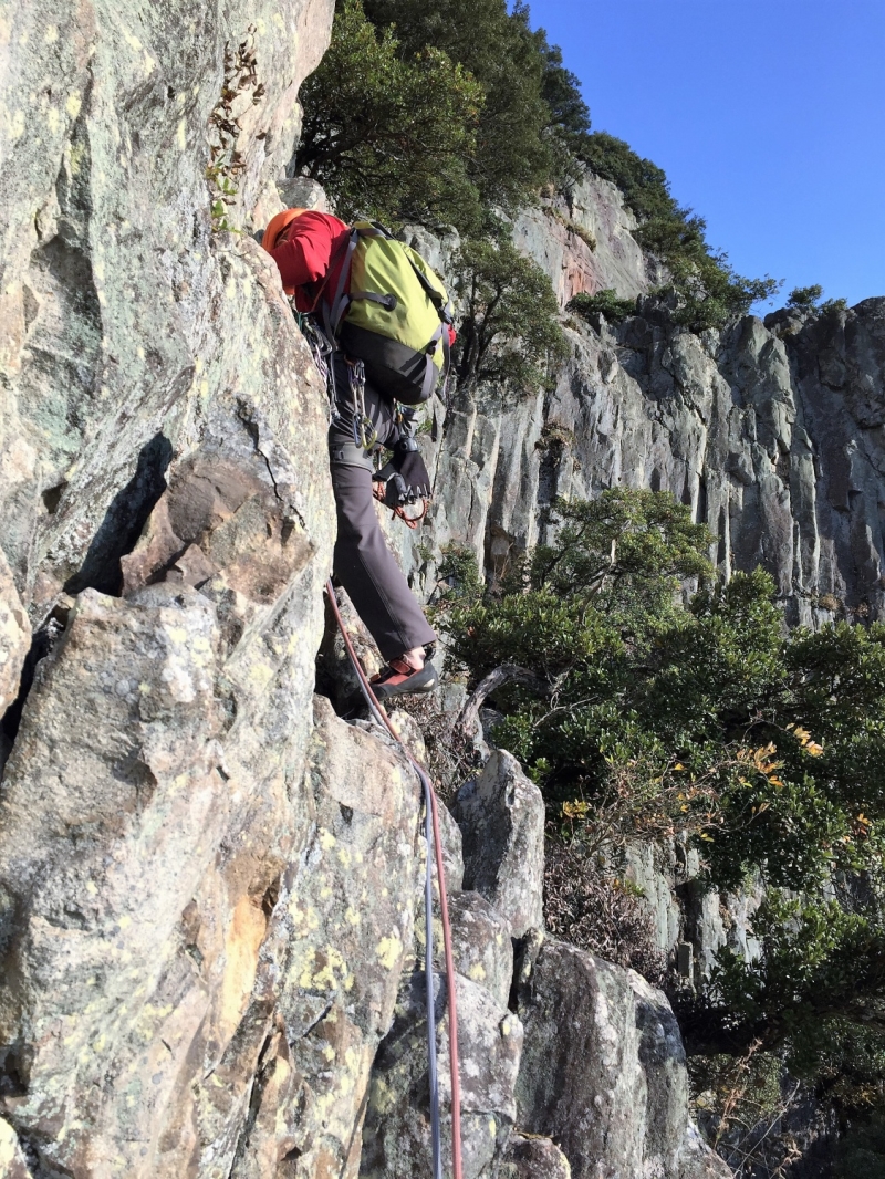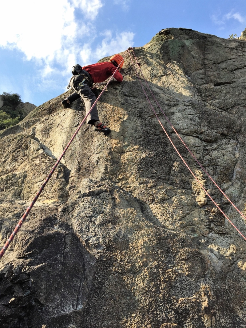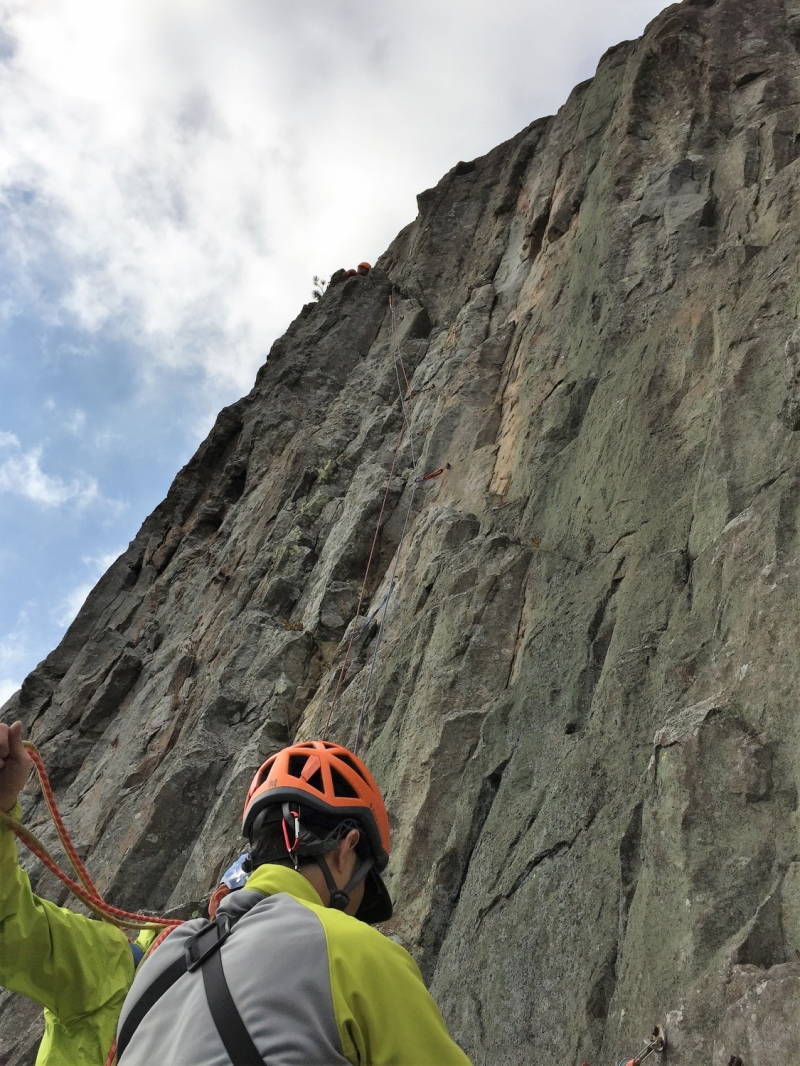 車窓から見る拇岳は親指を立てたように空に向かって突きあがり、正面壁は垂直の絶壁!こんな絶壁登れるの?と不安が募る。取り付き地点で、私たちの前に某山岳ガイドのパーティー3人が先行、港から直行してきたとみられる某山岳会のメンバー、2パーティー5人が後ろについた。通称“赤いクラック”と呼ばれる一般ルートの人気の高さが伺えた。1ピッチ目は、このルートの由来となっている赤い右に斜上した柱状摂理のクラックを登る。ピッチを上げるごとに高度感と威圧感が増してくる。振り返ると、朝日に照らされた海がキラキラ輝いて見える。「気持ちいい~!けど怖~い!」。セカンドとは言え、なかなかスムーズに登れず自分の力不足を痛感する。A0(クイックドローを手で掴んで力づくで登ること)ありアブミありで、がむしゃらに登った。途中、大休憩をはさんで14時過ぎに頂上の終了点に到着。ザイルパートナーを務めてくれたN氏と固い握手を交わした。達成感と安堵感が入り混じっていた。
