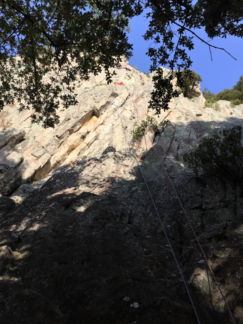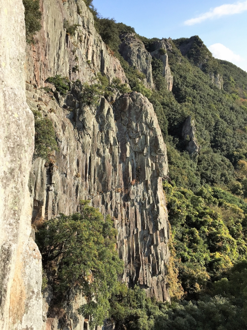 毎年この時期に会長が企画してくださる小豆島での岩登り例会に、やっと参加することができた。キャンプ場に着くと、真っ青な空を背景にいくつもの岩峰が見える。初日は、ベースとなるテントを設営後、歩いてすぐの吉田の岩場で岩登りを楽しんだ。易しいルートではリードの練習、難しいスラブやムーブの必要なルートはTRを張って練習をした。翌日、神戸の某山岳会が島入りすると聞いて、早朝キャンプ場を発ち、N氏と拇(親指)岳へ向かった。