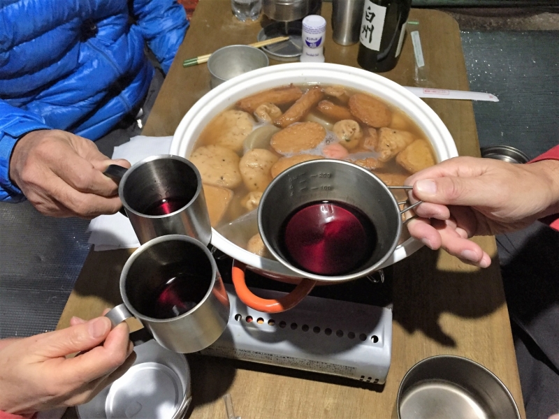 今回、例会を企画してくださった坂元会長には、食材の購入から下準備や搬入・搬出と後片づけ、また岩場でのご指導に至るまで、本当にお世話になりました。この場を借りて心より御礼申し上げます。寄せ鍋やおでん、美酒に舌鼓を打ちながら、快適なテントの中で皆さんと山談義ができたこと、素晴らしい思い出となりました。ありがとうございました。 (I)