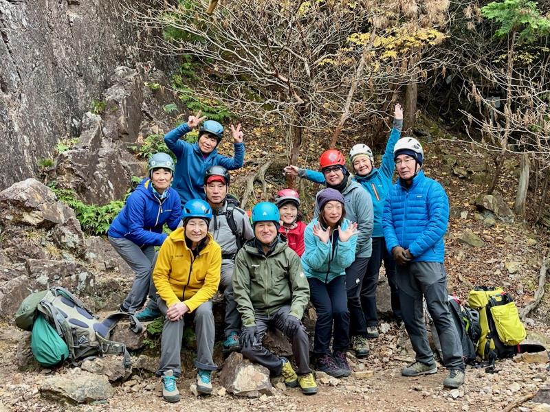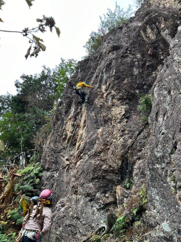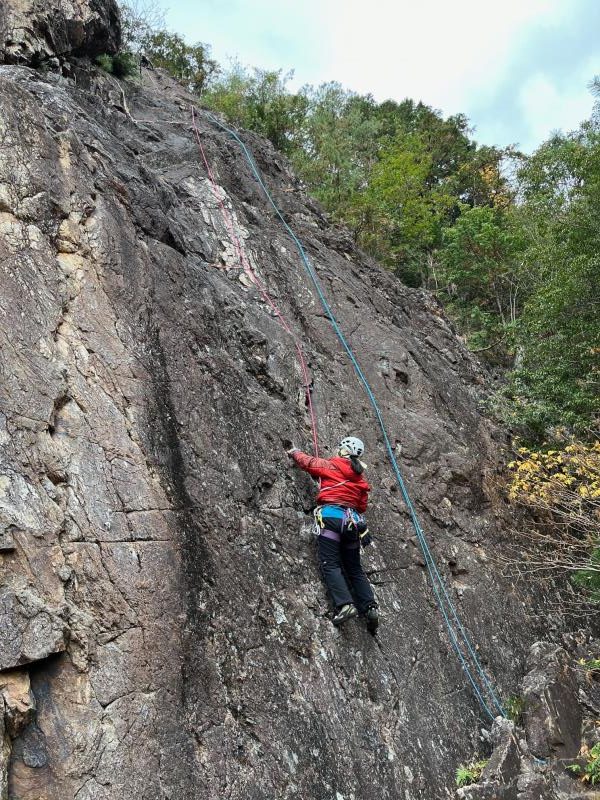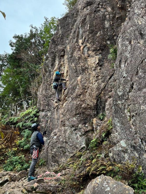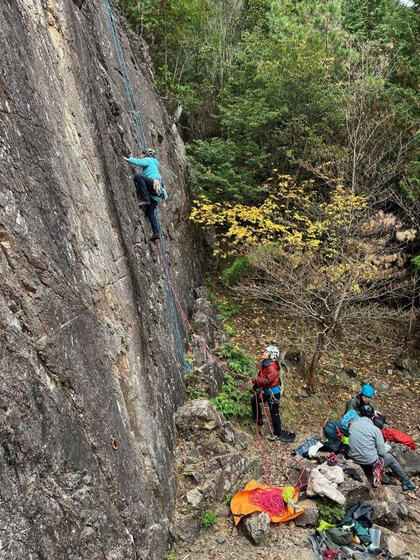 今年最後の金毘羅マルチピッチ練習会。この日は午後から雨予報だったため、いつものメニューを変更し、雨が降り出してもすぐに撤収できるようMゲレンデをベースに岩練習をした。M、Kをリードで登る人、トップロープで登る人。また、Mクラック(5.10a)と岩峰会ルート(5.9)にもトップロープを張り、各自で練習してもらった。入会したばかりのM氏も、各ルートを見事に完登された。時折、雨雲レーダーを見ては、もう少し練習できるかなと確認。いよいよ「30分後に雨が降り出します」の表示を見て撤収を始め、14時過ぎに下山した。(S.I.)