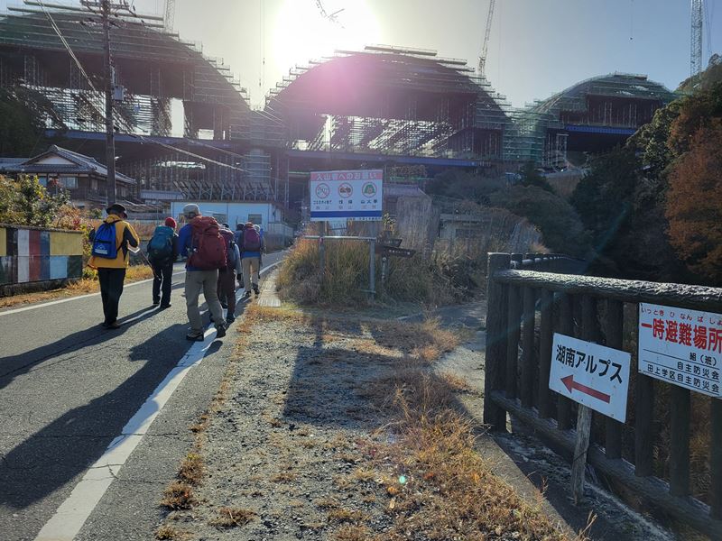 アルプス登山口のバス停を降りたら、巨大な第二名神高速道路の建設中で規模の大きさにみんな圧倒されました。