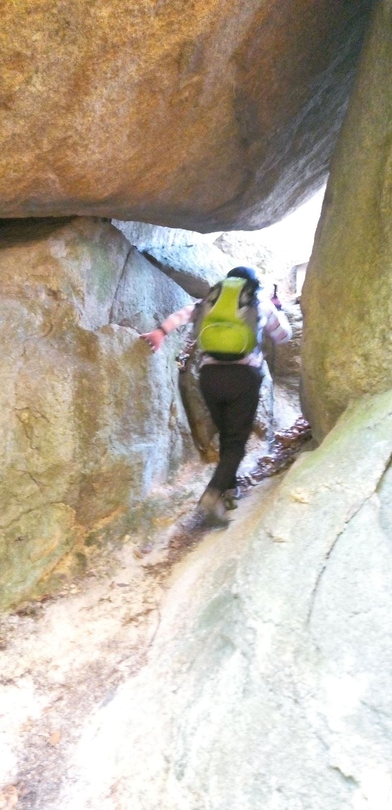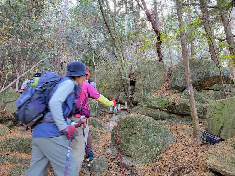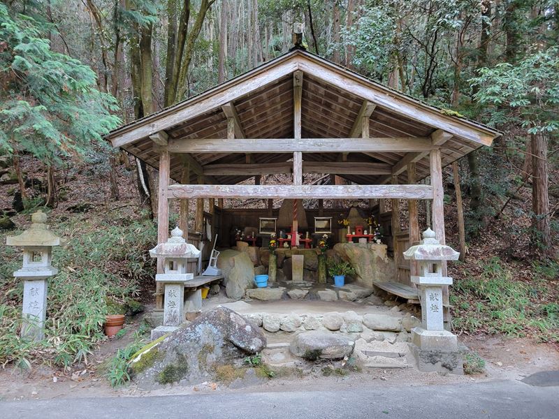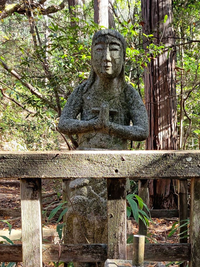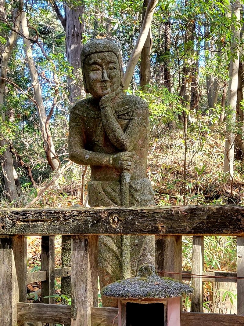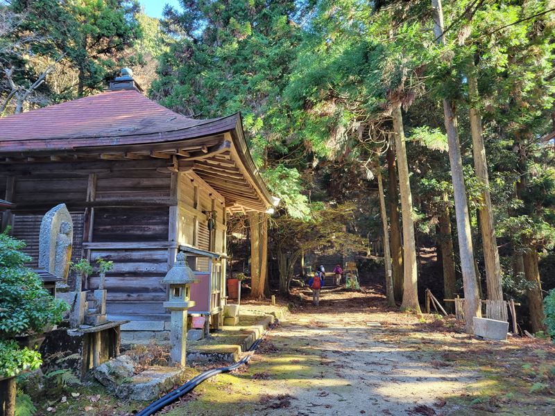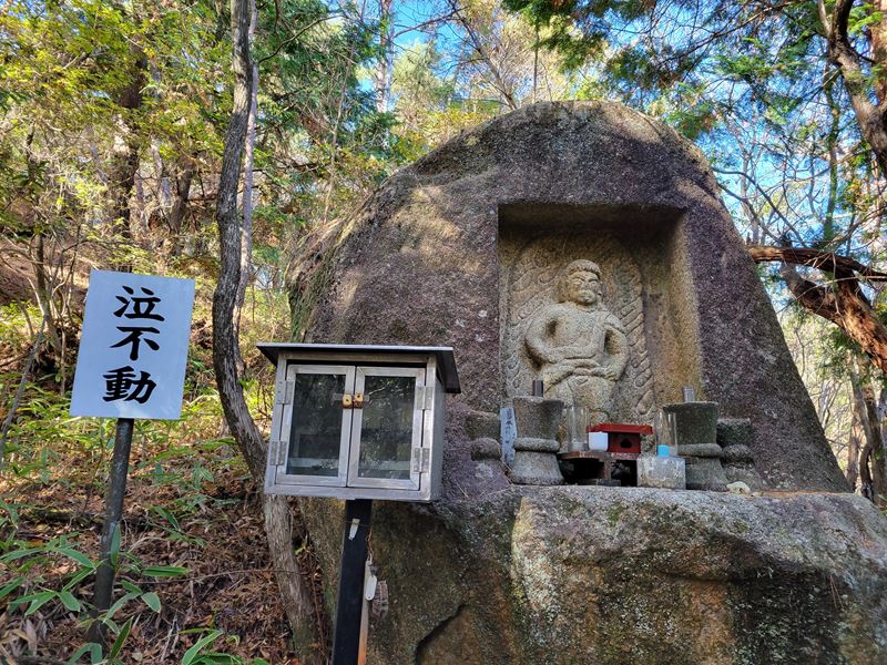 まずは天神川沿いに林道を歩いていくと迎不動が迎えてくれます。少し過ぎると林道を離れて登山道に入り、粗く削られた花崗岩のでこぼこの面白い道が続きます。中不動、泣不動を過ぎると太神山不動寺二尊門に到着。2童子の優しい表情の顔にほっこり。この門をくぐって不動寺到着。階段を登って舞台造りの本堂があるのですが修復中のため見られず残念。修復が終わった後にリベンジしたいものです。