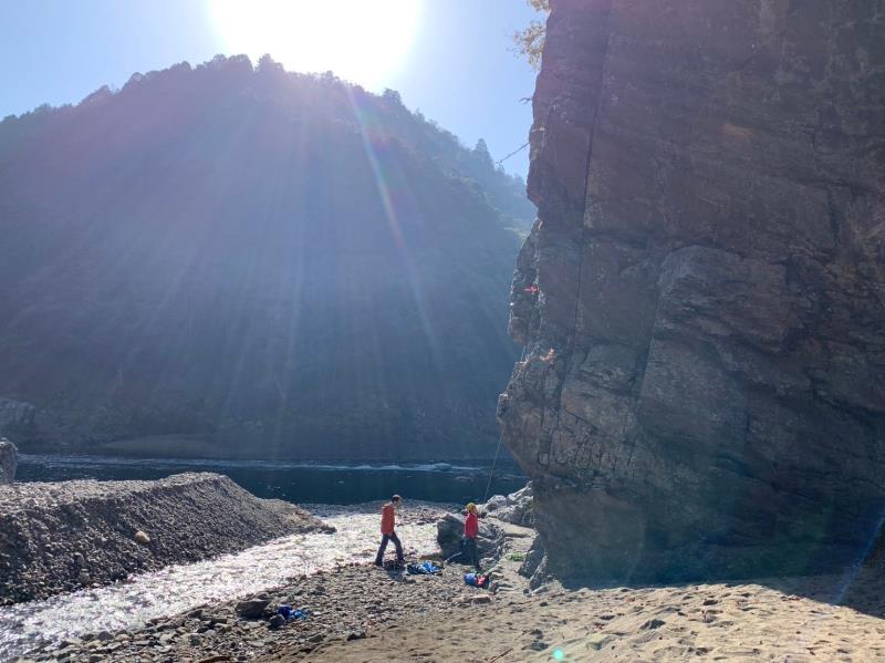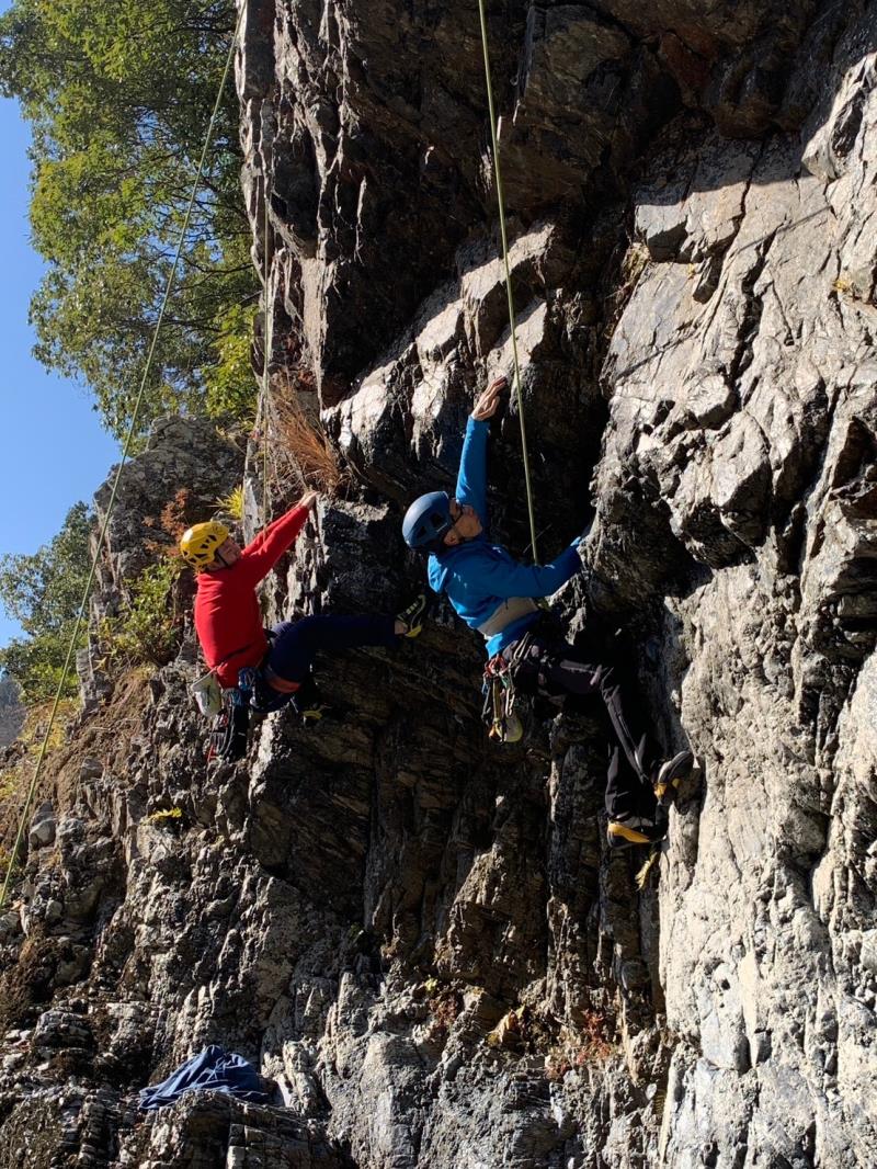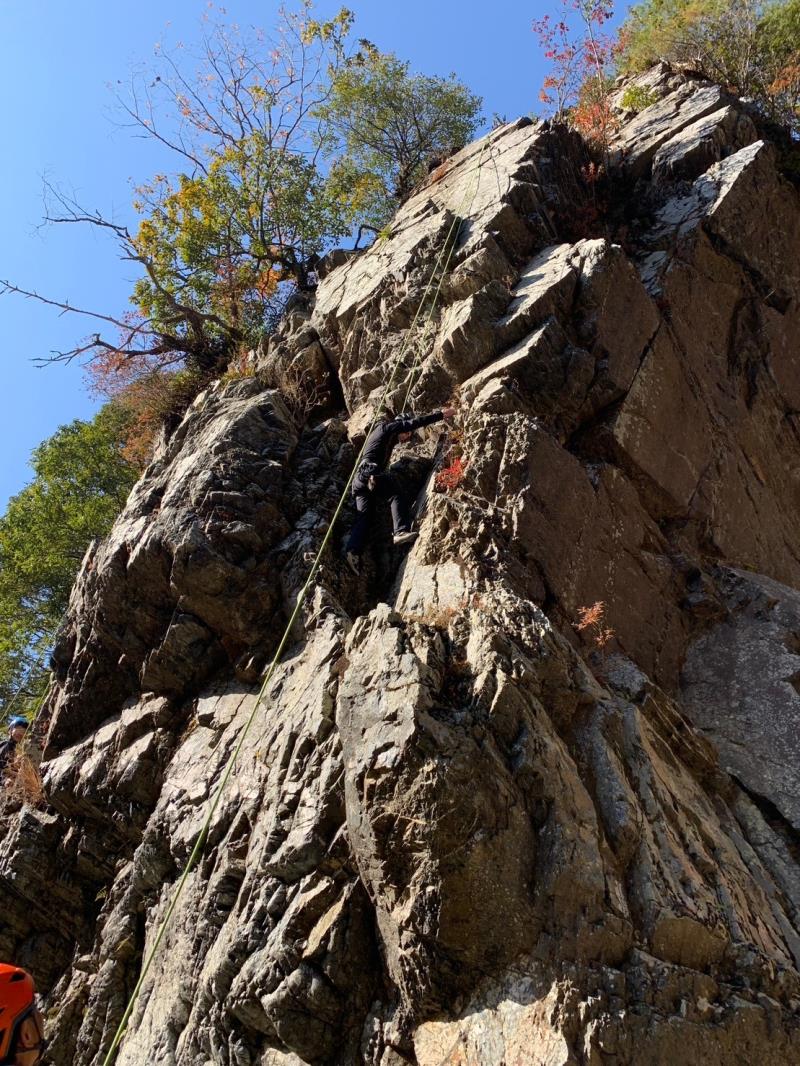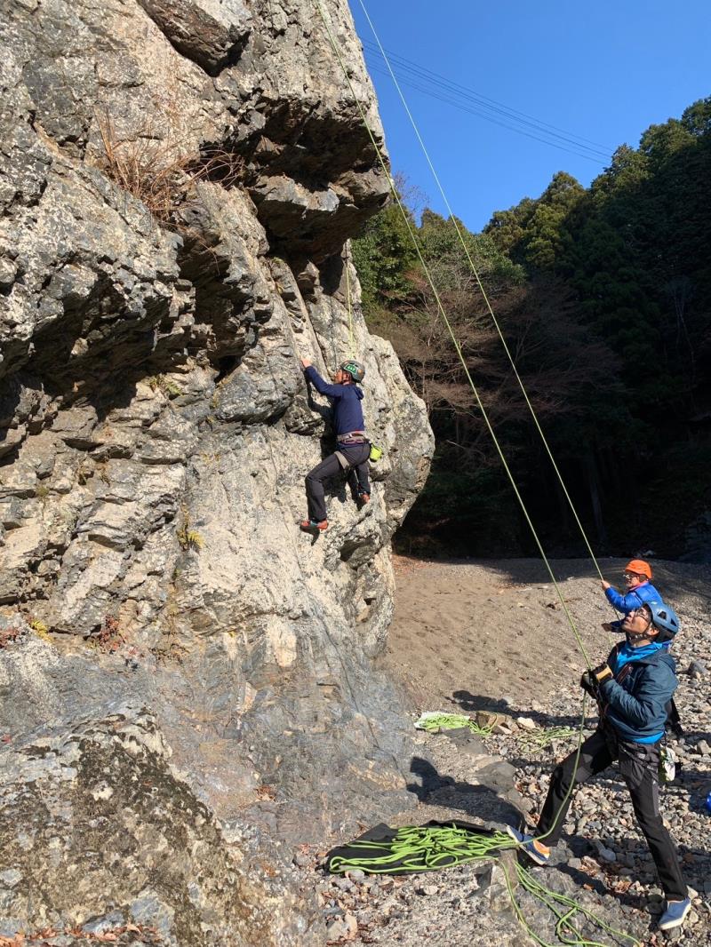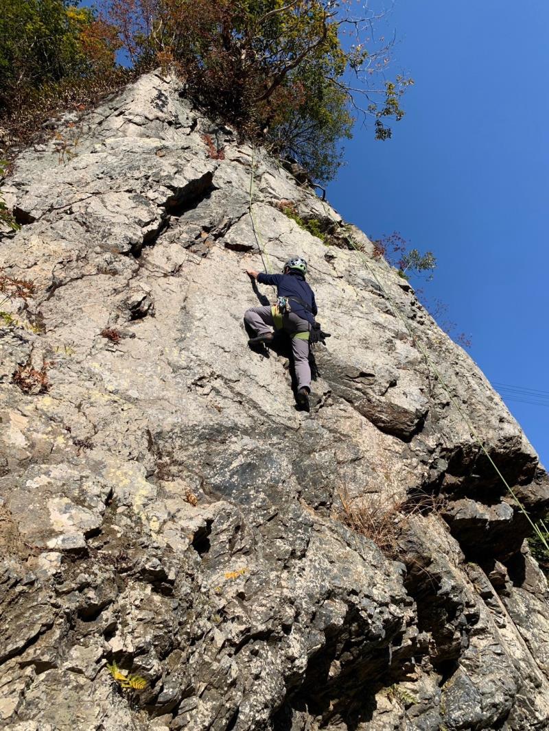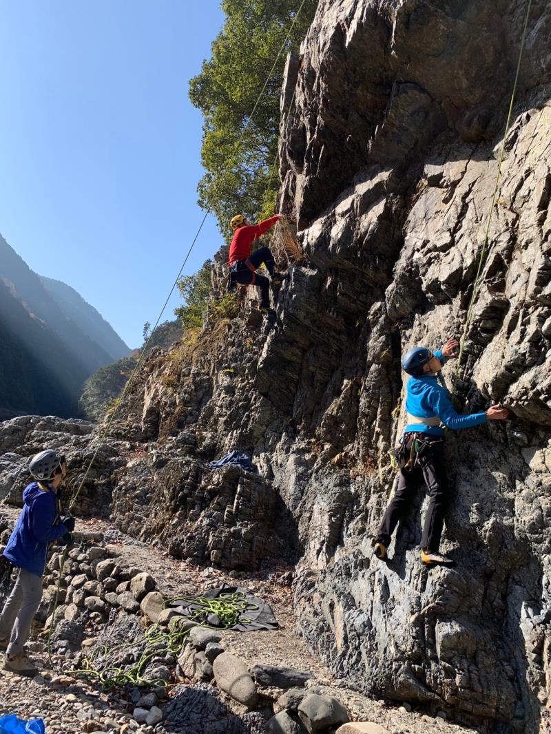 今回で3回目となる落合の岩場を使ったクライミングです。さすがに保津川のほとりなので寒かったですが、秋晴れの青空の下でのクライミングは気持ちよく、短時間ではありましたがそれぞれ楽しんだ様子でした。(Y.S)