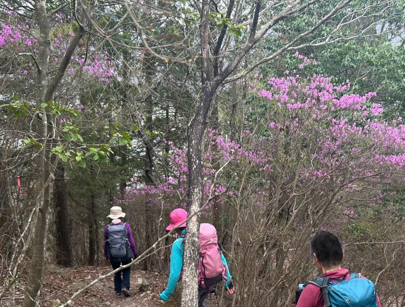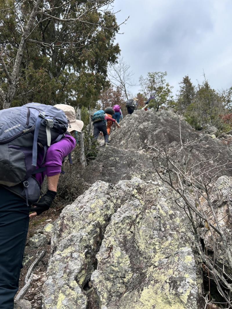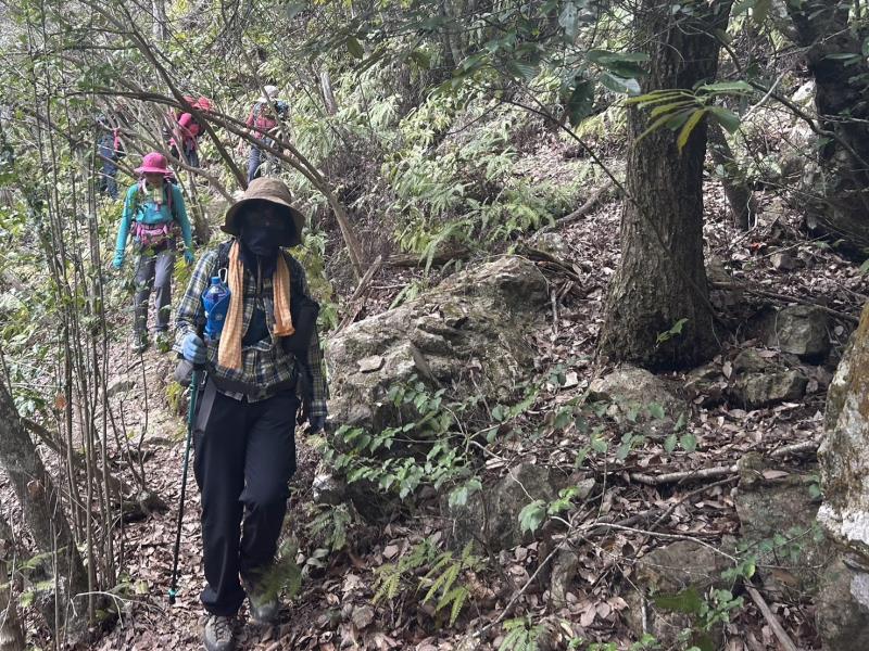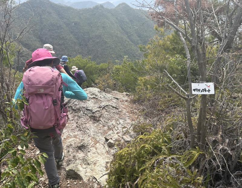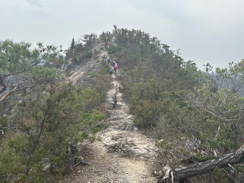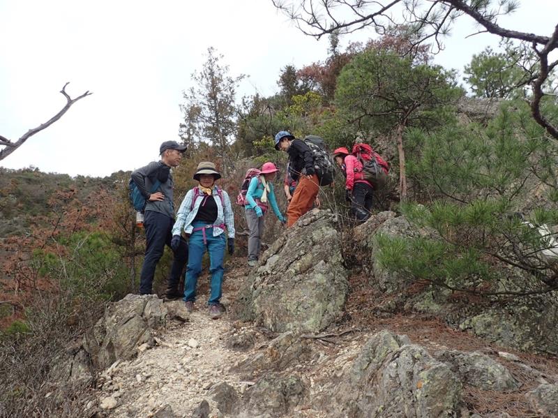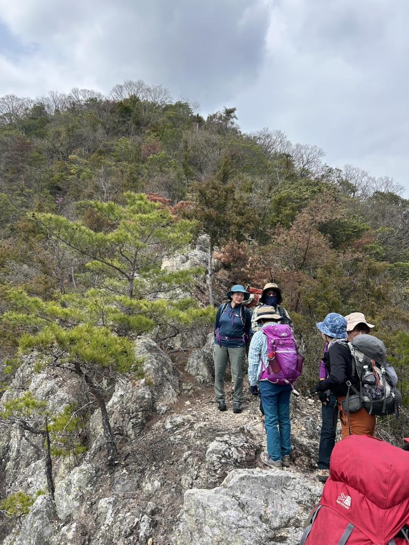 リーダー所有の和気アルプス他登山詳細図(和気駅観光案内所で販売)記載のルートで、最初から急登の岩場がありその後もアップダウンが繰り返され登り応えのある例会でした。薄曇りでしたが暖かい一日で、いくつか見晴らしの良いポイントもあり楽しむことができました。全員で下山後に美味しい牡蠣入りお好み焼きとビールをいただき大満足で帰途につきました。