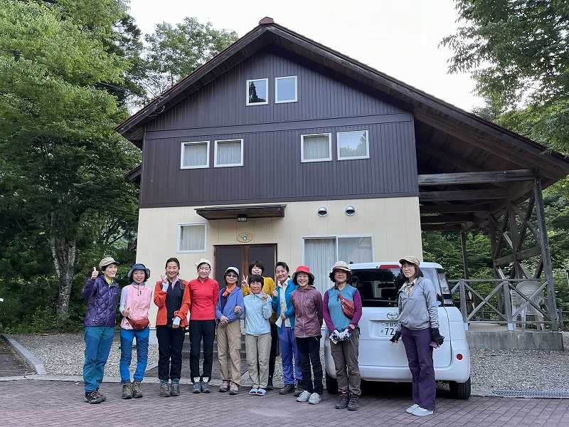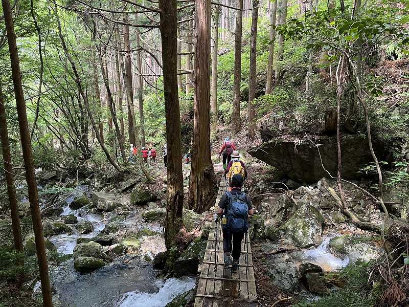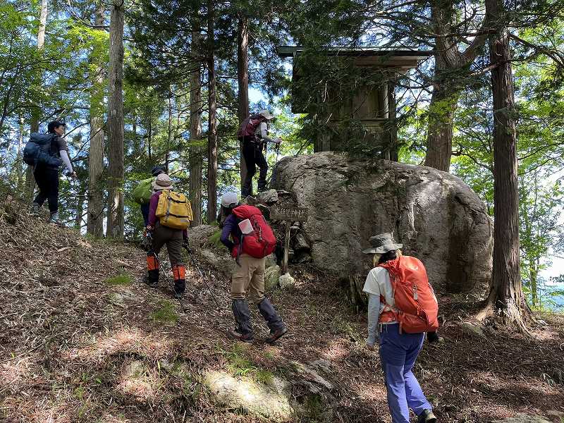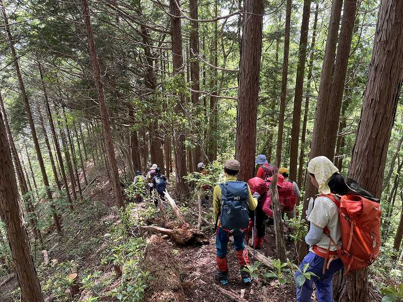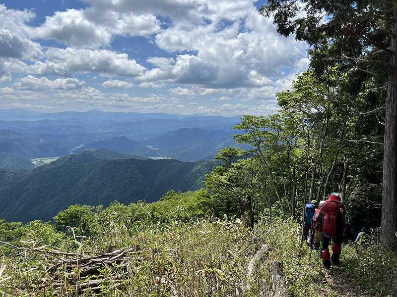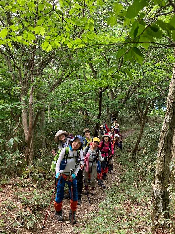 奥美濃彷徨シリーズの第1弾として、岐阜県美濃市・関市・郡上市にまたがる信仰の山、高賀三山を1日目に瓢ヶ岳(ふくべがたけ)、2日目に高賀山(こうかさん)、今淵ヶ岳(いまふちがたけ)の順に登ってきました。両日とも好天に恵まれ、どの山頂からも素晴らしい眺望を望むことができました。森の中では渡渉を繰り返したり、岩でゴロゴロした登山道や石段を登り、稜線では緑の回廊をくぐるように歩いたのが印象的でした。板取川沿いにあるコテージに泊まって、女性12名、楽しいひと時を過ごしました。(S.I.)