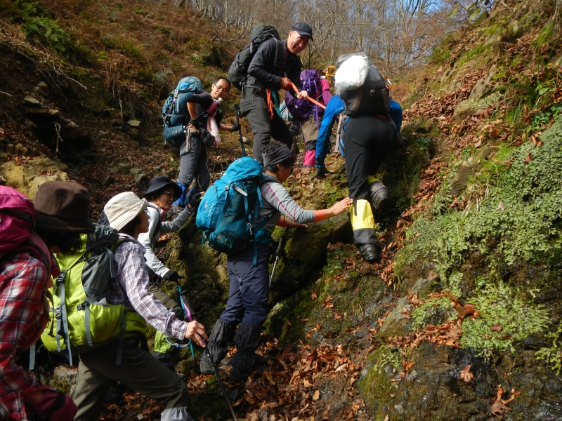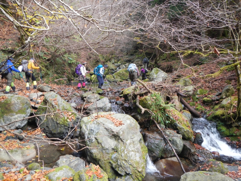 車山行は段取りが大変、体調管理もしっかりとしてほしいものだ。15時までは雨が降らない予報で例会を敢行、林道終点で渡渉、小山を越え皆子谷へ、このコースは簡単な沢登だ、直登も少しあるが巻も多い、といっても怖い様な巻きは無い、高度感の無い平凡な谷を詰め10m位の岩盤が出てきたら左岸の尾根を上がる、暫く行くと寺谷との合流点だ。