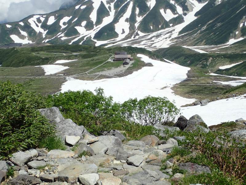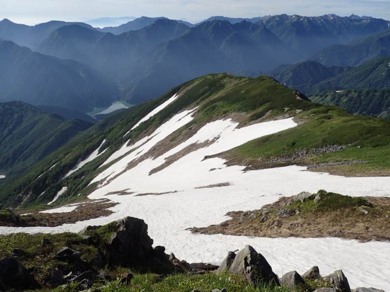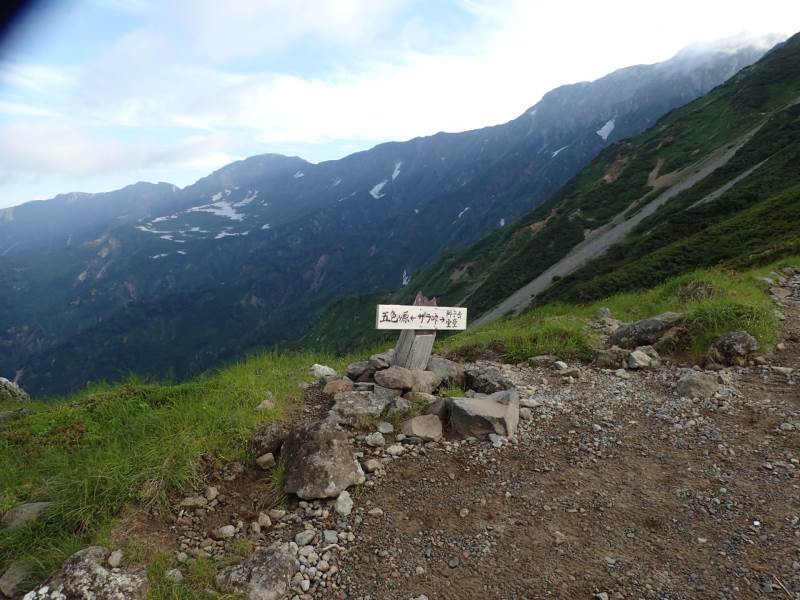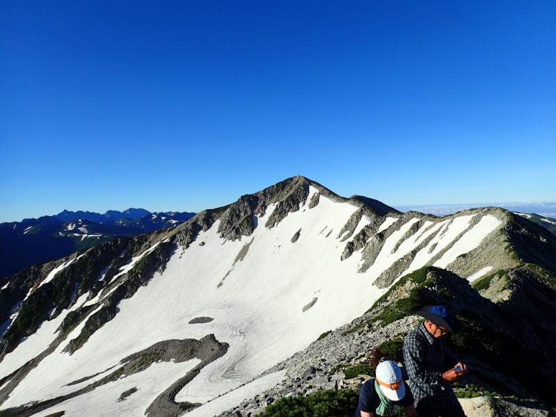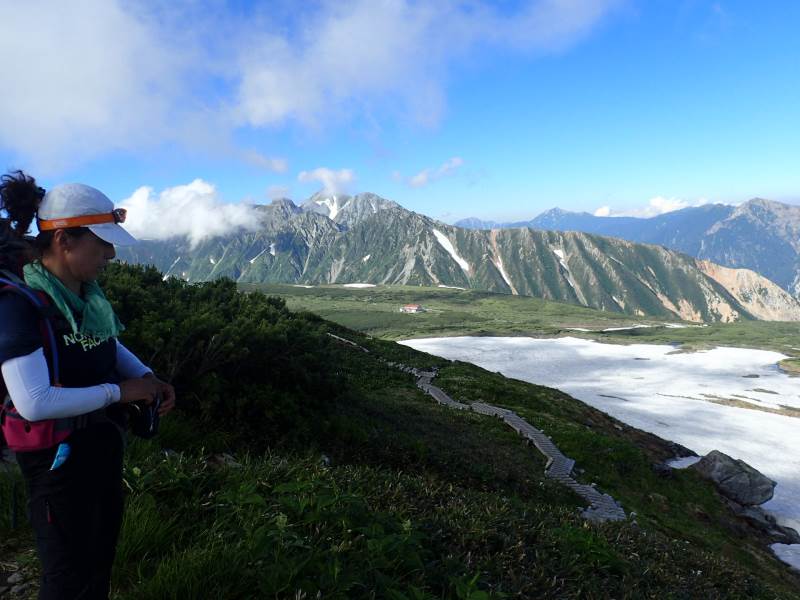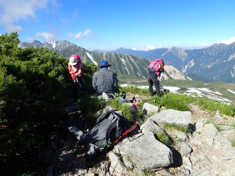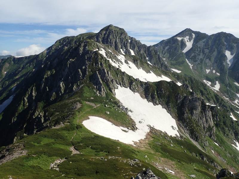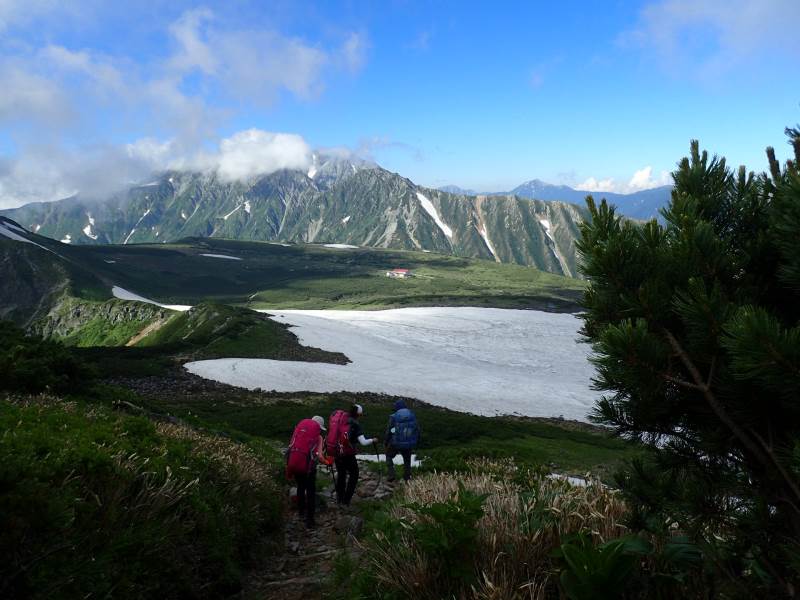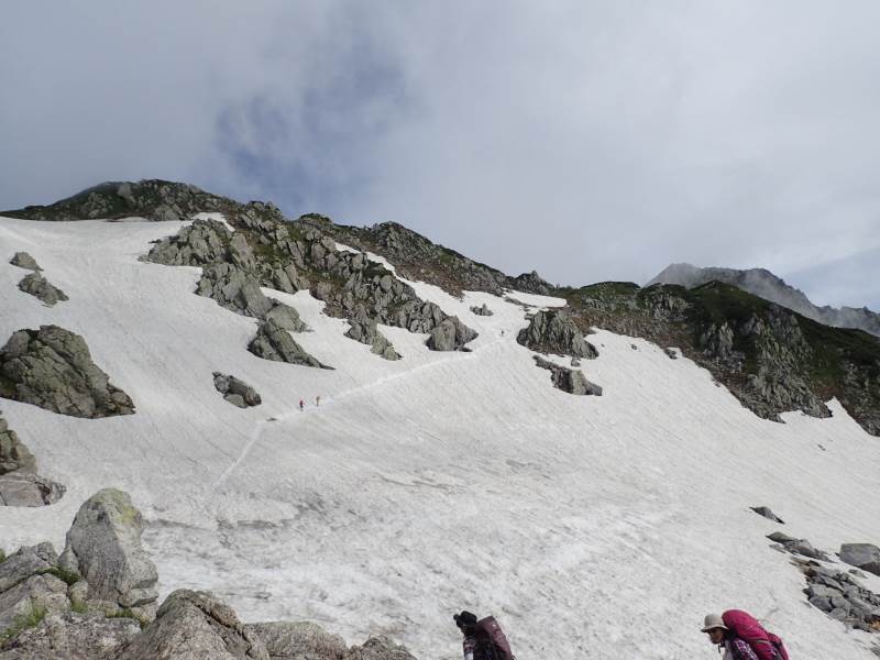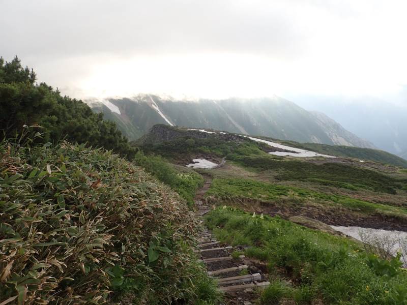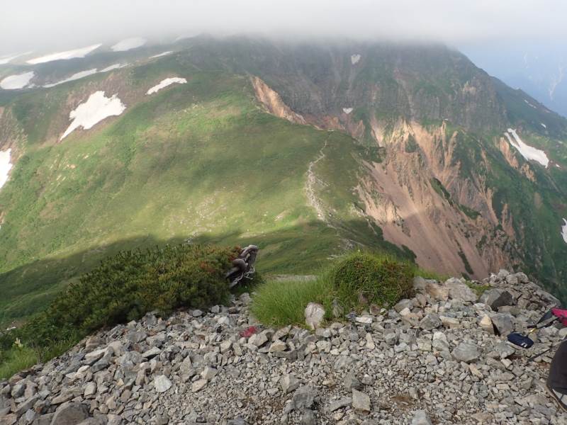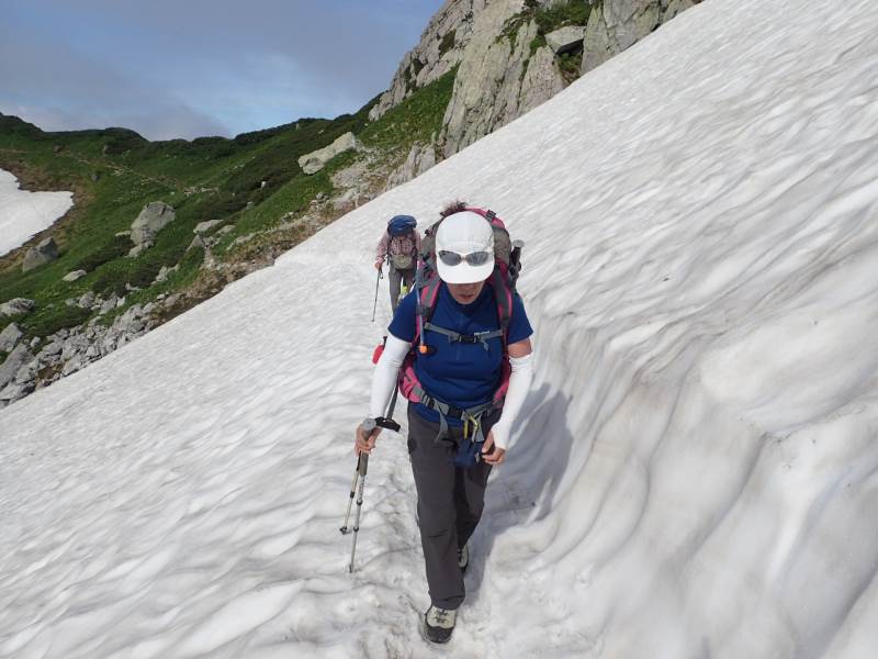 当初計画の「室堂~薬師岳~折立」を「折立~薬師岳~五色ヶ原~室堂」と経路を変更して実施した。鬼岳東面の雪渓の状態が不明なので、富山県警に問い合わせて、「アイゼン・ピッケル推奨」との回答を得て下りに使うより登りに使おうと、逆コースにしたのだが・・・雪渓部分は「五色ヶ原山荘の人」によりカットされ、歩きやすくなっていた。