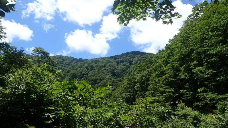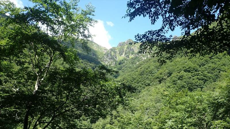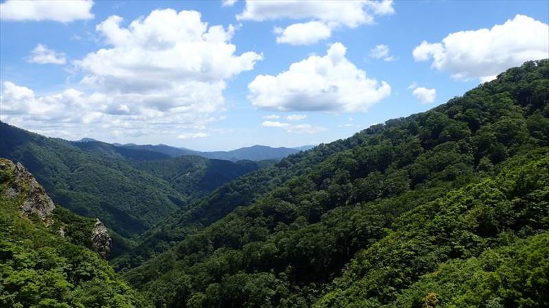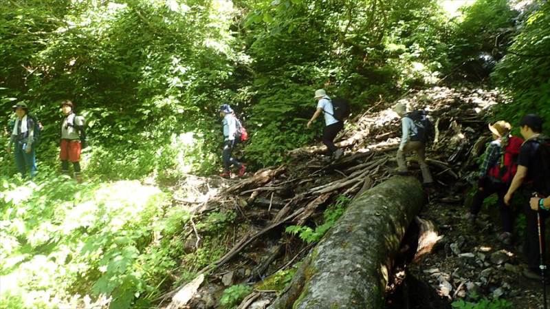 天気は快晴に近い晴れ、気温はかなり高く、時折吹く風がとても気持ちよく感じます。斜面に沿うように伸びる道を、アップダウンを繰り返しながら徐々に登っていきます。急登り、枝沢での小さな渡渉、木の根や岩が露出した場所など、路面の状態は次々に変化し、短いながら歩いて楽しいコースです。また、コースからは時折遠くの山々が見え、心も晴れやかな気持ちになります。