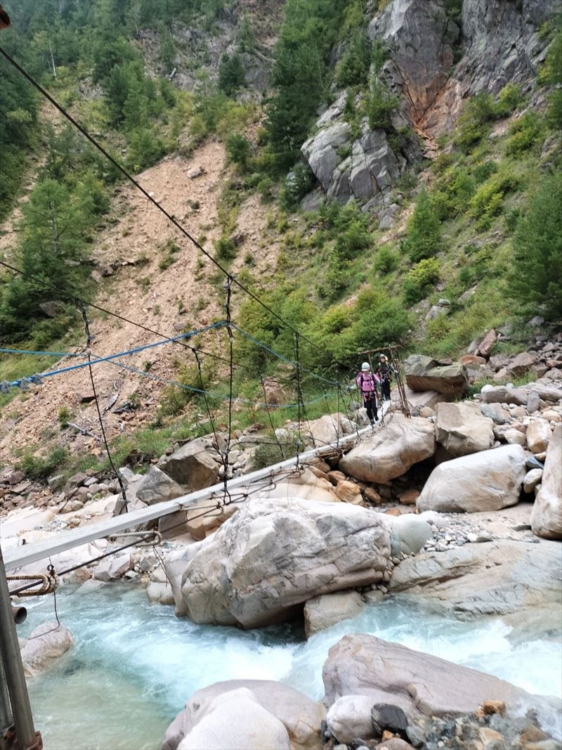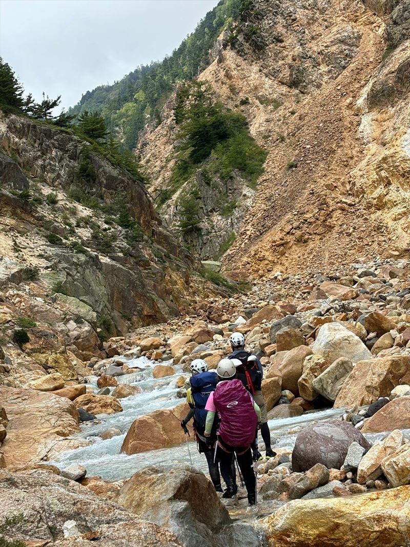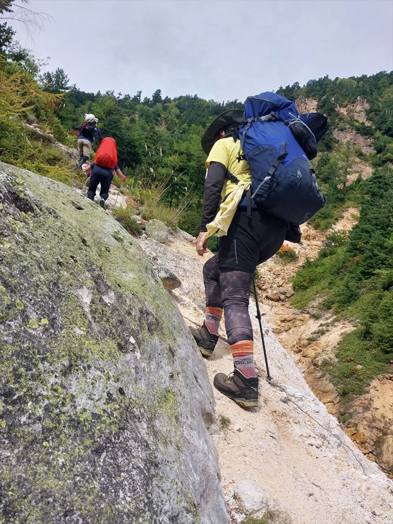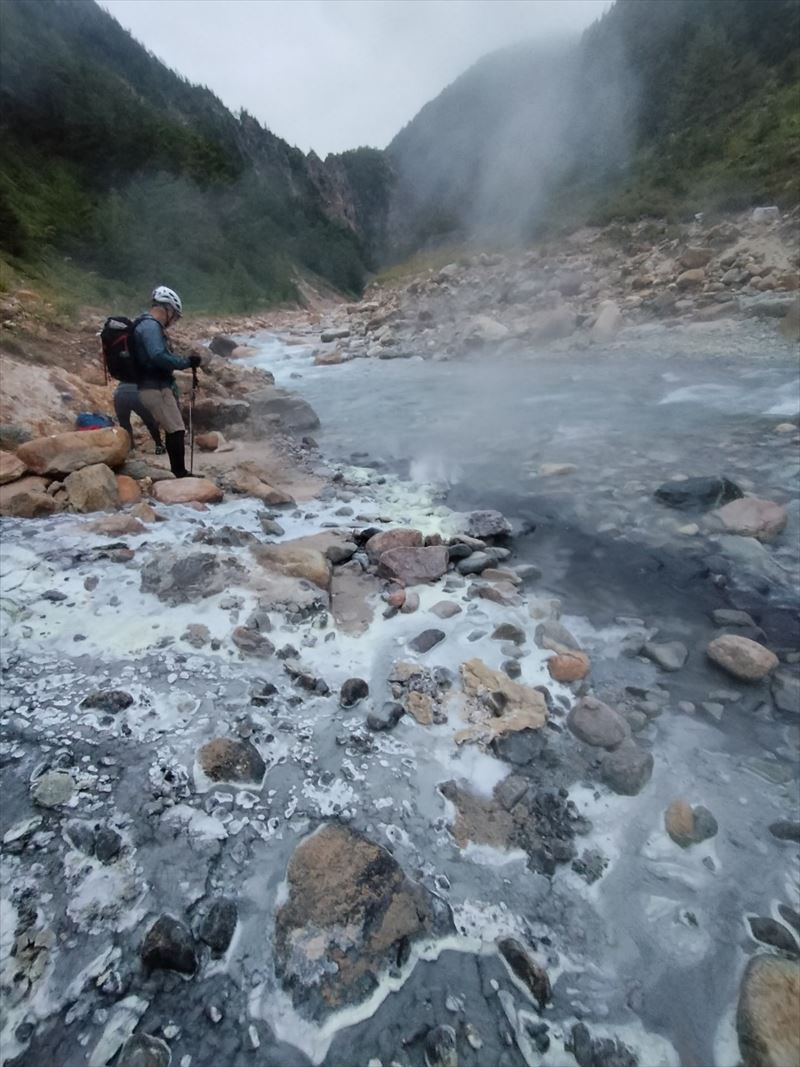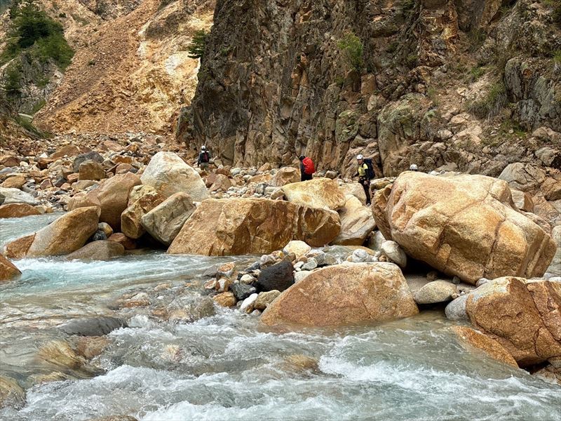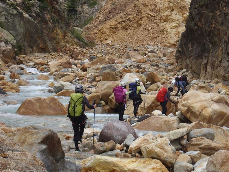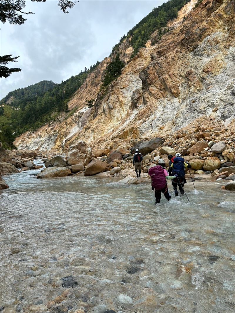| コース | 廃道になった湯俣から三俣を繋ぐ古道伊藤新道は昨年整備されましたが、落石と増水で吊り橋は1本を残して崩壊し、今年は自然の姿に戻っていました。今回は6人で湯俣川から伊藤新道を遡上し三俣山荘へ。翌日、鷲羽岳のピークを取って裏銀座へ向かい、竹村新道を下り再び晴嵐荘でテント泊。 温泉の噴気活動で日本離れした渓谷美の湯俣川の沢歩きルートと尾根に取り付いてから三俣山荘までは厳しい山登りルートという変化に富んだ景観と竹村新道の激下り。対照的にのんびり七輪を囲む焼肉や大騒ぎのジップライン行き来など北アルプス中央部で充実した4日間を過ごしました。 楽しみにしていたガンダム岩は落石が多いため登れずおへそ迄浸かりながらへつったり、十数回のスクラム渡渉でしたがトレランシューズやワークマンシューズで滑ることなく無事に歩き通しました。 |