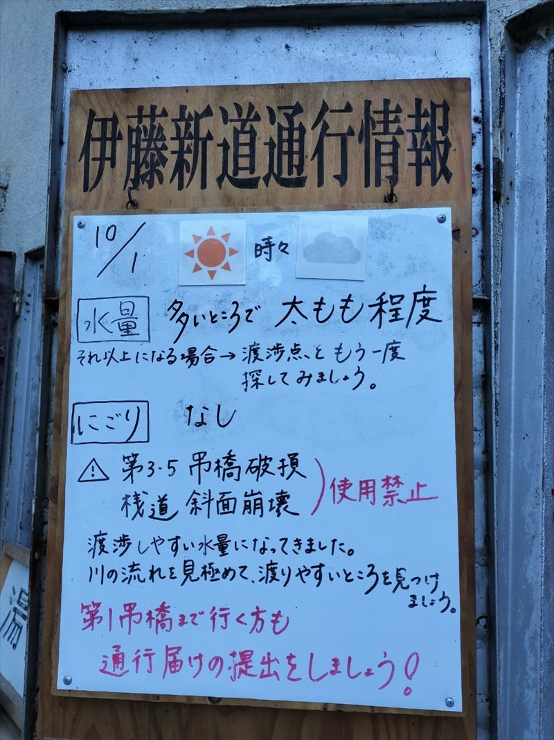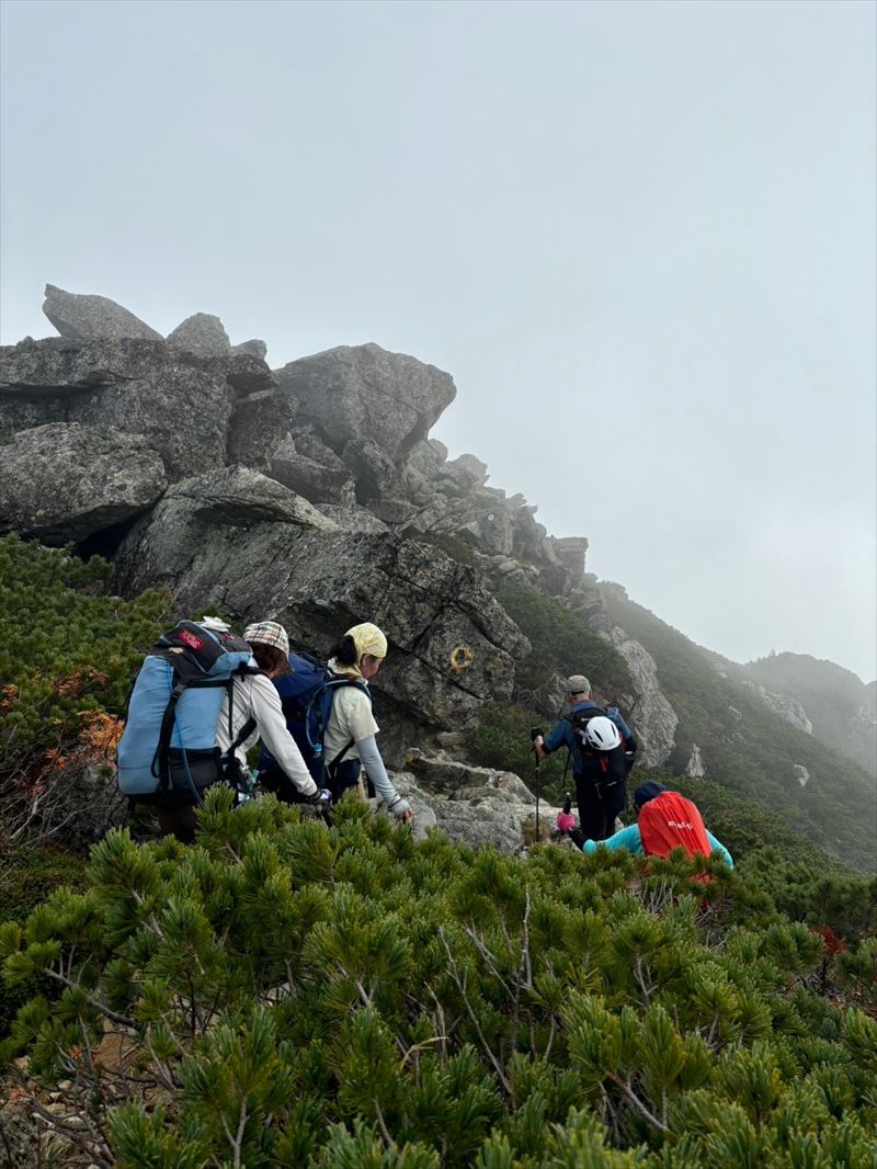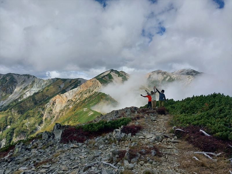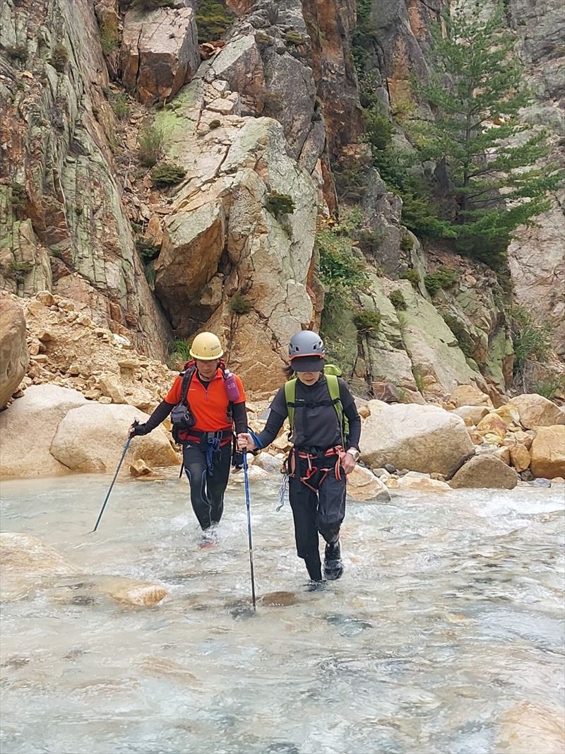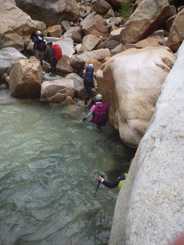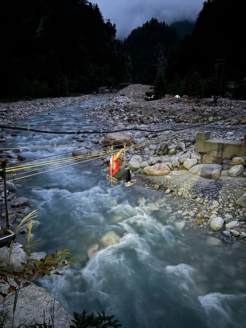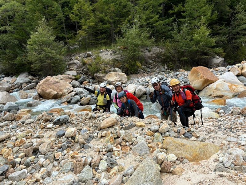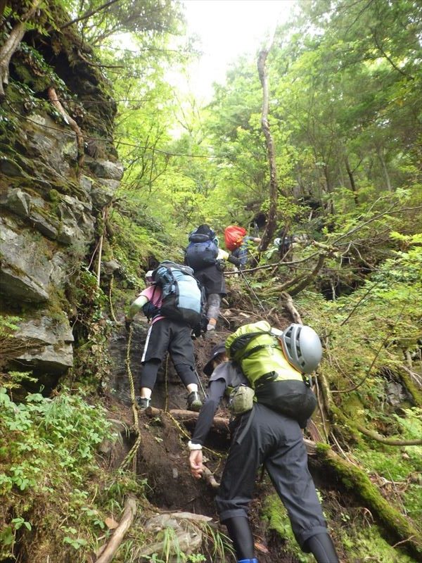 | コース | 廃道になった湯俣から三俣を繋ぐ古道伊藤新道は昨年整備されましたが、落石と増水で吊り橋は1本を残して崩壊し、今年は自然の姿に戻っていました。今回は6人で湯俣川から伊藤新道を遡上し三俣山荘へ。翌日、鷲羽岳のピークを取って裏銀座へ向かい、竹村新道を下り再び晴嵐荘でテント泊。 温泉の噴気活動で日本離れした渓谷美の湯俣川の沢歩きルートと尾根に取り付いてから三俣山荘までは厳しい山登りルートという変化に富んだ景観と竹村新道の激下り。対照的にのんびり七輪を囲む焼肉や大騒ぎのジップライン行き来など北アルプス中央部で充実した4日間を過ごしました。 楽しみにしていたガンダム岩は落石が多いため登れずおへそ迄浸かりながらへつったり、十数回のスクラム渡渉でしたがトレランシューズやワークマンシューズで滑ることなく無事に歩き通しました。 |