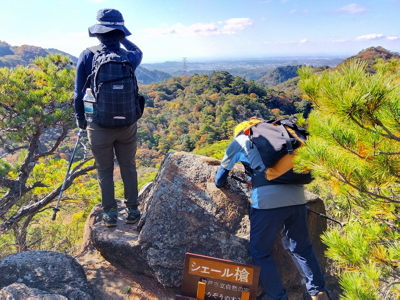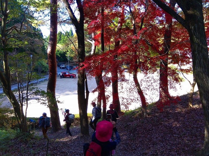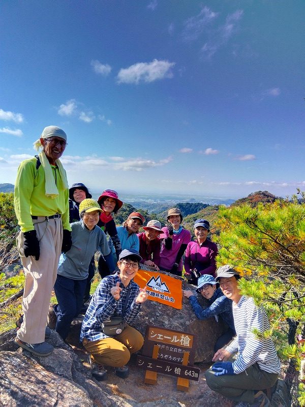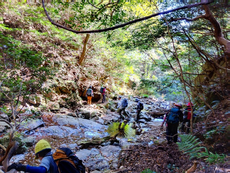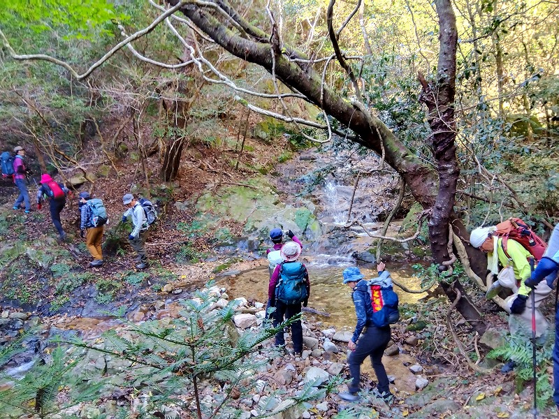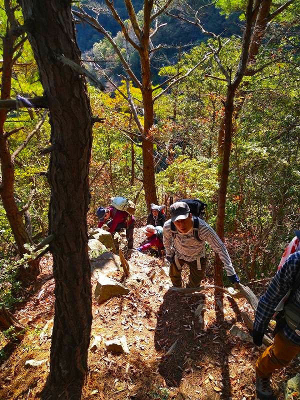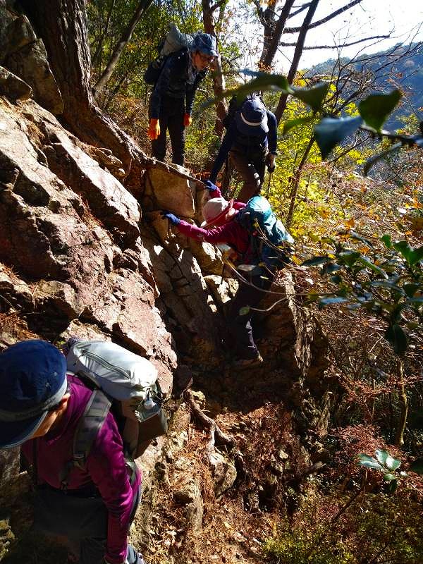 六甲の「山羊の戸渡」と呼ばれる尾根を歩いてきた。表六甲道路の脇から入り、渡渉して取付く。最初はひたすら登って行くが景色はよくない。たまに開けたところから六甲ケーブル山頂駅が見える程度だ。体験山行のお二人を含め、皆さん危なげない足取りで岩場のアップダウンをこなしておられた。穂高湖では紅葉が進んで良い感じ。お手軽な「シェール槍」に登って眺望を楽しんだ。天気に恵まれ日向はポカポカ陽気で過ごしやすかった。(MM)