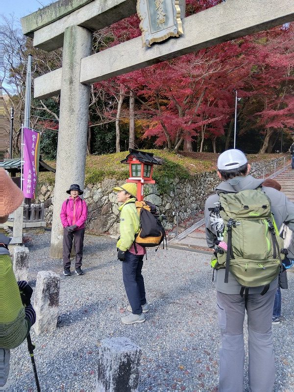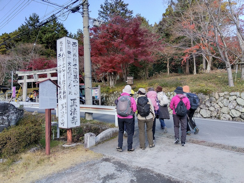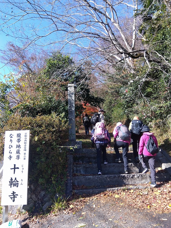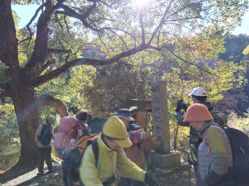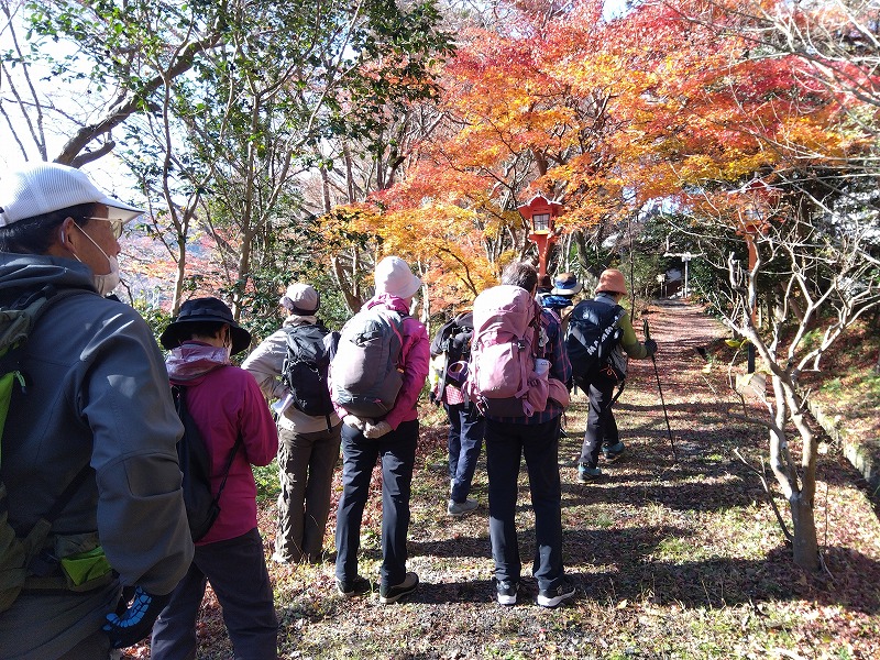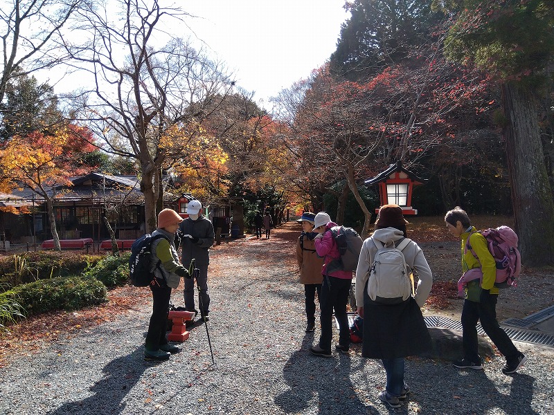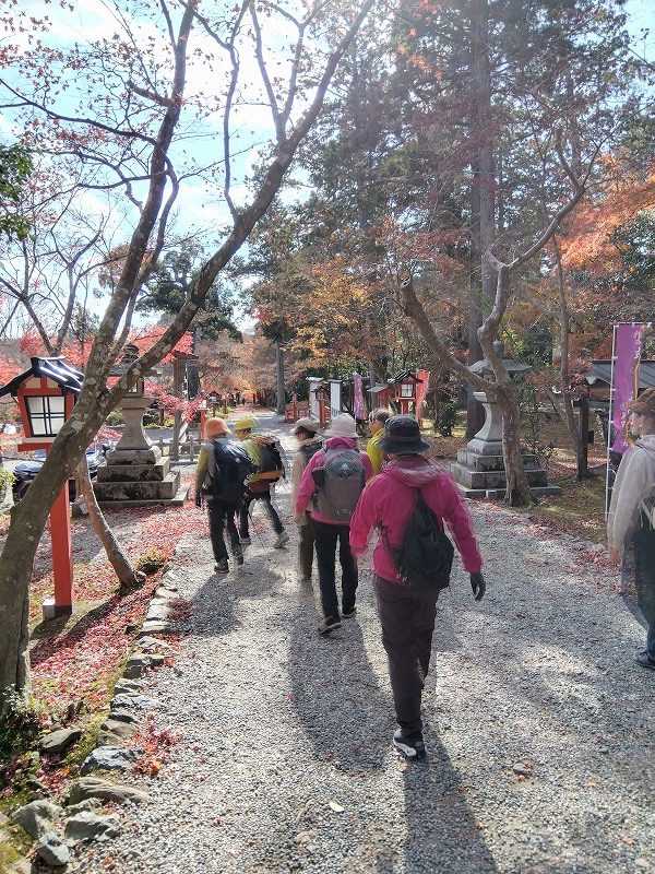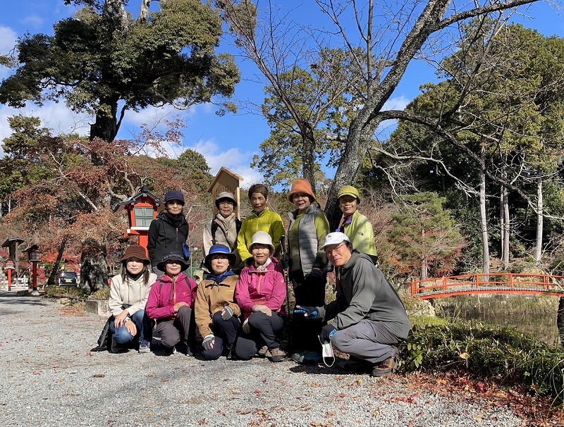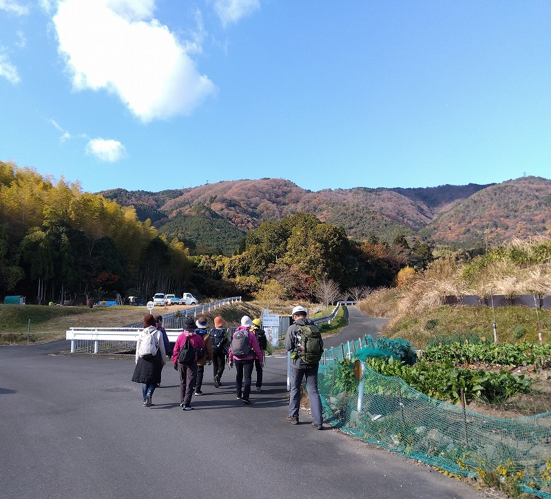 陽射しが優しい青空の下 西山山麓大原野の魅力がギュッと詰まった穴場コースとして Lの巧みなガイド付きで 会場となる千弥農園までを歩きました。 竹林や田んぼのそばを通り 明治池では池に映り込む 色づいた木立の前に有るベンチで ティータイムを楽しみました。 遠くに雪の被った山が見え、横眼にはアンテナが沢山の小塩山の稜線を別のチームが歩いているのだなと見上げながら 大原野神社の紅葉の中を通って会場につきました.