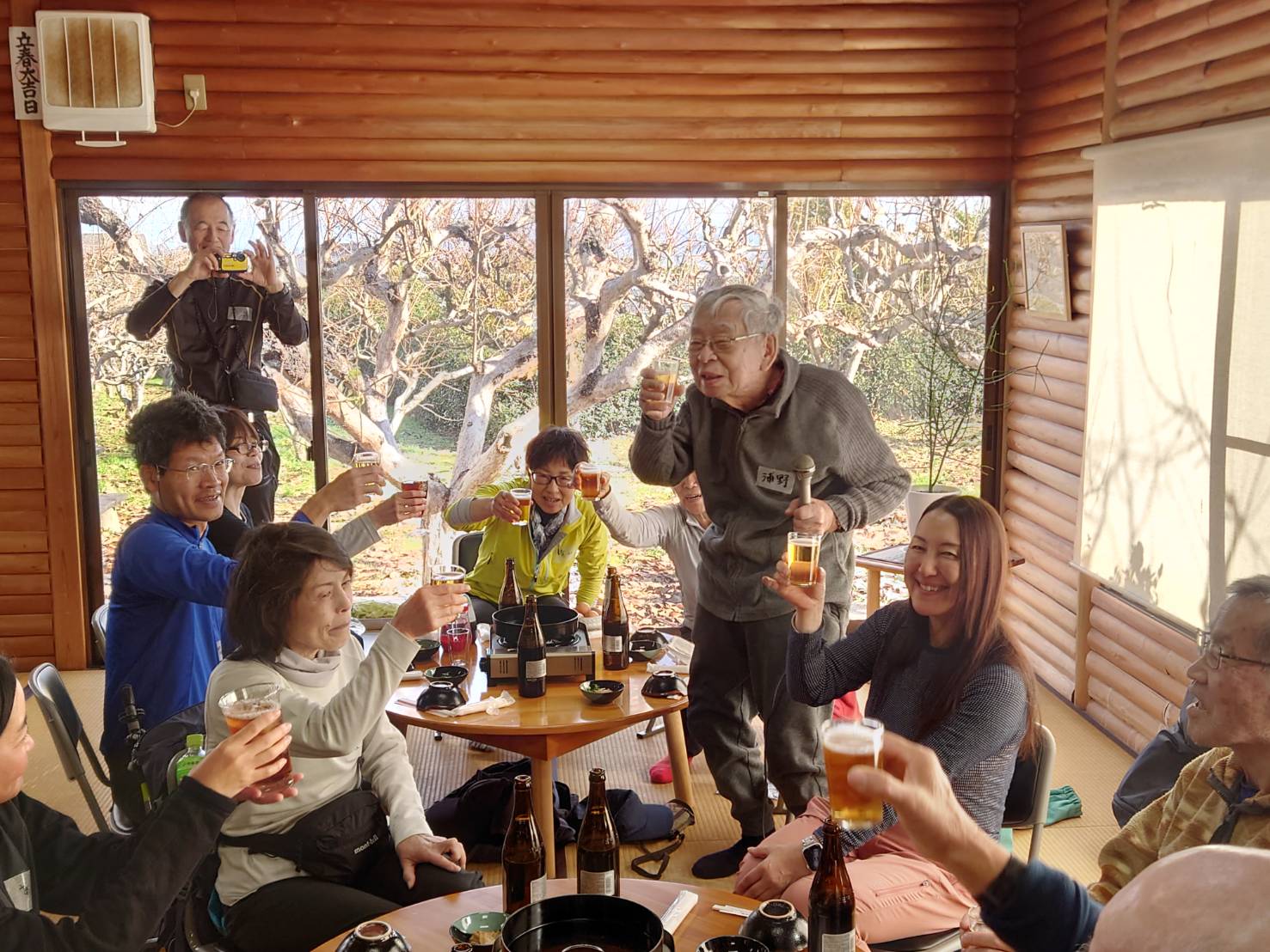 会場の外で集合写真を撮り、お楽しみのすき焼きの始まりです。