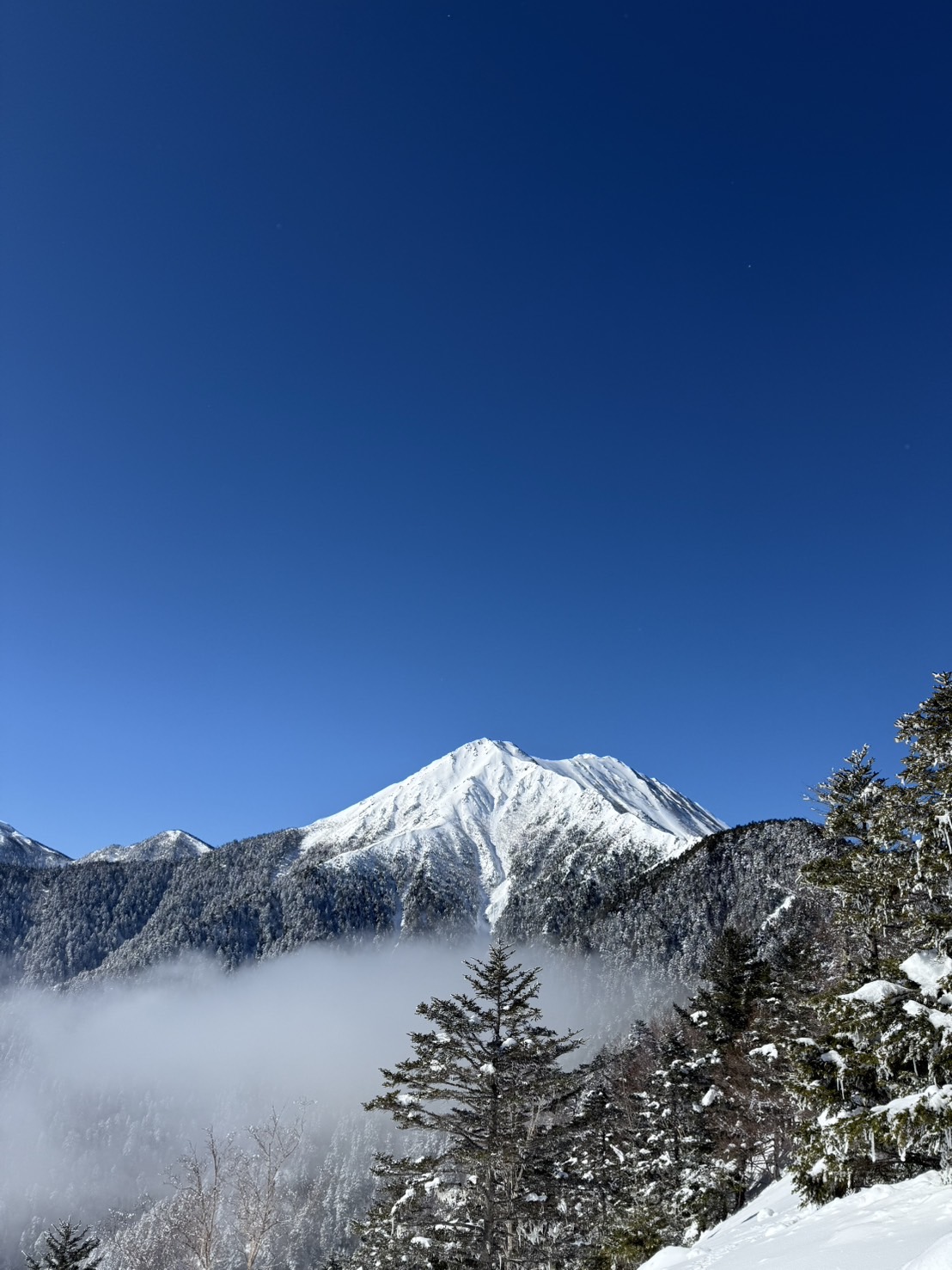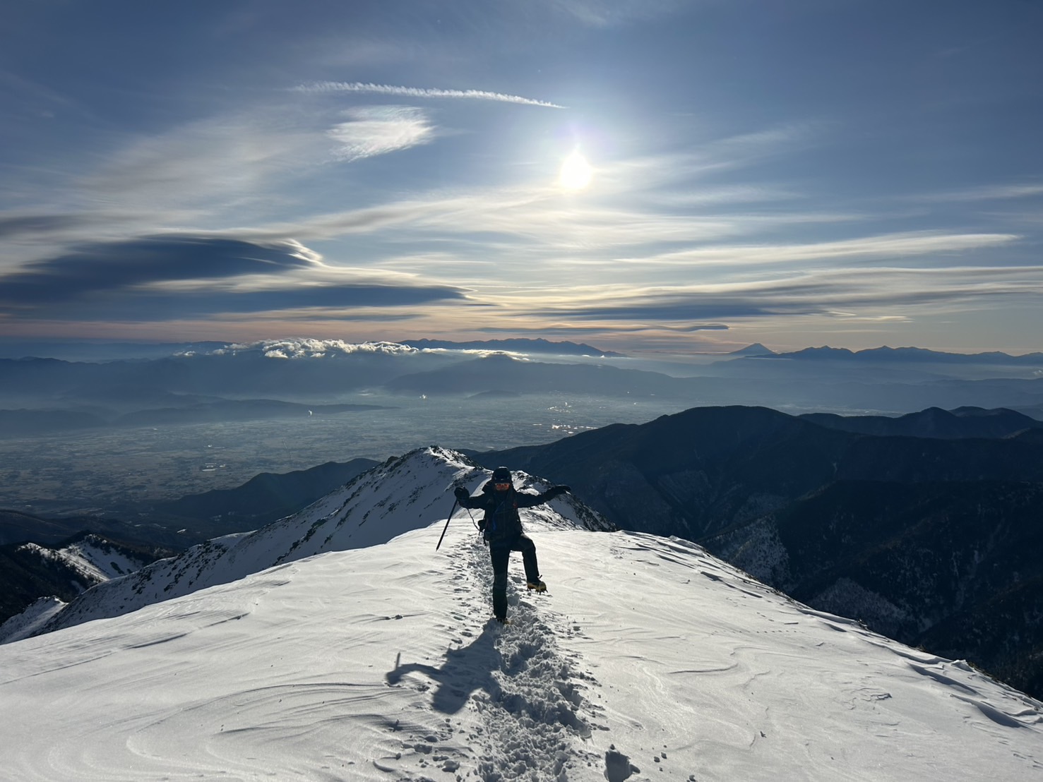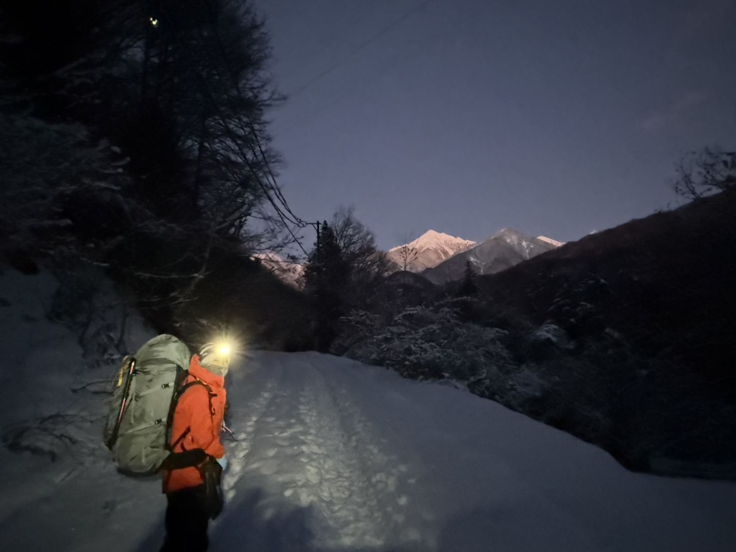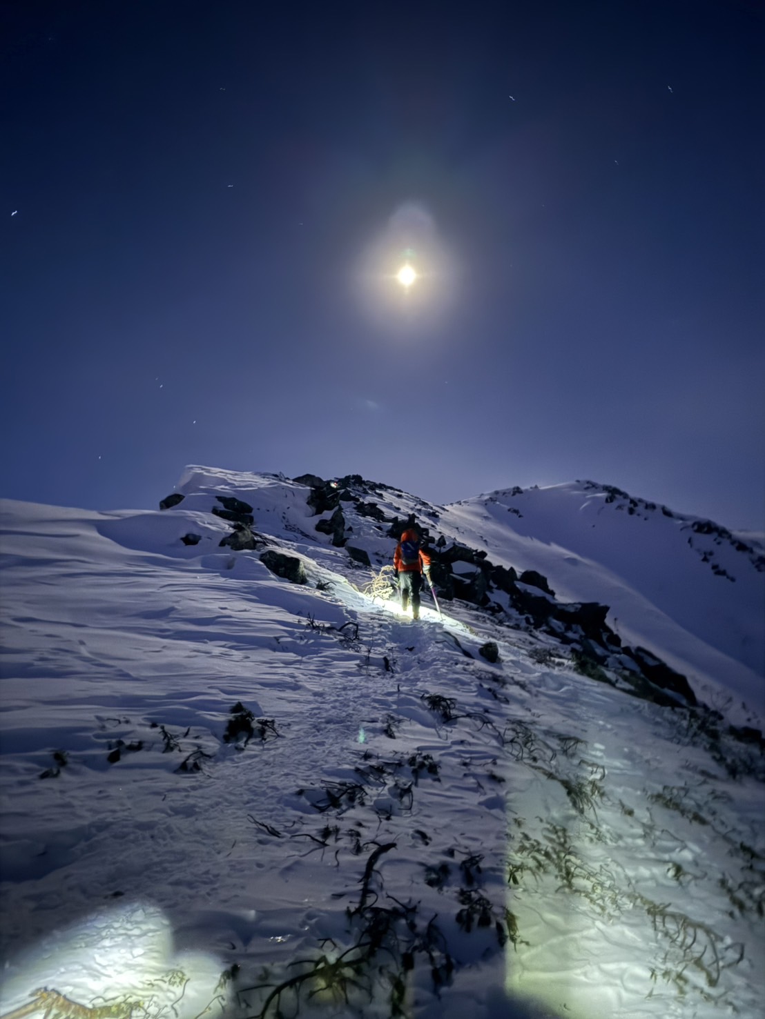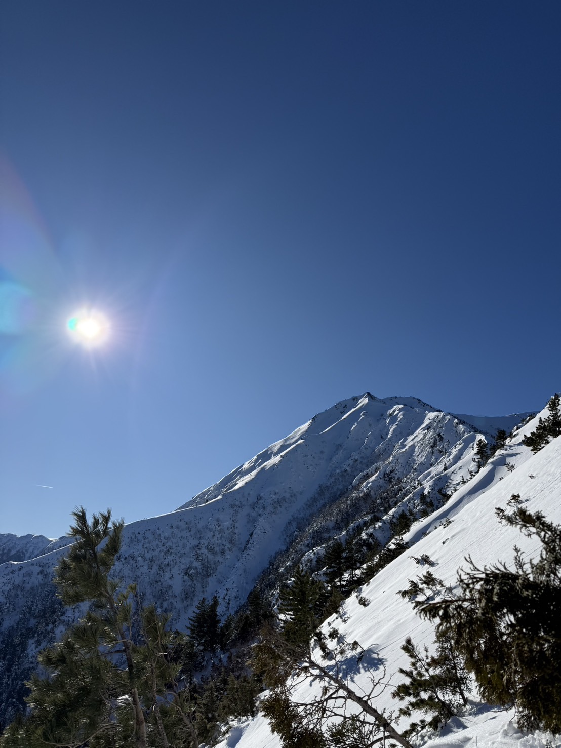 常念岳の冬限定ルートは、1955mまで急登が続く。さらに、森林限界の2178mの幕営地までテント泊装備ではかなり厳しかったが、前常念岳が見える絶好の場所に幕営でき、これまでの苦労が報われた。14時ごろまでは日差しが強く暑いくらいだったが、15時過ぎから急激に冷え込み、早めに就寝。翌朝5時出発、2400m付近の岩場を通過し、前常念岳を過ぎた辺りでモルゲンロートを、また山頂からは白銀の穂高連峰や槍ヶ岳と素晴らしい景色を堪能できた。