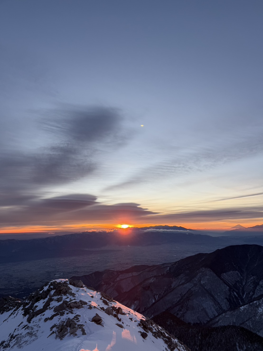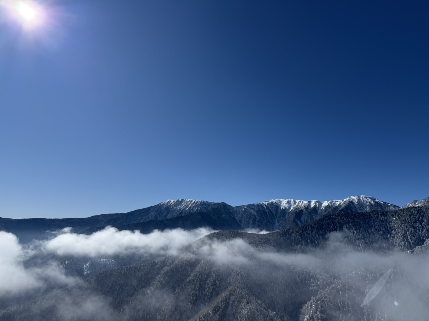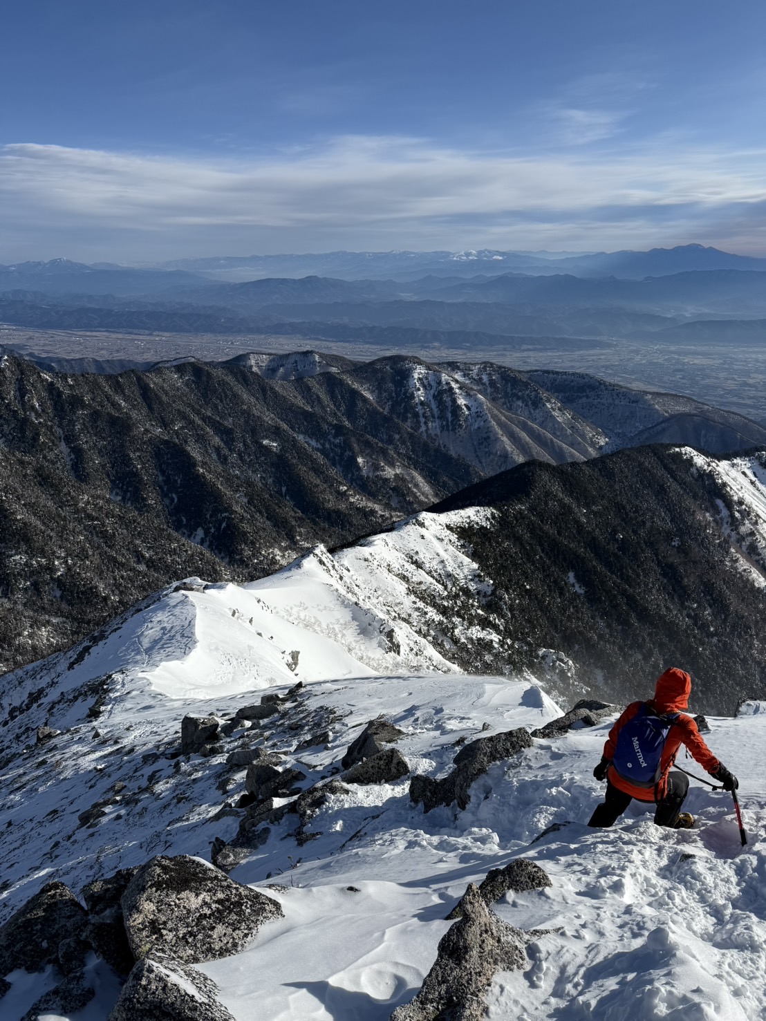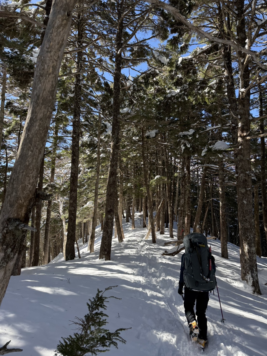 常念岳の冬限定ルートは、1955mまで急登が続く。さらに、森林限界の2178mの幕営地までテント泊装備ではかなり厳しかったが、前常念岳が見える絶好の場所に幕営でき、これまでの苦労が報われた。14時ごろまでは日差しが強く暑いくらいだったが、15時過ぎから急激に冷え込み、早めに就寝。翌朝5時出発、2400m付近の岩場を通過し、前常念岳を過ぎた辺りでモルゲンロートを、また山頂からは白銀の穂高連峰や槍ヶ岳と素晴らしい景色を堪能できた。