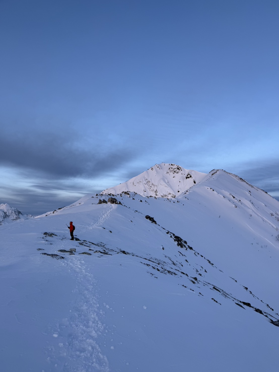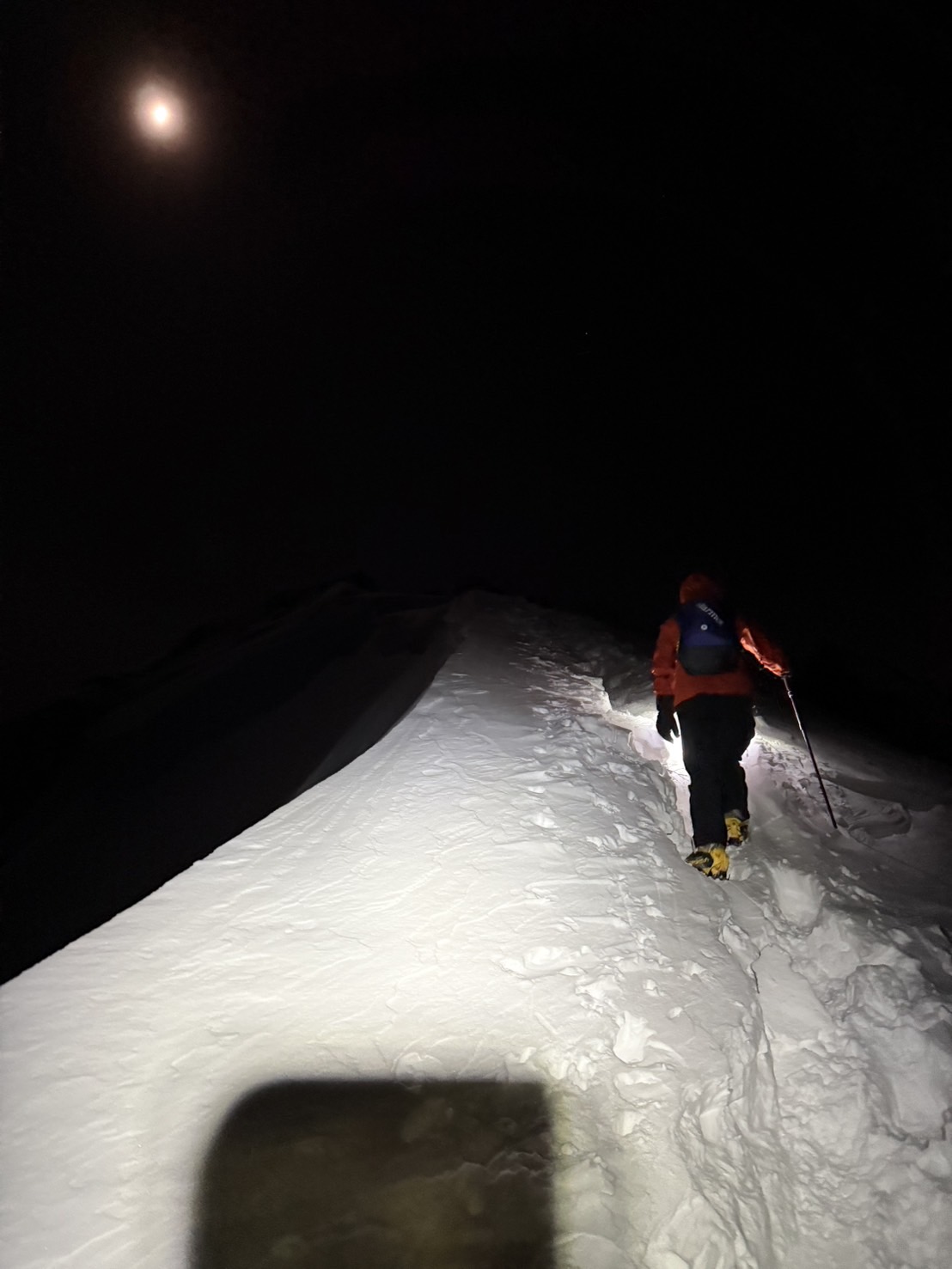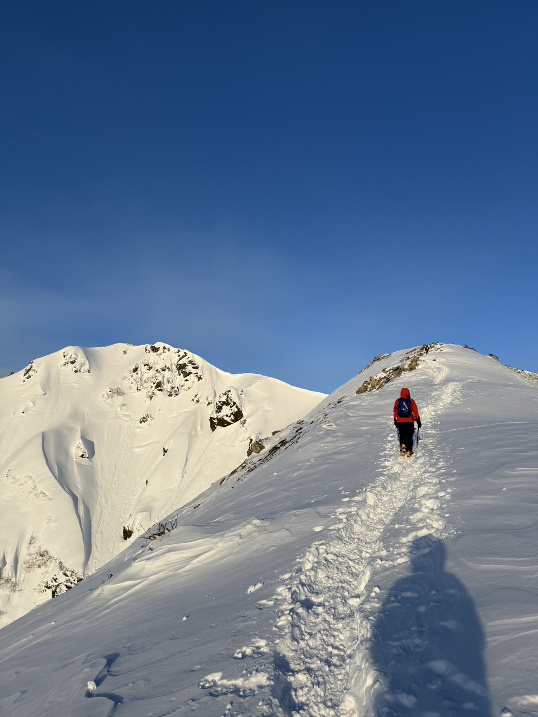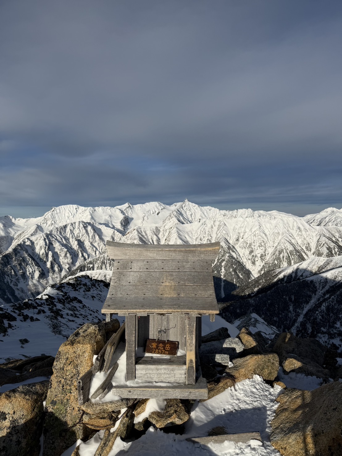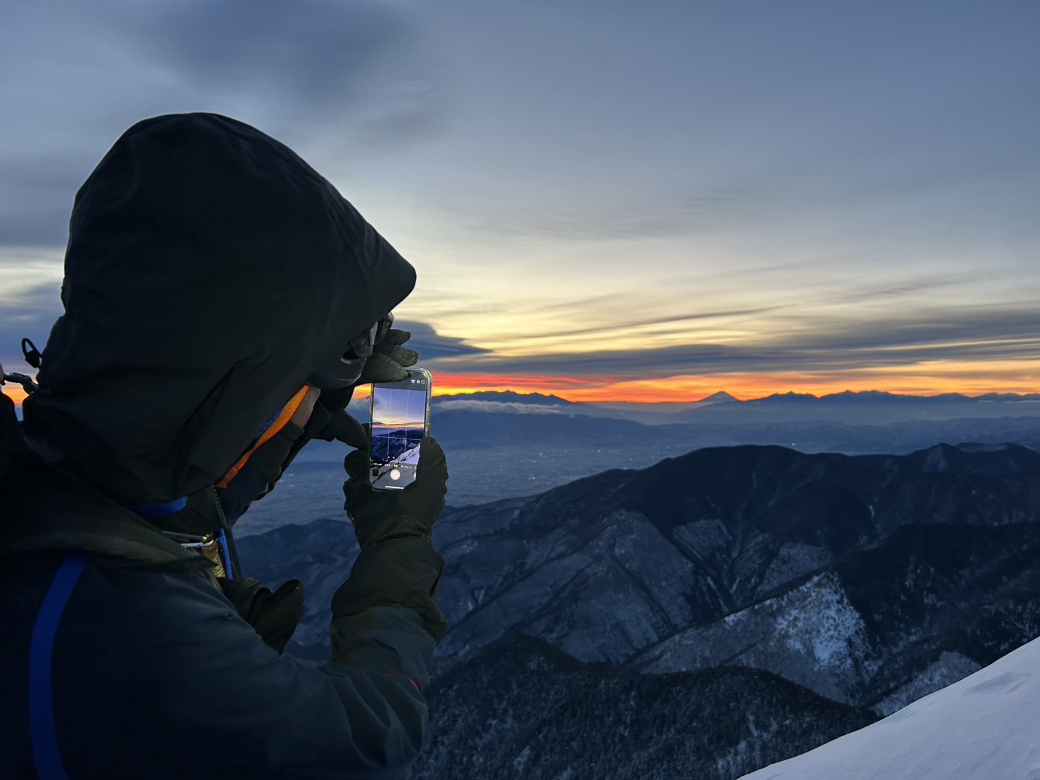 常念岳の冬限定ルートは、1955mまで急登が続く。さらに、森林限界の2178mの幕営地までテント泊装備ではかなり厳しかったが、前常念岳が見える絶好の場所に幕営でき、これまでの苦労が報われた。14時ごろまでは日差しが強く暑いくらいだったが、15時過ぎから急激に冷え込み、早めに就寝。翌朝5時出発、2400m付近の岩場を通過し、前常念岳を過ぎた辺りでモルゲンロートを、また山頂からは白銀の穂高連峰や槍ヶ岳と素晴らしい景色を堪能できた。