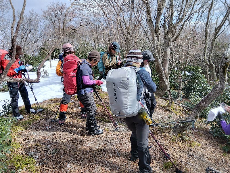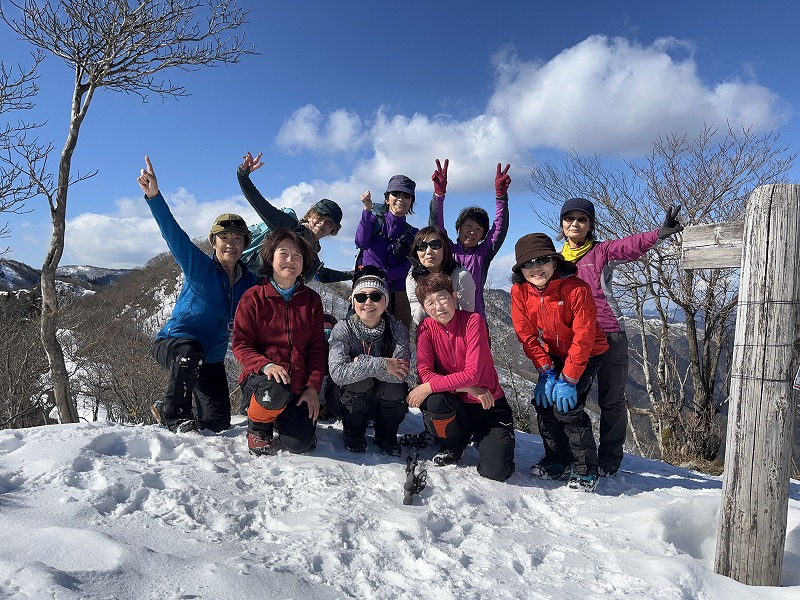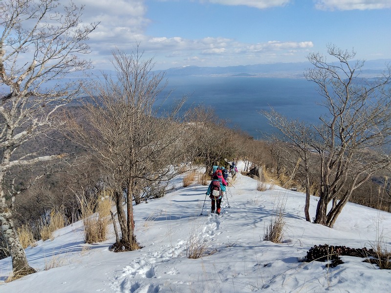 比良山系の釈迦岳とヤケ山の間に位置するヤケオ山(標高970m)。そのピークから南に伸びる梅ノ木谷南尾根と東側の中井新道という2つの廃道を、近江舞子駅を起点にぐるっと周回してきた。所々マーキングがあり、踏み跡が明瞭な箇所もあったが、ルーファイはなかなか難しかった。上部はしっかりした雪道で、踏み抜きに遭いながらも、青い空と白銀のコントラスト、眼下のびわ湖を楽しく眺めながら歩いた。(S.I.)