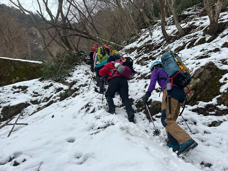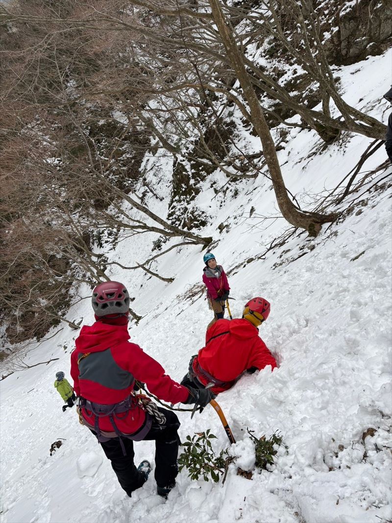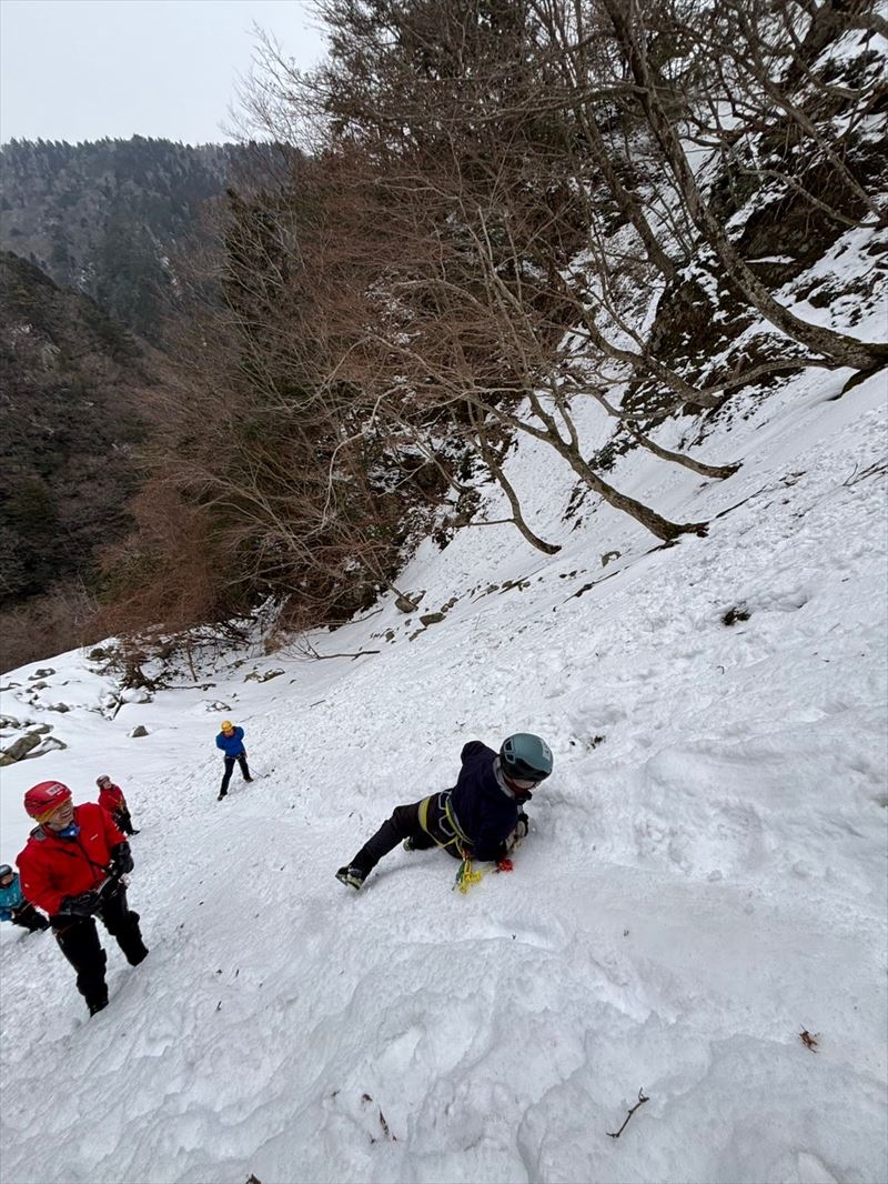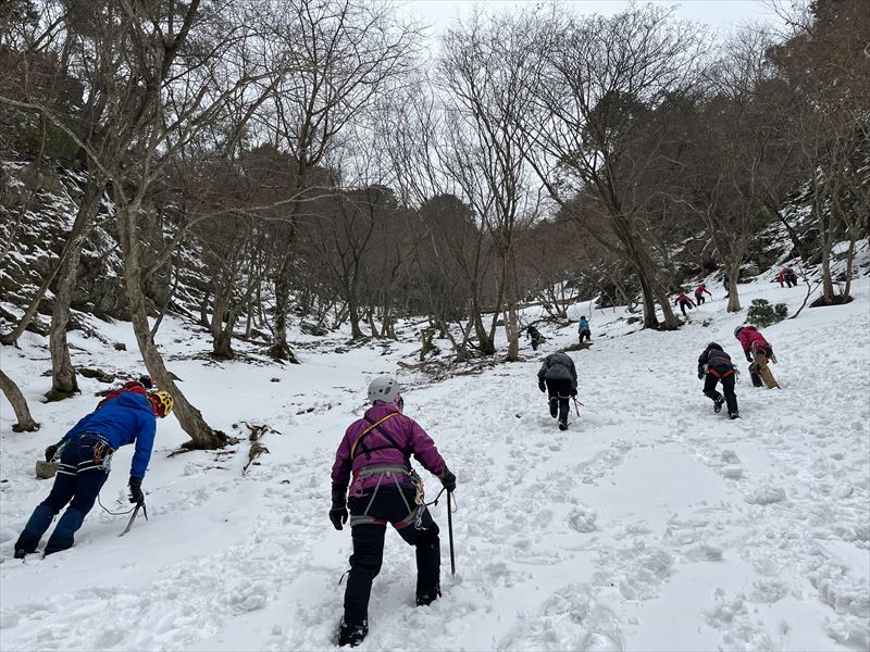 悪天の為2/1(土)のみで今年も比良で恒例の雪上技術練習会が実施されました。予定地の堂満岳北壁の下部に雪はないかもという不安のスタートでしたが、適度な積雪があり無事練習会ができました。内容は