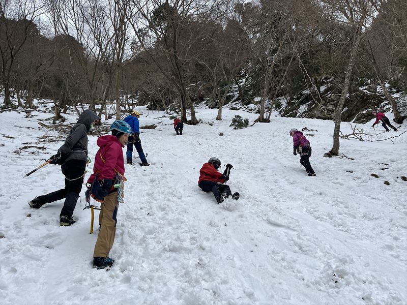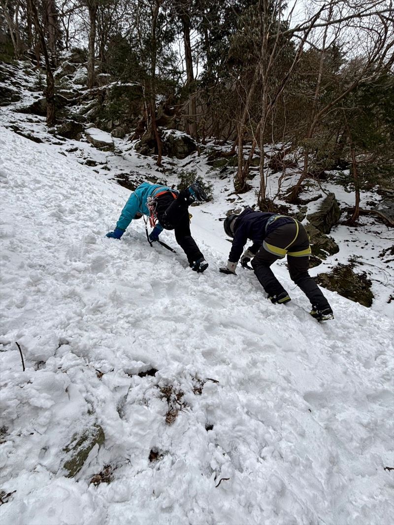 - 基本の雪上歩行 (アイゼン無し・アイゼン有り)、直登下降・傾斜登下降・トラバース