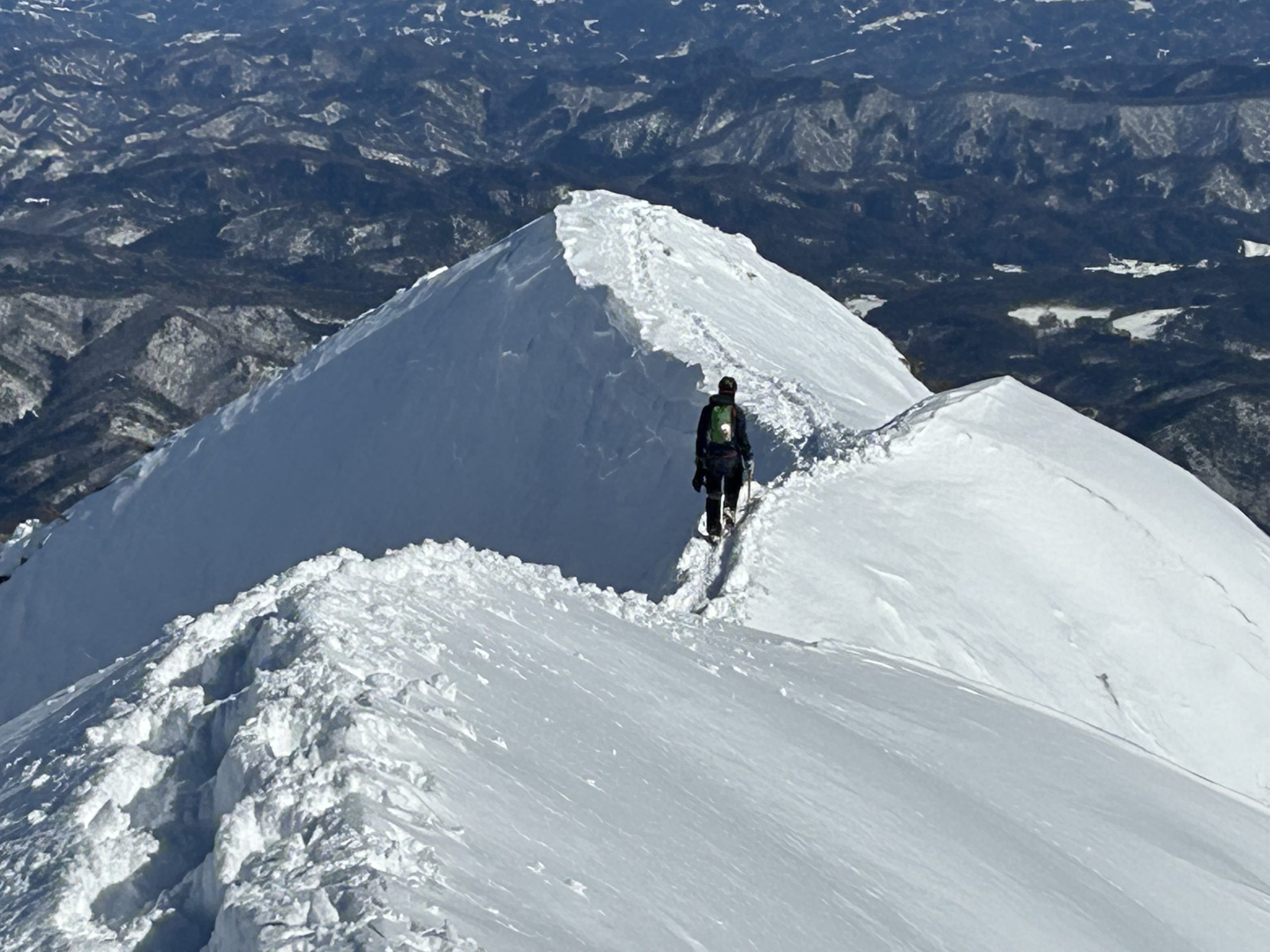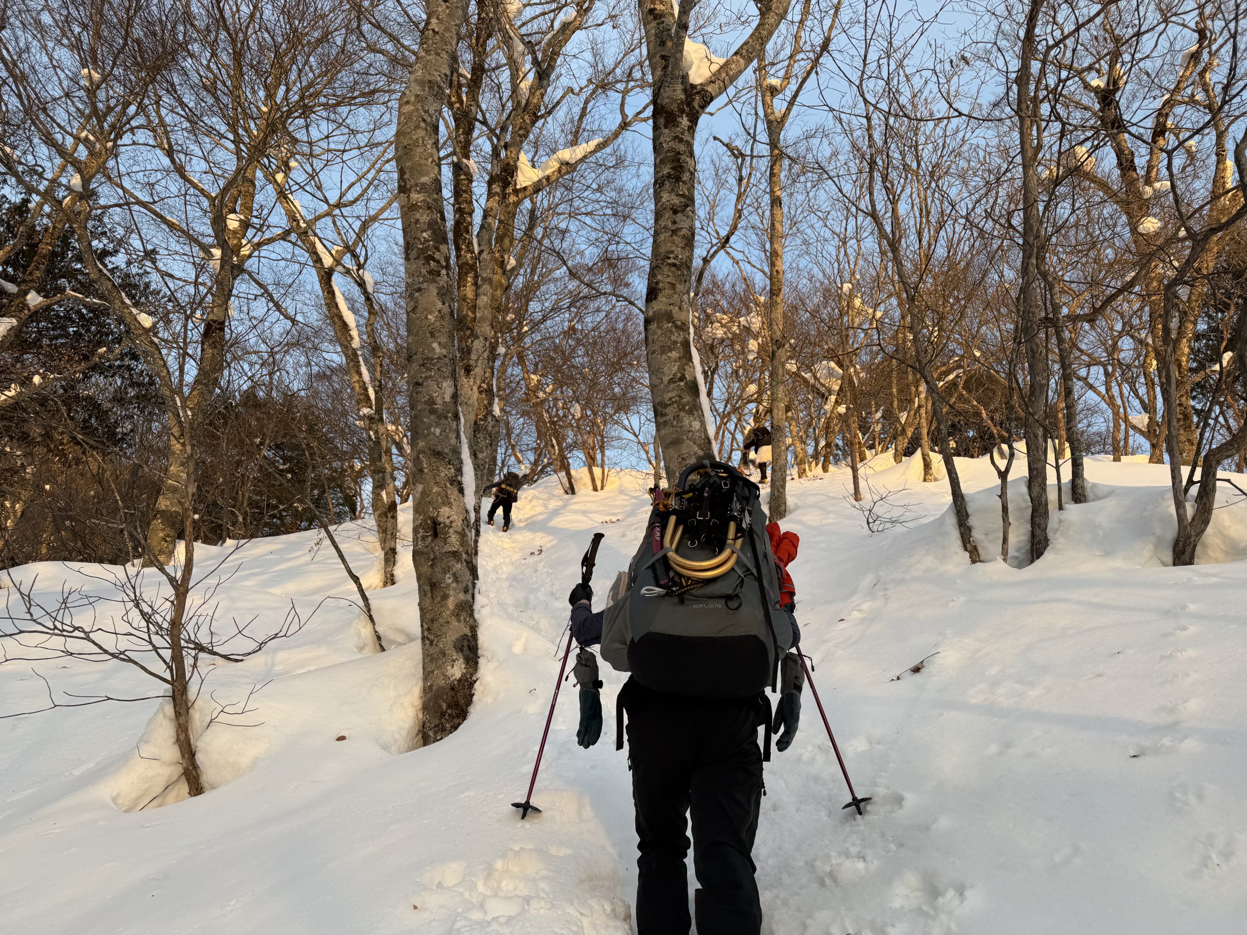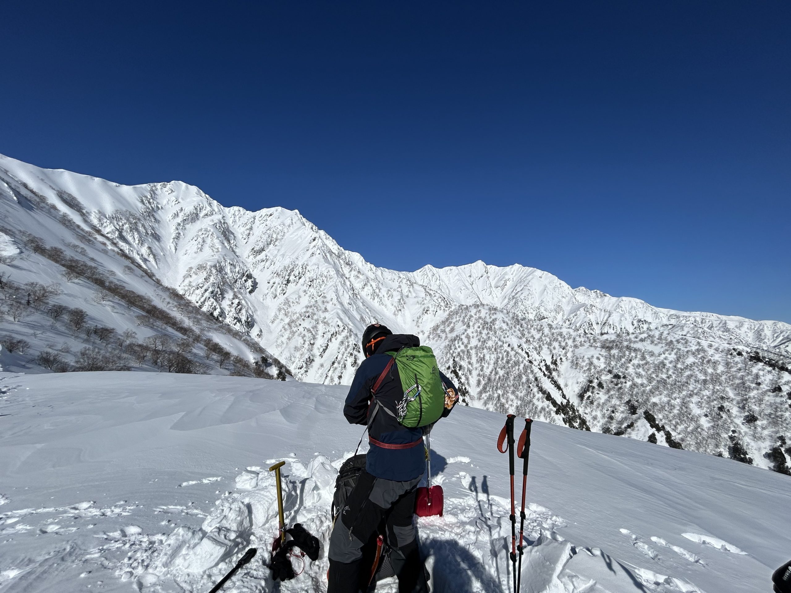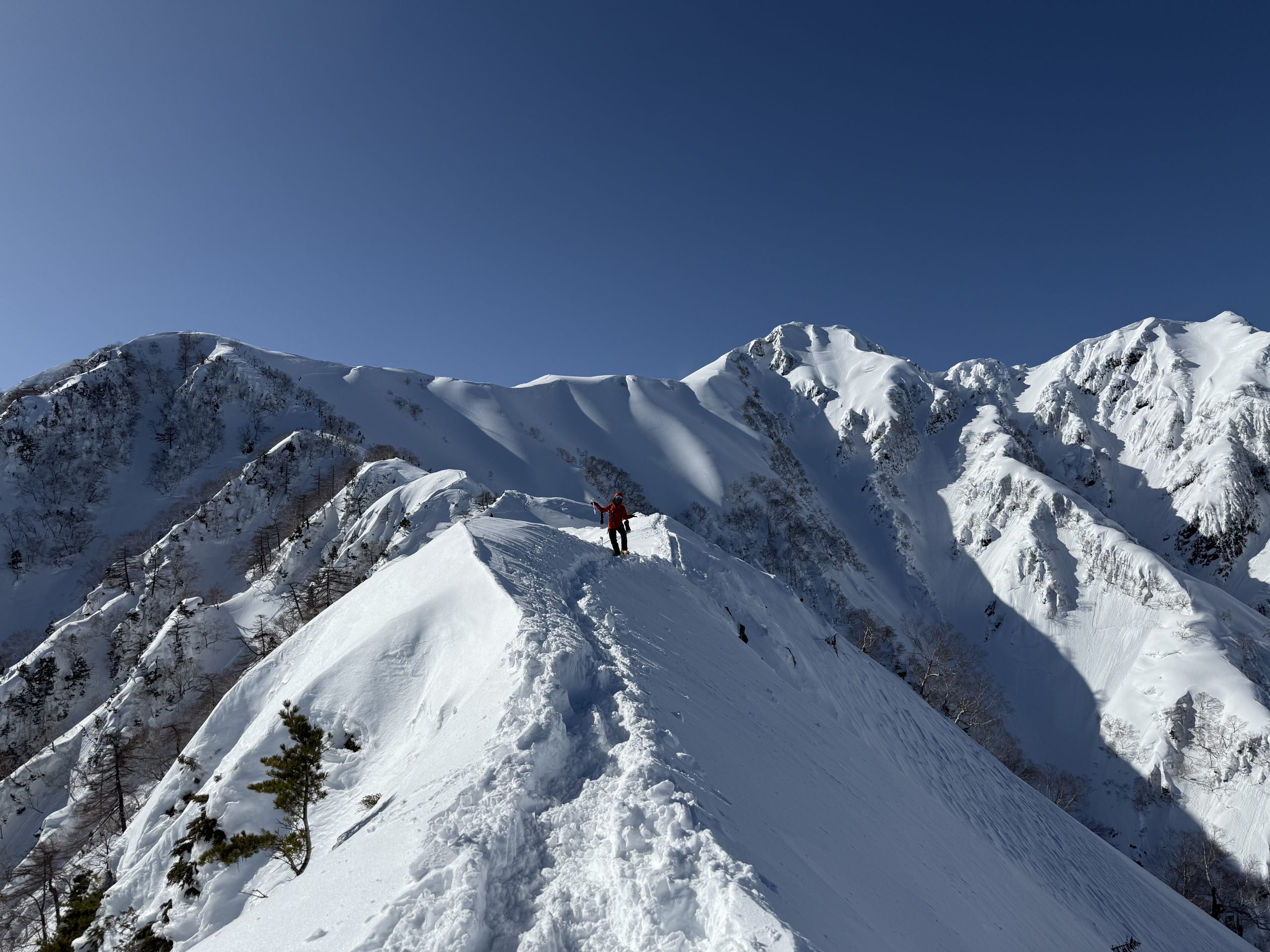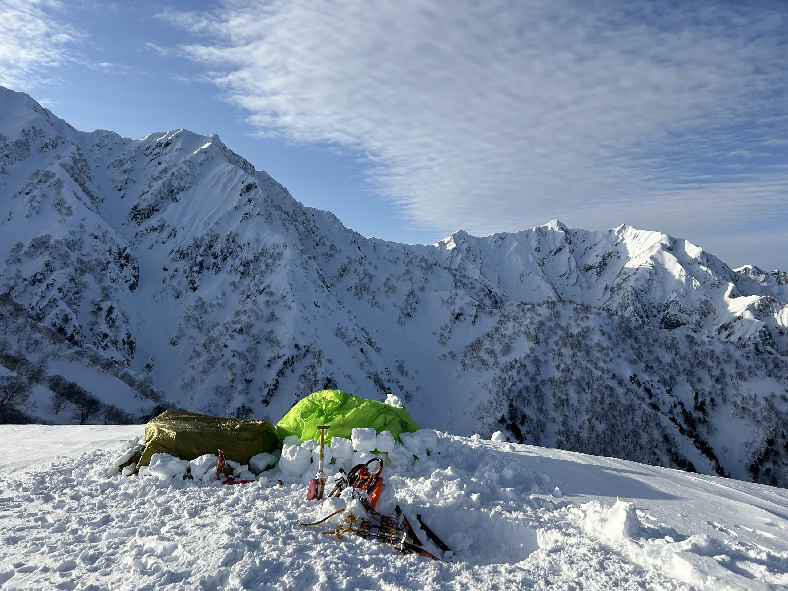 積雪期のバリエーションルート、爺ヶ岳東尾根にイグルー泊にチャレンジしました。初日は快晴の予報、2日目は降雪の曇り空だったので計画変更、初日にアタック。急登を登り続け、1978mのP3にザックをデポし山頂を目指す。トレースのおかげでナイフリッジも難なくクリア、急登につぐ急登でようやく山頂に到着、爺ヶ岳ブルーを堪能しました。イグルー作りは残念ながら時間切れ。ツェルトをかぶせ竪穴式雪洞に。2日目はガスガス、計画変更は大正解。下山はJPからの激下りが一番の核心でした。(Y.S)