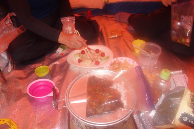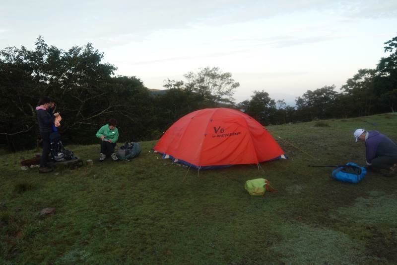 昨年の秋から趣味登山会に加えていただき、例会でご一緒する方々がいとも簡単にテント泊をされているのを何度となく聞きました。「私もいつか、、、」という思いが膨らみ、ようやく今回実現に至りました。テントを組み立てたり、お食事の準備をしたり、寝袋にくるまって眠ったり、、、全てがイベントでした。はしゃいでいたと思います。