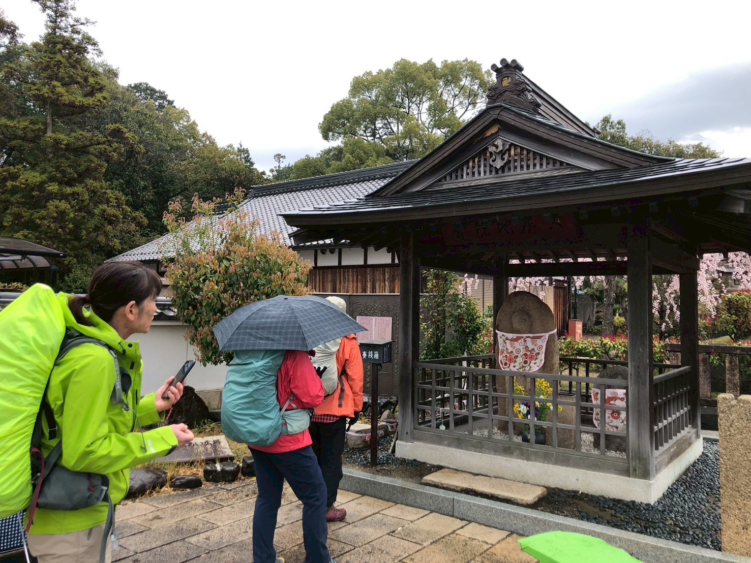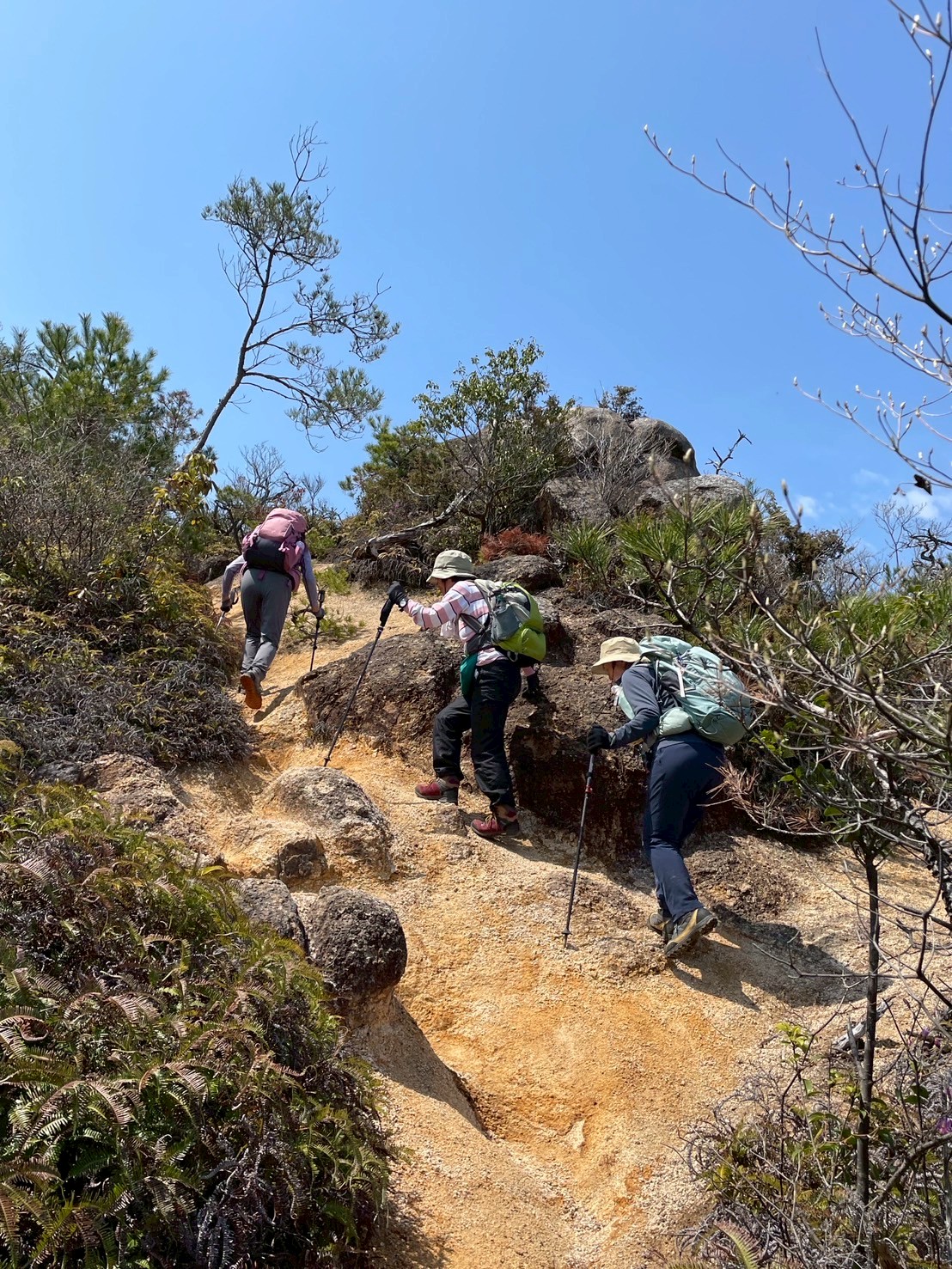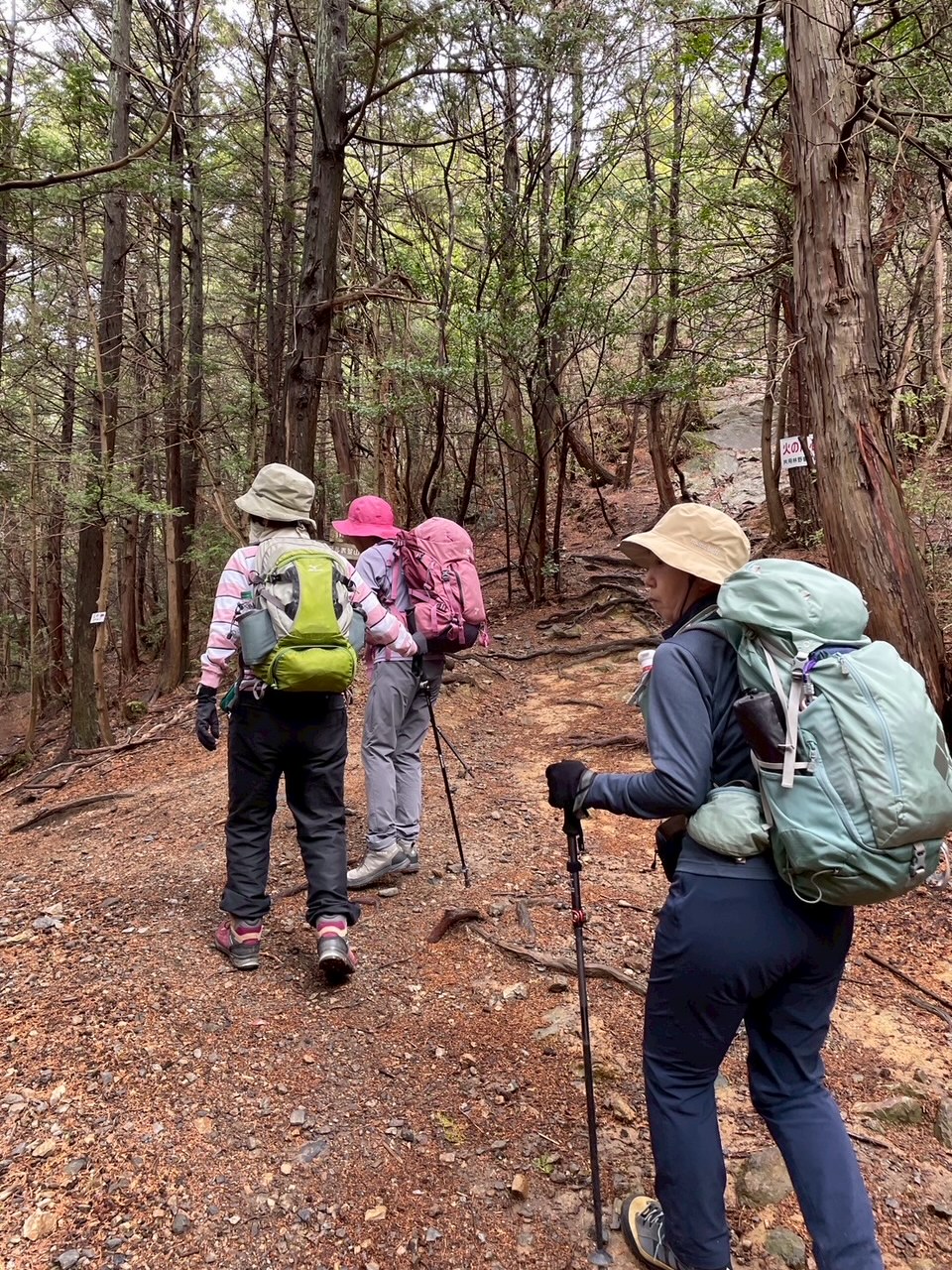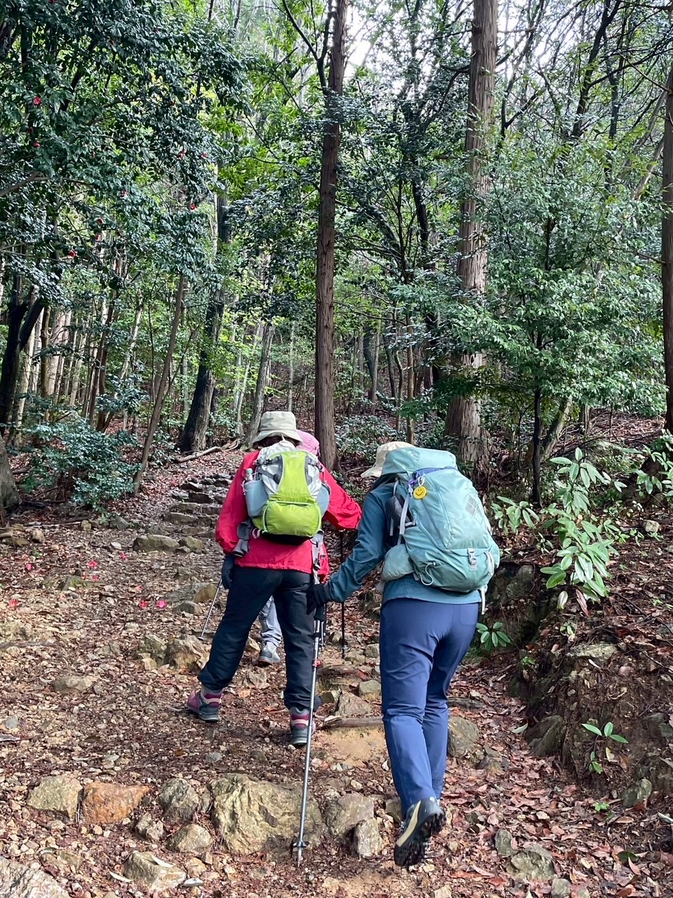 傘をさして出発したが、10分余りで青空が見えだした。予想より早い天気の回復、ラッキー!裏登山道から三上山へ。雨の後なので木の根っこや岩の上を慎重に歩く。