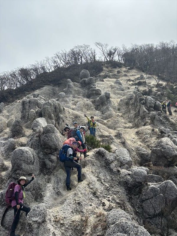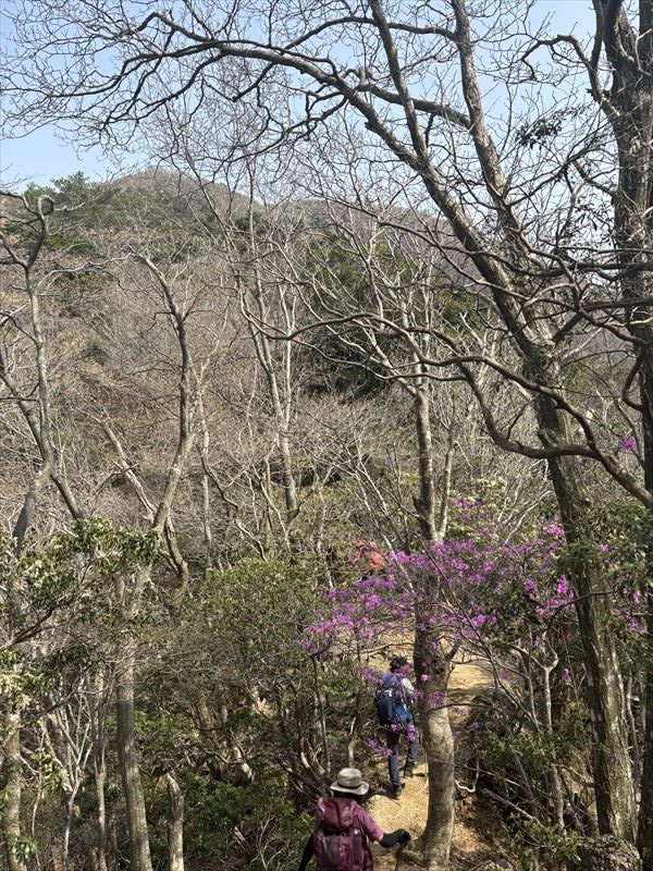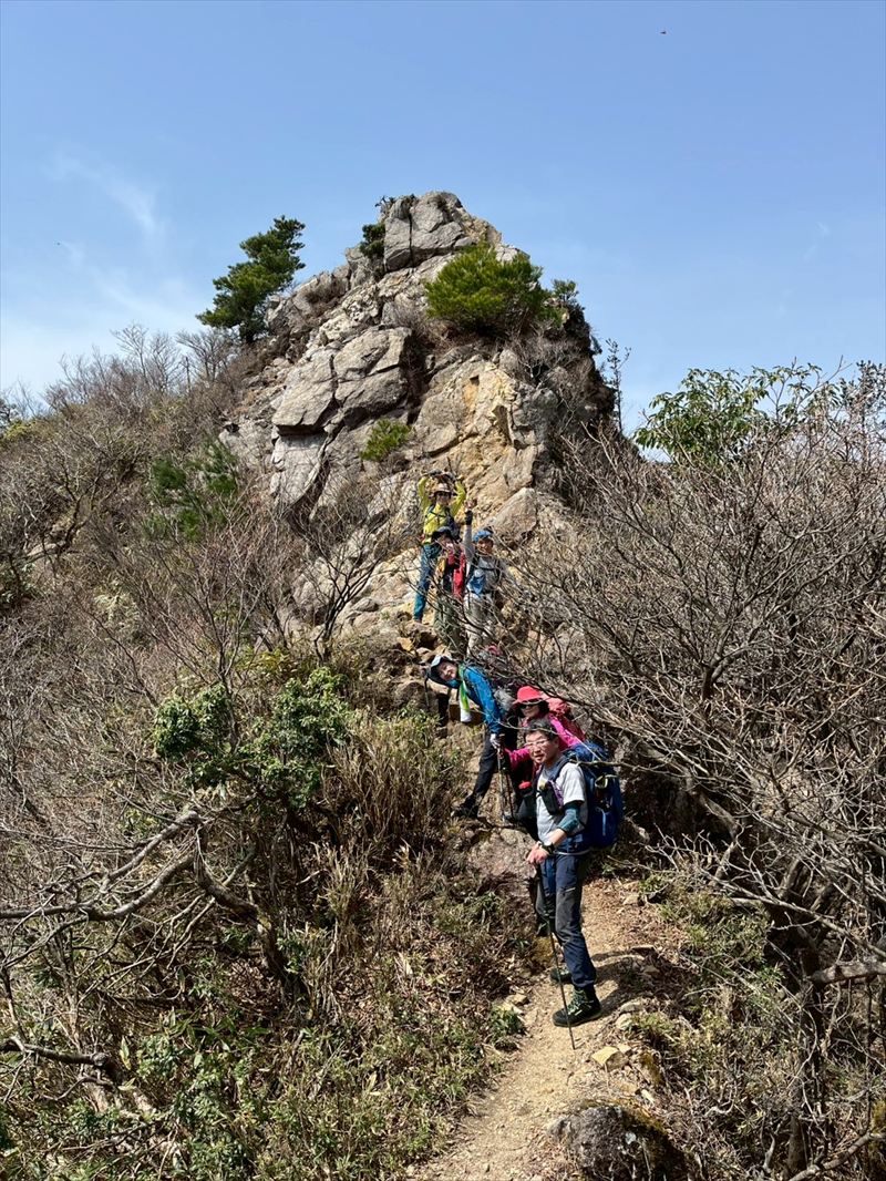 宮妻峡駐車場からカヅラ谷経由の反時計回りで歩き始める。沢を超えるとザレた急登が続くが花を見ながら元気に鎌ヶ岳へ登頂。 この後周回はギザギザの鎌尾根、衝立山、キノコ岩を経て水沢岳から水沢峠へと続き、大休止の最後にはダメ押しのようにイワクラ尾根のアップダウン。アカヤシオ、イワウチワ、ハルリンドウなど鈴鹿の花々に励まされ入道ヶ岳に無事ゴール。天空の山頂で四日市の眺望を満喫して無事終了。