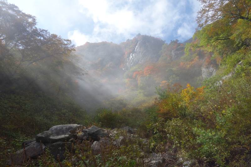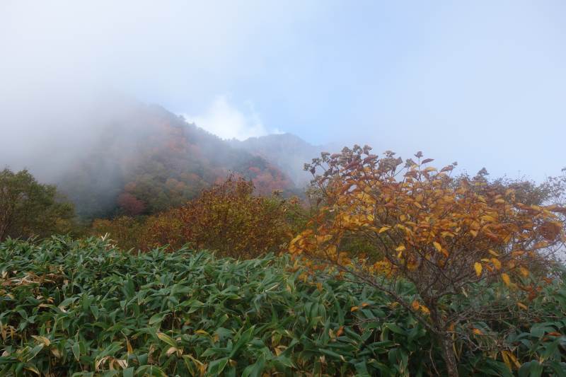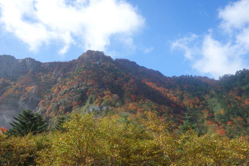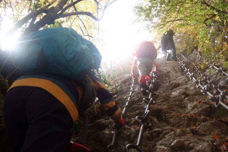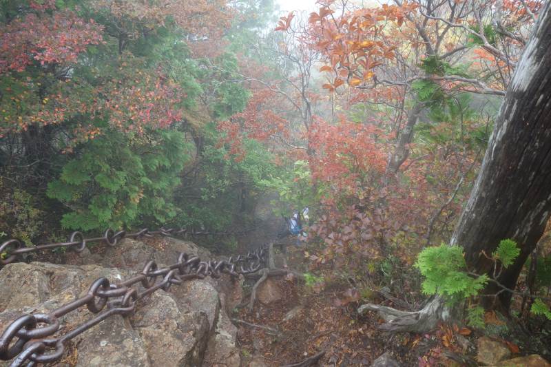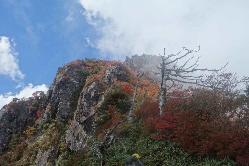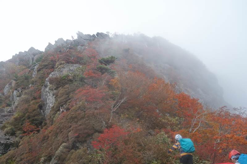 東稜を登り始めるころには青空が広がり、綺麗な紅葉を楽しめました。東稜では、最後の岩登りがちょっと大変で、前客3名が往生していたので、まず彼らを上げてから、登りました。天狗岳~弥山間は凄い人で、交互通行で行き来していました。予定よりだいぶ遅れたので、急ぎ足で下山しました。 Report: H.I.