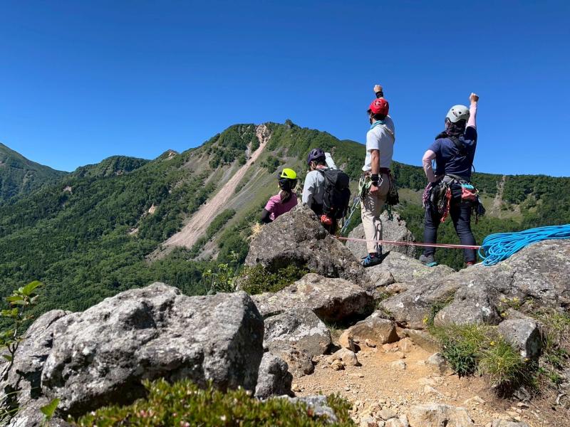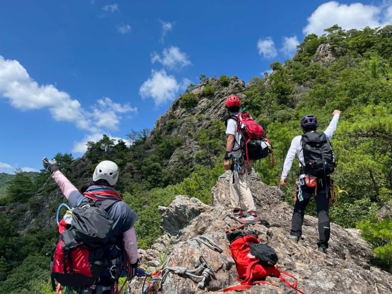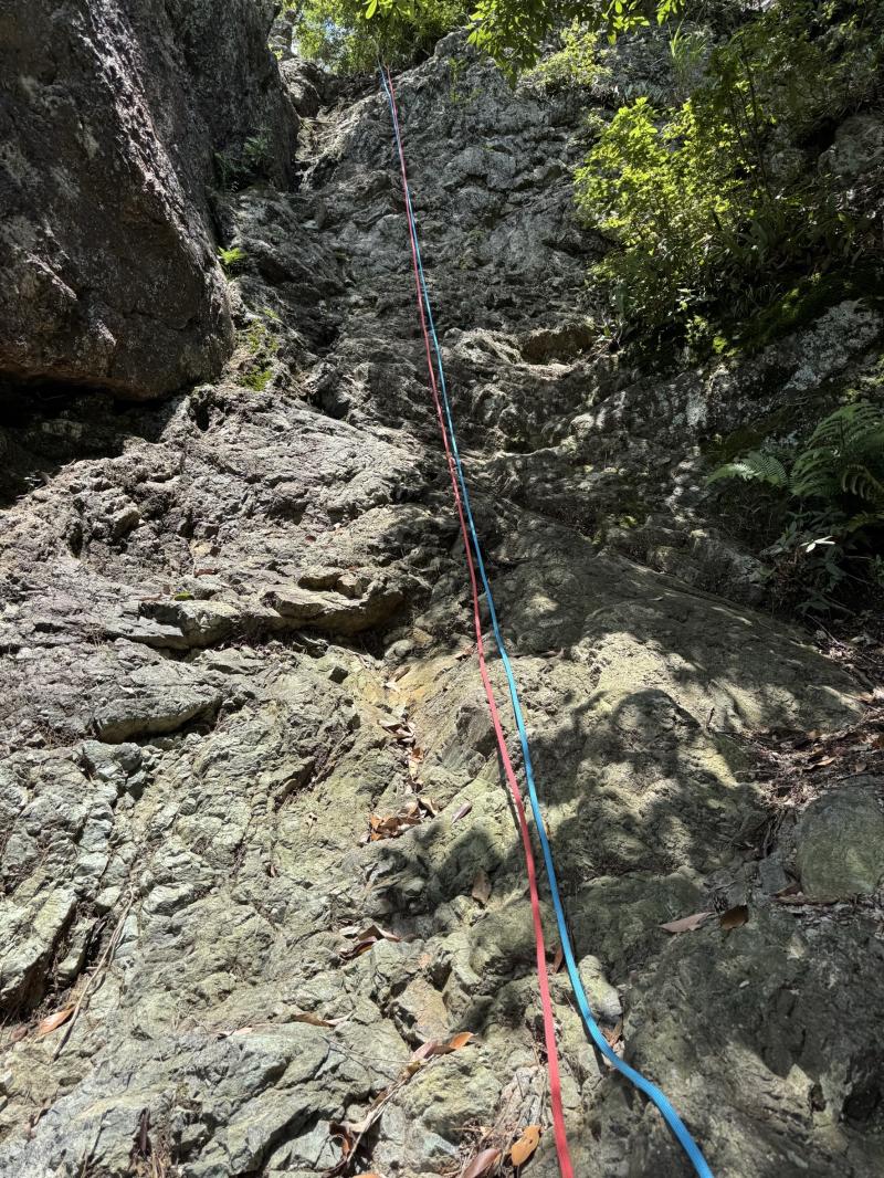 3日目、美濃加茂の岩場で3pの快適クライミング。少し難し目の4p目を終えた所で時間切れ終了とする。高度感、絶景、練習の岩場とは違う緊張感、臨機応変にする事、色々経験を積めたと思う。