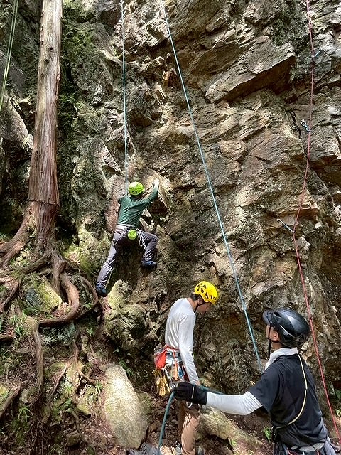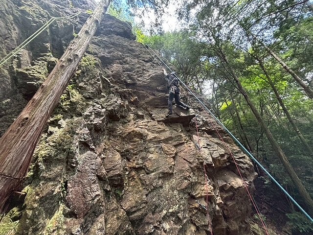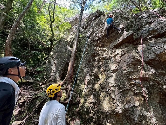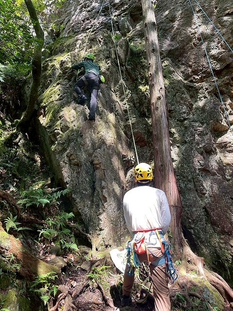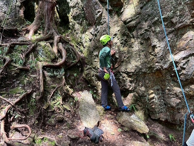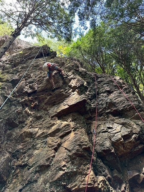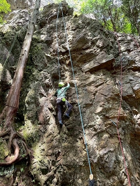 左カンテルート5.5と逆層フェース5.10aが空いており2本ロープをはり順番に練習