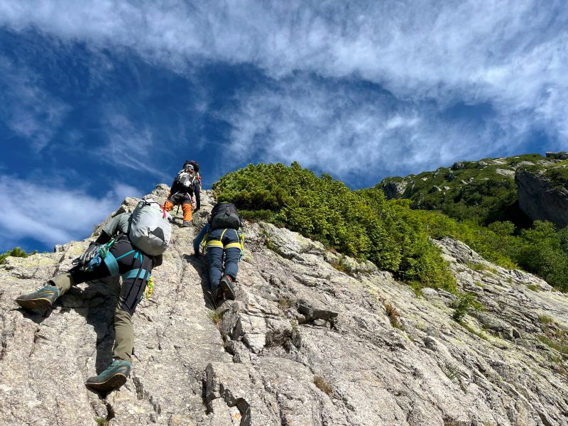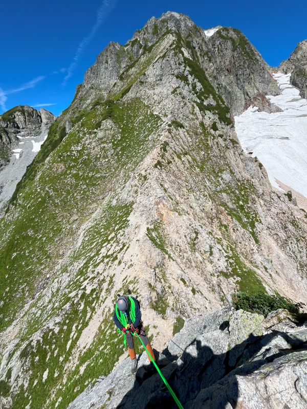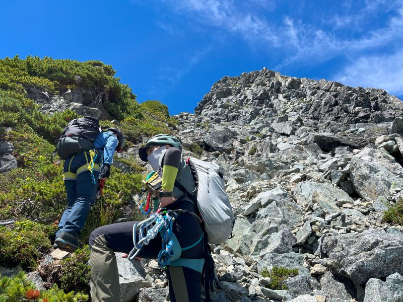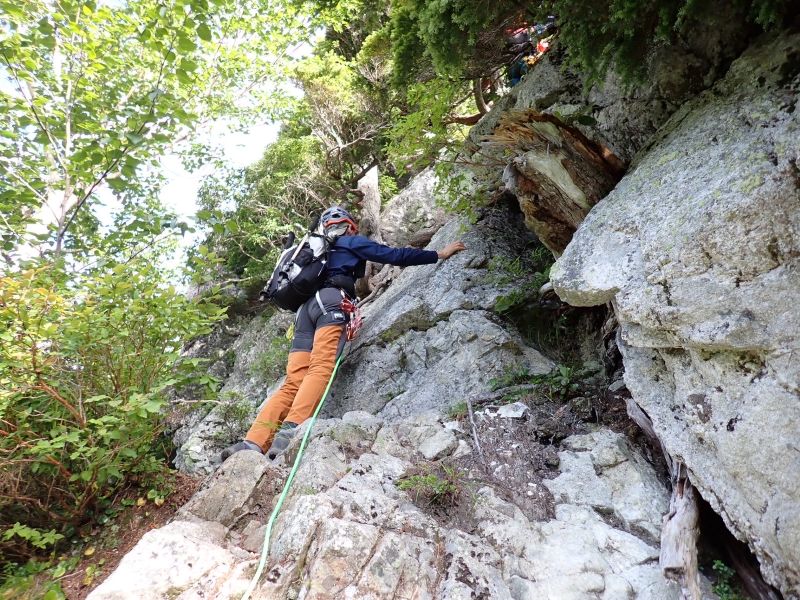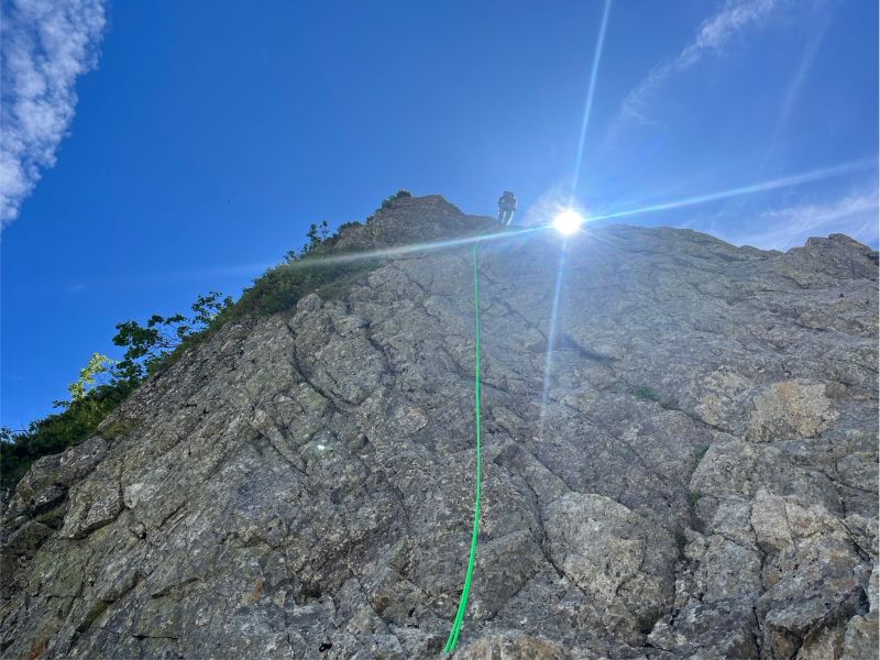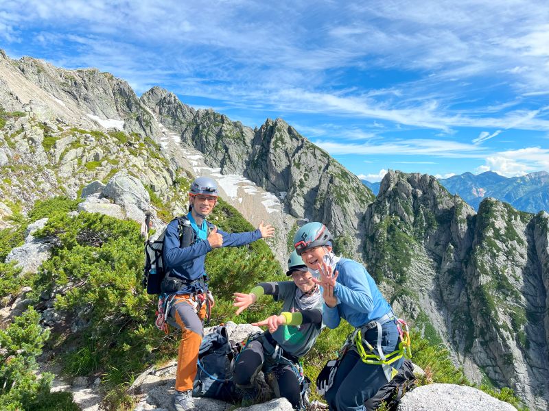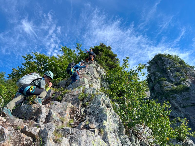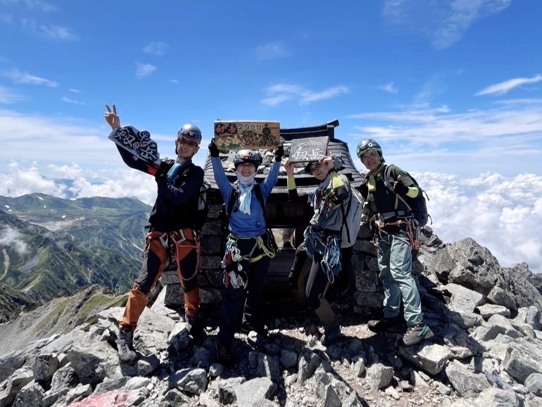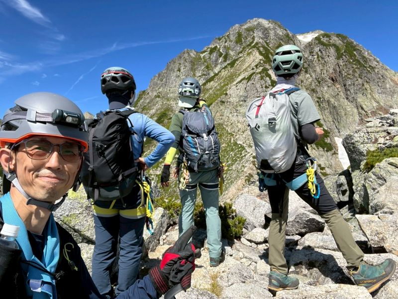 昨秋の集中登山を機に入会された3名の同期組と一緒に、源次郎尾根から剱岳を登ってきた。初日は剱沢キャンプ場でテント泊。翌朝4時過ぎに出発、5時半取り付きへ。木登り、岩登り、岩稜歩きを繰り返してI峰~II峰に到達すると、眼前に聳え立つ本峰、右手に八ッ峰、後方に長大な後立山連峰と、壮大な景色に感嘆の連続。II峰からの豪快な懸垂下降を経て、最後の登りを踏ん張り12時過ぎに登頂。天気に恵まれ、最高の登山となった!(S.I.)