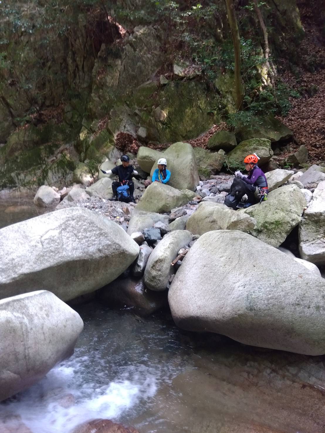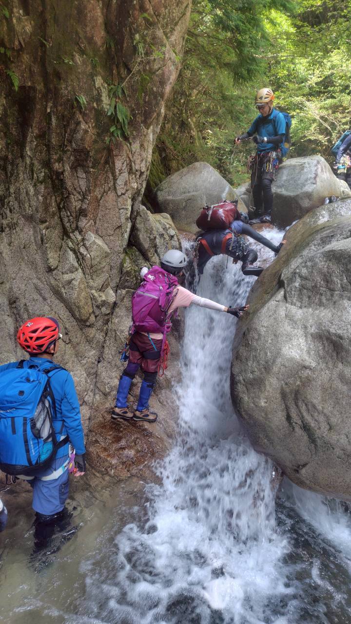 魚止めの滝から先は大きな岩が点在するゴーロ帯何とか皆で協力して上がり、大きな滝が2つ並ぶ燕滝、ここはロープを出してアッセンダー等で安全に上がるのだが、間違って宇賀渓本谷に上がり行けども行けども