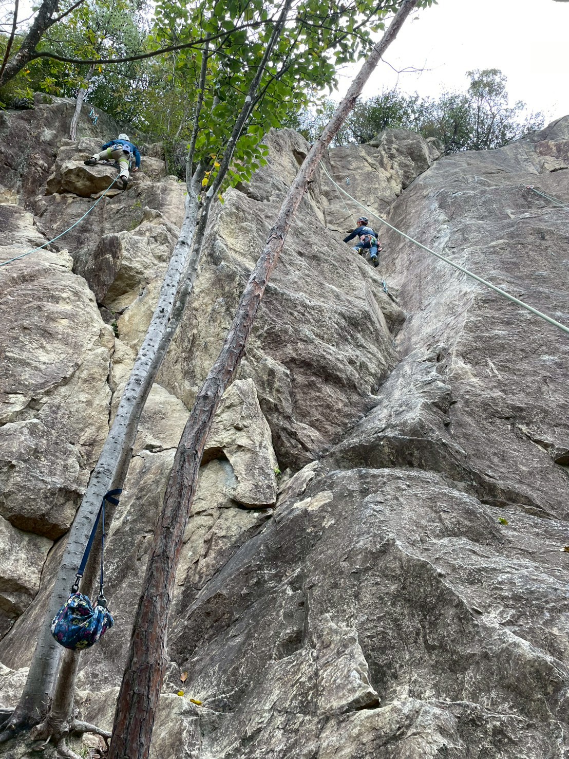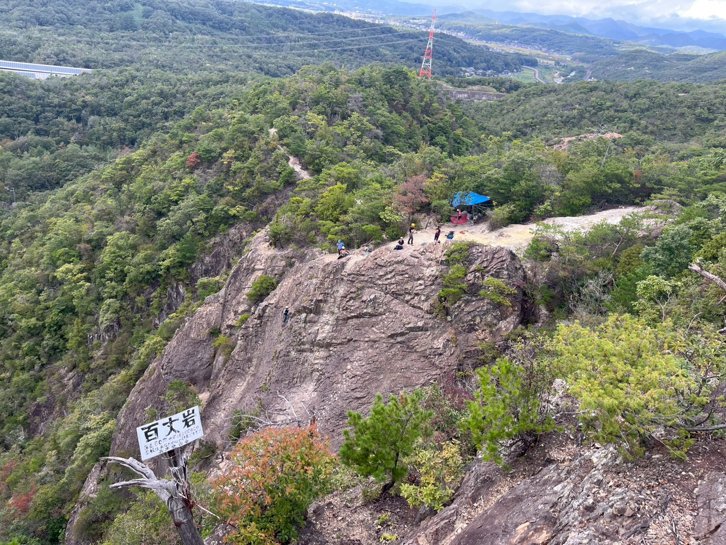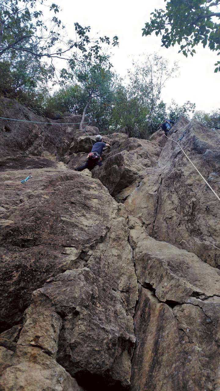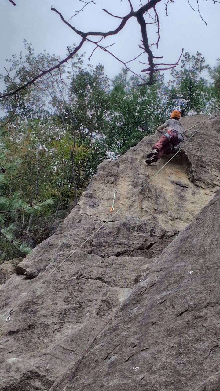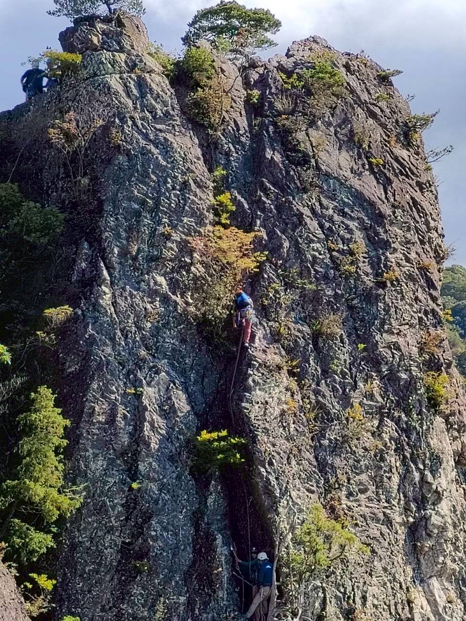 当初百丈岩でマルチ実践を兼ねてロープワーク等の技術確認をメインにし、余った時間を近隣の烏帽子岩でクライミング練習をする予定でしたが、例会当日は朝から少し小雨で岩場の状況が読めず、順番変更。最初に乾きのよい烏帽子岩でクライミングを行い、天気の様子を見て百丈岩でのマルチ練習に切り替えました。作戦変更はうまくいき、午前中に烏帽子岩で各自3~4本程度、午後は百丈岩に移動し3組に分かれローソク岩左の2ピッチのマルチを楽しみました。