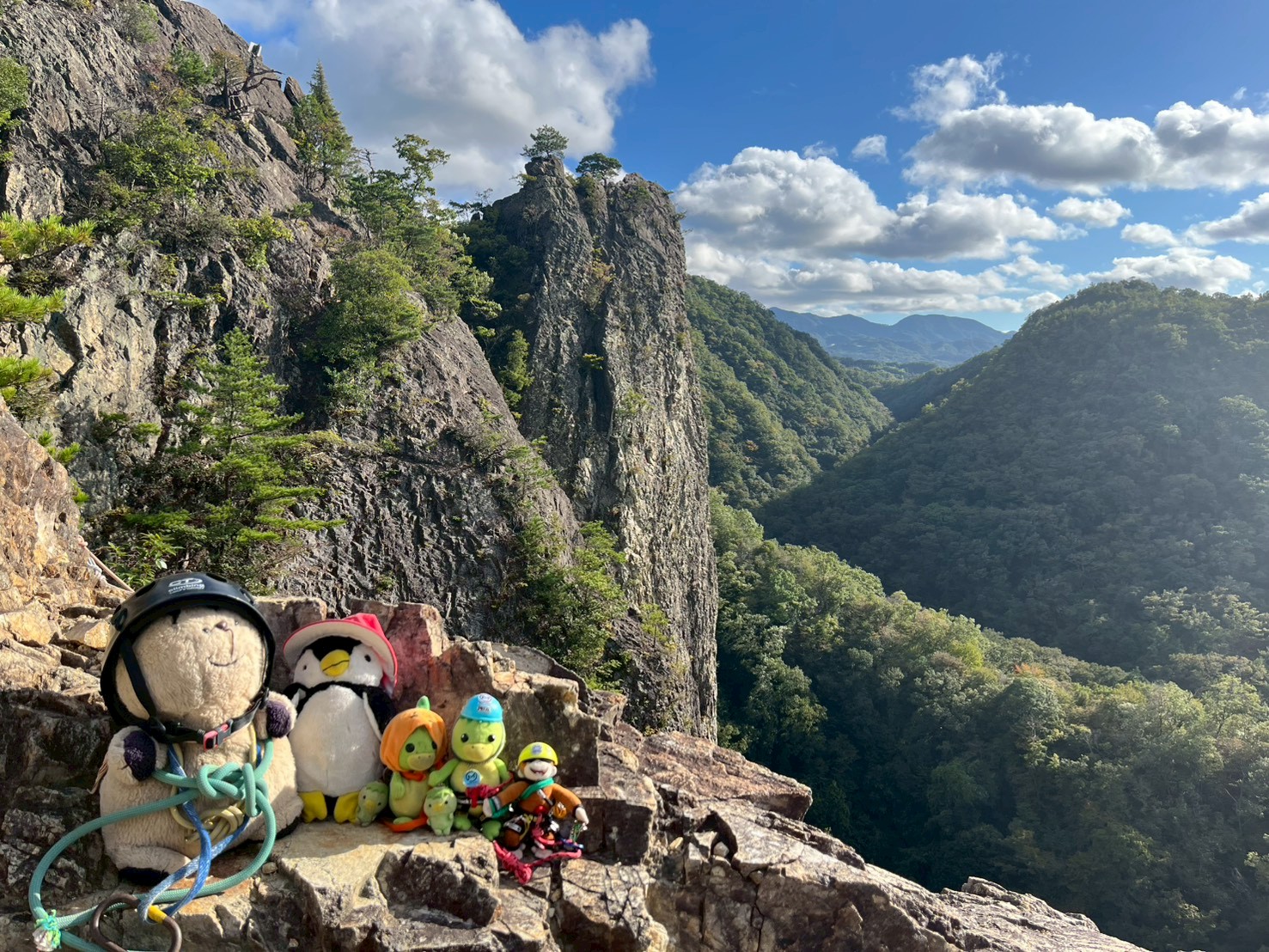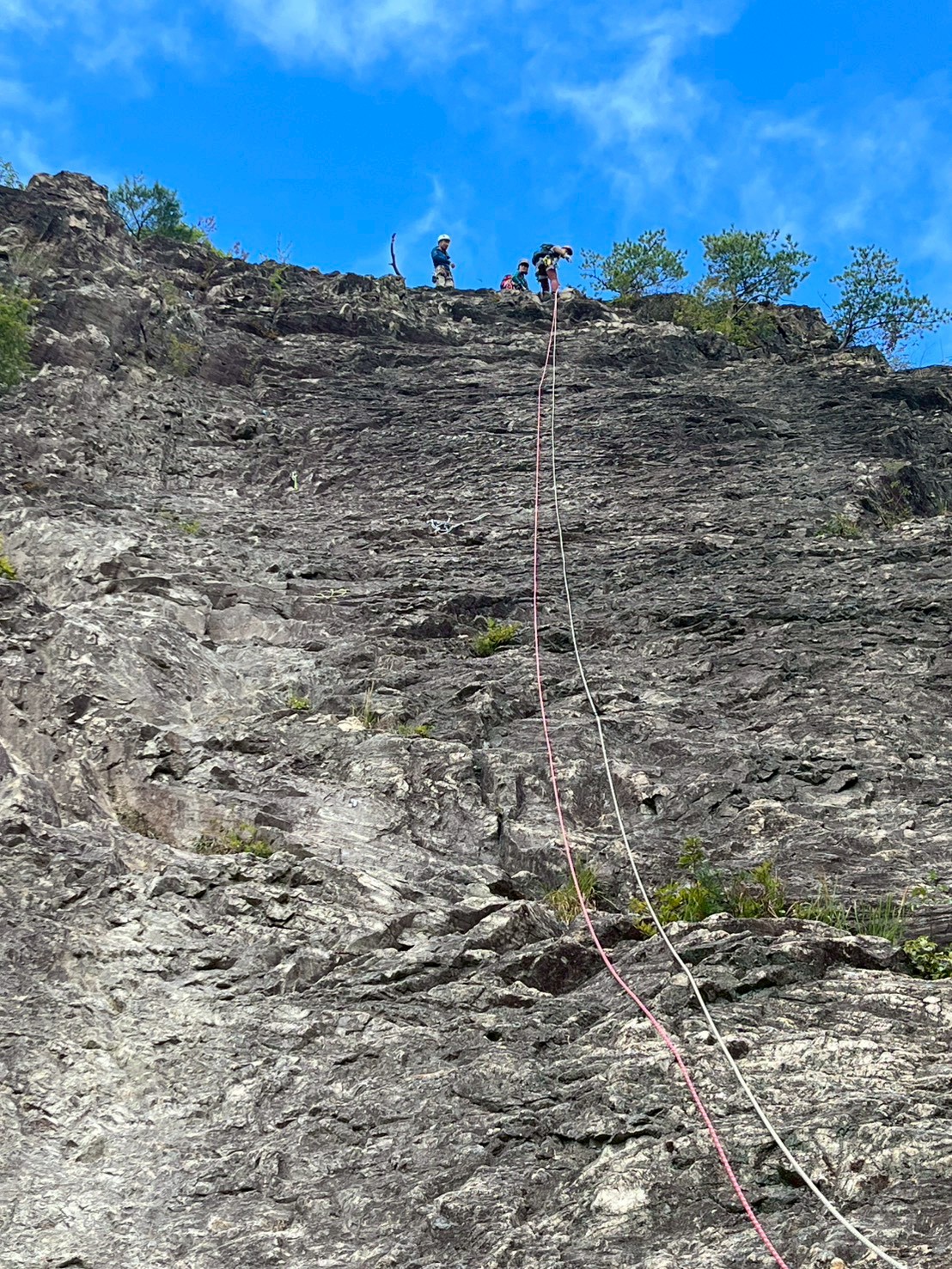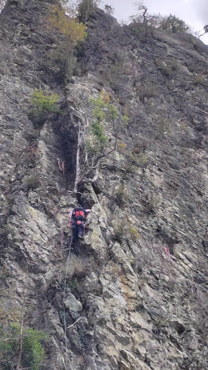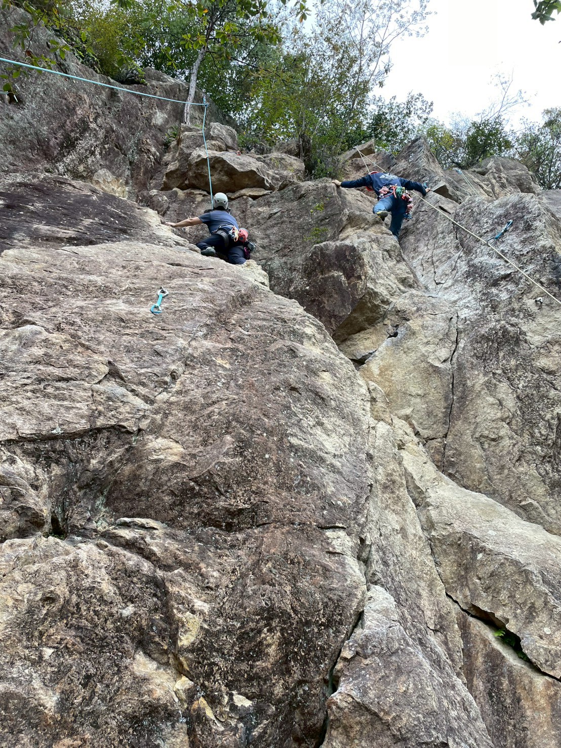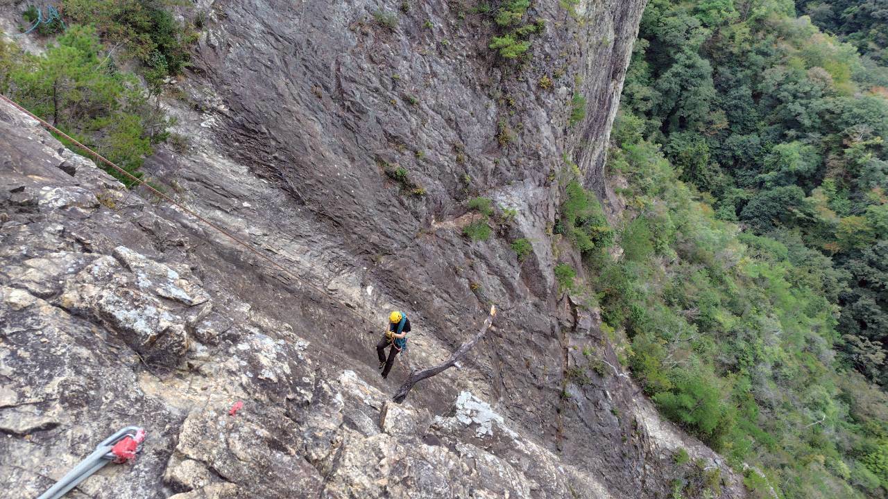 当初百丈岩でマルチ実践を兼ねてロープワーク等の技術確認をメインにし、余った時間を近隣の烏帽子岩でクライミング練習をする予定でしたが、例会当日は朝から少し小雨で岩場の状況が読めず、順番変更。最初に乾きのよい烏帽子岩でクライミングを行い、天気の様子を見て百丈岩でのマルチ練習に切り替えました。作戦変更はうまくいき、午前中に烏帽子岩で各自3~4本程度、午後は百丈岩に移動し3組に分かれローソク岩左の2ピッチのマルチを楽しみました。