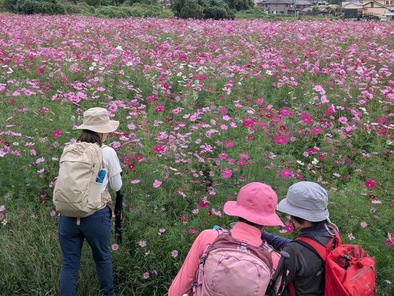 気温は20℃前後と絶好の季節になったが、雨上がり直後で風も無く蒸し暑い中でのハイキング。涌出宮参拝後は美しい竹林の中を通り抜け、道中あちこちに頭を出しているキノコ達を眺め、南山城地区最高峰の三上山頂上展望台へ。360度の大展望を満喫し、昼食休憩。いにしえの都の様々な遺構を巡りながら、満開のコスモス園で目の保養をし、くにのみや学習館で古都の歴史をビデオ学習した。雨に降られることもなく盛り沢山の例会でした(T.N)