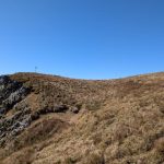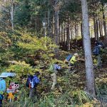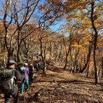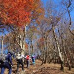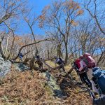 「T字尾根」を左の横棒から登ってきた。登山口からP878までは急登。ちょうど見頃の紅葉に励まされ順調に登っていく。テーブルランドへの最後の登りを頑張ると、登ってきたT字尾根や鈴鹿の山々が見渡せるという素晴らしいご褒美が待っていた。ボタンブチ~天狗の鼻から御池岳~奥の平の周回は、草紅葉(終盤ではあるが)の中を歩くのがとても気持ちよく、参加者の中からも念願のT字尾根に来られて良かったと感激の声が聞けた(M.M)