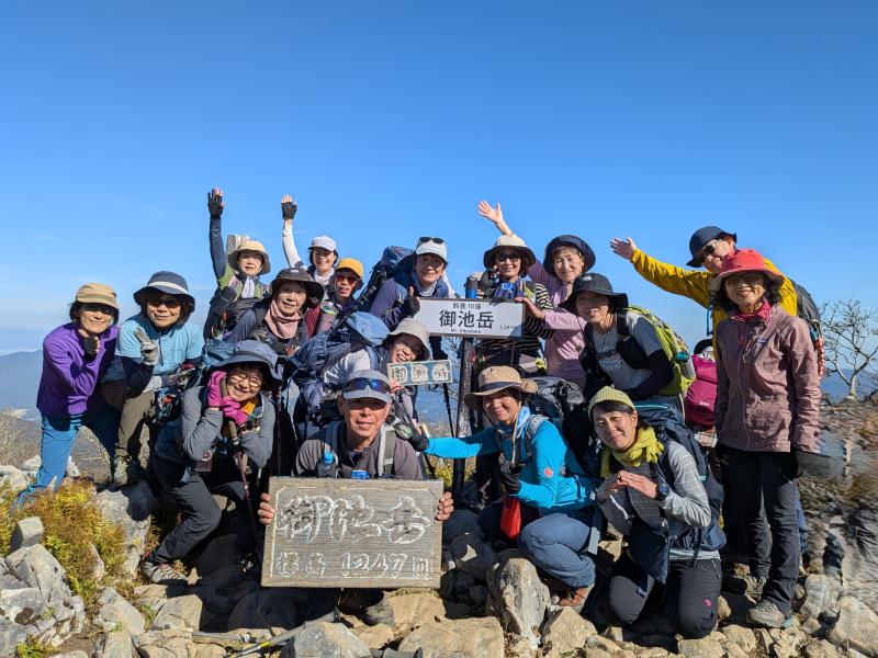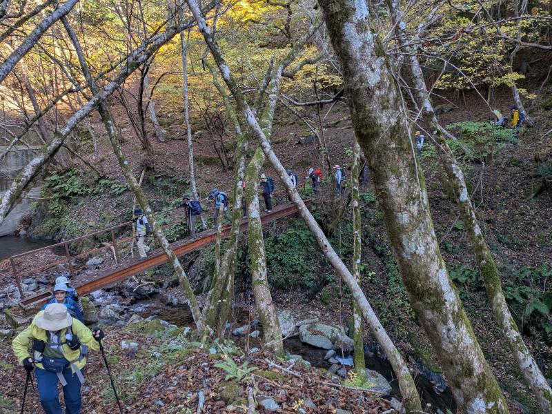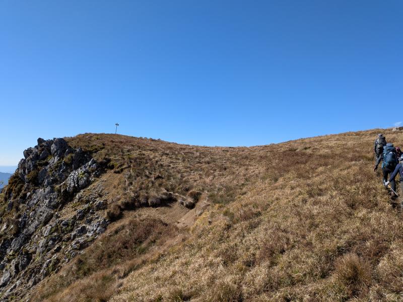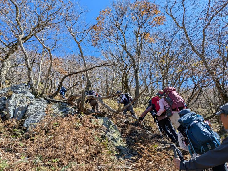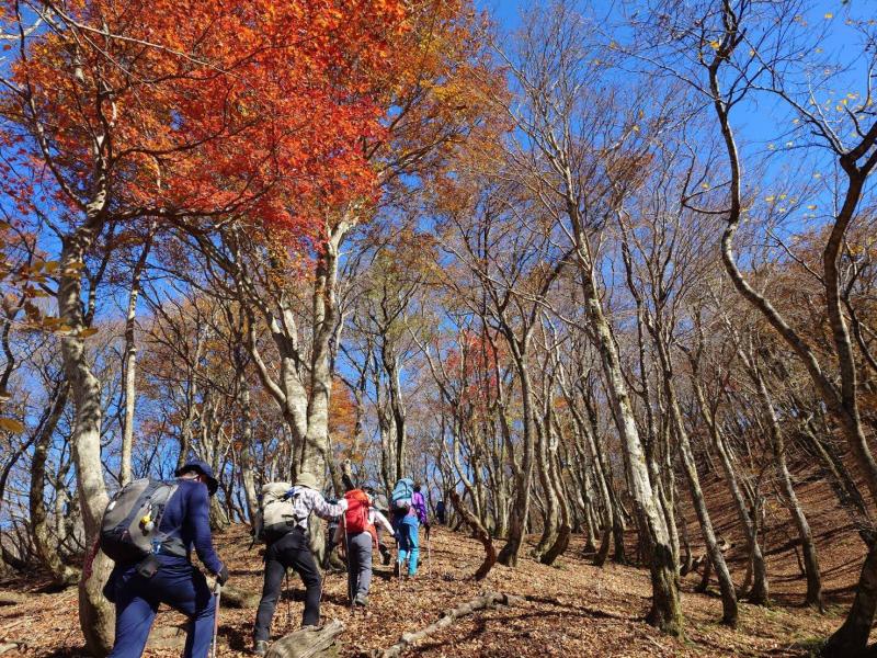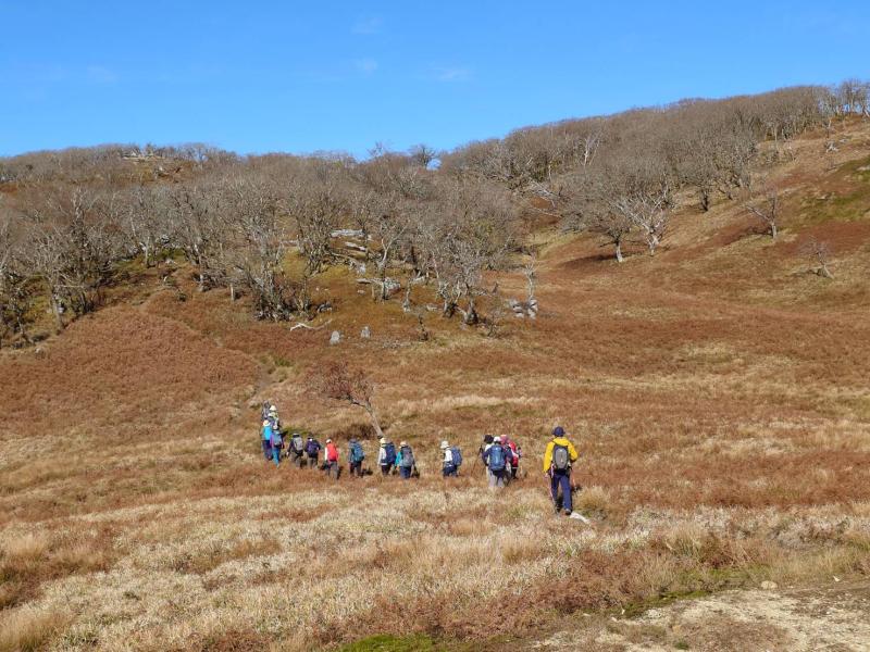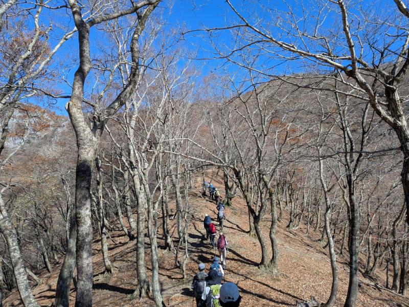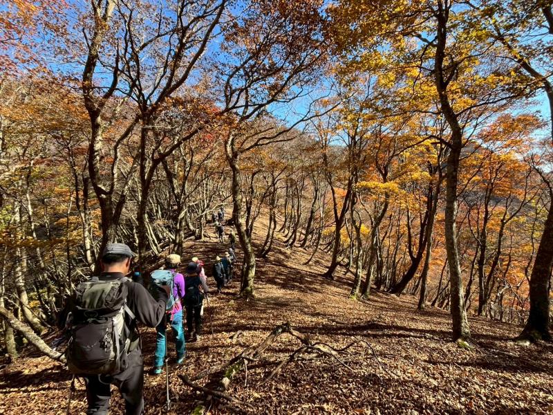 「T字尾根」を左の横棒から登ってきた。登山口からP878までは急登。ちょうど見頃の紅葉に励まされ順調に登っていく。テーブルランドへの最後の登りを頑張ると、登ってきたT字尾根や鈴鹿の山々が見渡せるという素晴らしいご褒美が待っていた。ボタンブチ~天狗の鼻から御池岳~奥の平の周回は、草紅葉(終盤ではあるが)の中を歩くのがとても気持ちよく、参加者の中からも念願のT字尾根に来られて良かったと感激の声が聞けた(M.M)