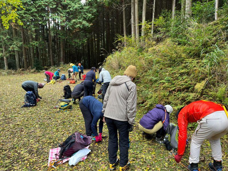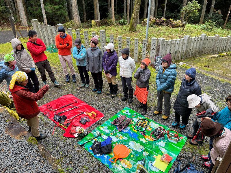 SLのNさんに1時間ほど雪山装備について丁寧に説明してもらったあと、ピッケルの使い方や基本の歩行技術を全員で確認。次に、ザックを担いでアイゼン無し・有りでの歩行を3班に分かれて実践した。