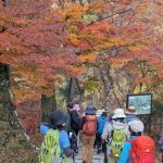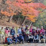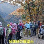 季節外れの暖かさとなった初冬の京都を、残りモミジを求めて高雄から清滝川沿いに嵐山まで歩く。高雄周辺は紅葉も終盤を迎えていたが、嵐山に近づくにつれて鮮やかさが増し、歓声が上がる事もしばしば。清滝川沿いの東海自然歩道は、澄み切った清流の水音を聞きながら、多少足元の悪い岩床をアップダウンしながら楽しく歩く事が出来た。小倉山を越え、保津峡の展望台から行き交う遊覧船や紅葉を眺めた後、賑わう嵐山で解散した(T.N)
